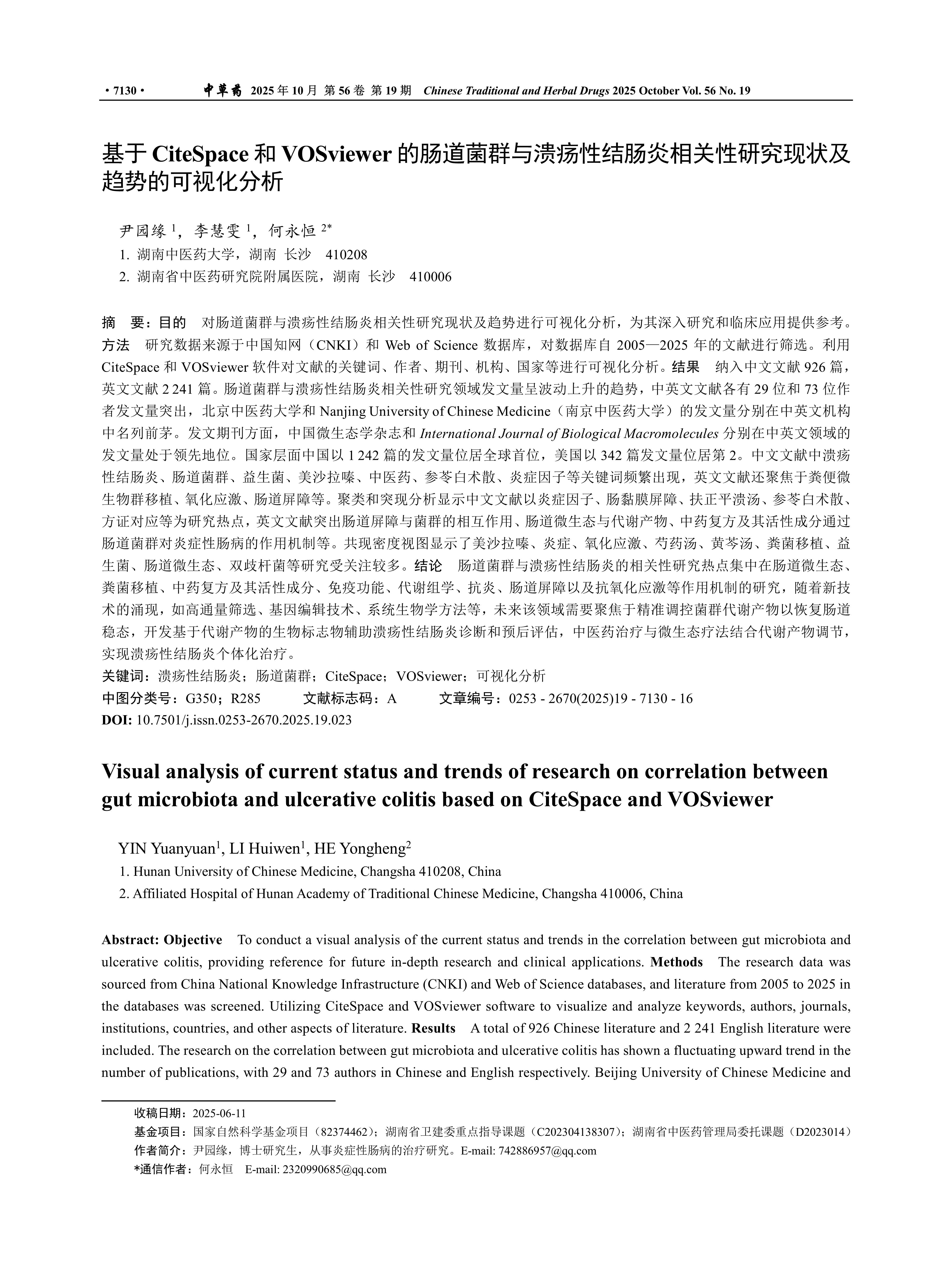 Objective To conduct a visual analysis of the current status and trends in the correlation between gut microbiota and ulcerative colitis, providing reference for future in-depth research and clinical applications. Methods The research data was sourced from China National Knowledge Infrastructure (CNKI) and Web of Science databases, and literature from 2005 to 2025 in the databases was screened. Utilizing CiteSpace and VOSviewer software to visualize and analyze keywords, authors, journals, institutions, countries, and other aspects of literature. Results A total of 926 Chinese literature and 2 241 English literature were included. The research on the correlation between gut microbiota and ulcerative colitis has shown a fluctuating upward trend in the number of publications, with 29 and 73 authors in Chinese and English respectively. Beijing University of Chinese Medicine and Nanjing University of Chinese Medicine rank among the top institutions in both Chinese and English in terms of publication volume. In terms of publishing journals, the Chinese Journal of Microbiology and the International Journal of Biological Macromolecules are leading in terms of publication volume in both Chinese and English. At the national level, China ranks first in the world with 1 242 articles published, while the United States ranks second with 342 articles published. Keywords such as ulcerative colitis, gut microbiota, probiotics, mesalazine, traditional Chinese medicine, Shenling Baizhu San, and inflammatory factors frequently appear in Chinese literature, while English literature also focuses on fecal microbiota transplantation, oxidative stress, intestinal barrier, etc. Cluster and emergent analysis show that Chinese literature focuses on the study of inflammatory factors, intestinal mucosal barrier, Fuzheng Pingkui Tang, Shenling Baizhu San, and corresponding formulas and syndromes. English literature highlights the interaction between intestinal barrier and microbiota, intestinal microbiota and metabolites, and the mechanism of action of traditional Chinese medicine formulas and active ingredients on inflammatory bowel disease through intestinal microbiota. The co-occurrence density view shows that research on mesalazine, inflammation, oxidative stress, Shaoyao Tang, Huangqin Tang, fecal microbiota transplantation, probiotics, gut microbiota, bifidobacteria, and other related topics has received much attention. Conclusion The research hotspots on the correlation between gut microbiota and ulcerative colitis focus on the study of gut microbiota, fecal microbiota transplantation, traditional Chinese medicine formulas and active ingredients, immune function, metabolomics, anti-inflammatory, intestinal barrier, and antioxidant stress mechanisms. With the emergence of new technologies such as high-throughput screening, gene editing techniques, and systems biology methods, this field needs to focus on precise regulation of microbial metabolites to restore intestinal homeostasis, develop biomarkers based on metabolites to assist in the diagnosis and prognosis evaluation of ulcerative colitis, and combine traditional Chinese medicine treatment with microbiota therapy to regulate metabolites and achieve personalized treatment of ulcerative colitis.