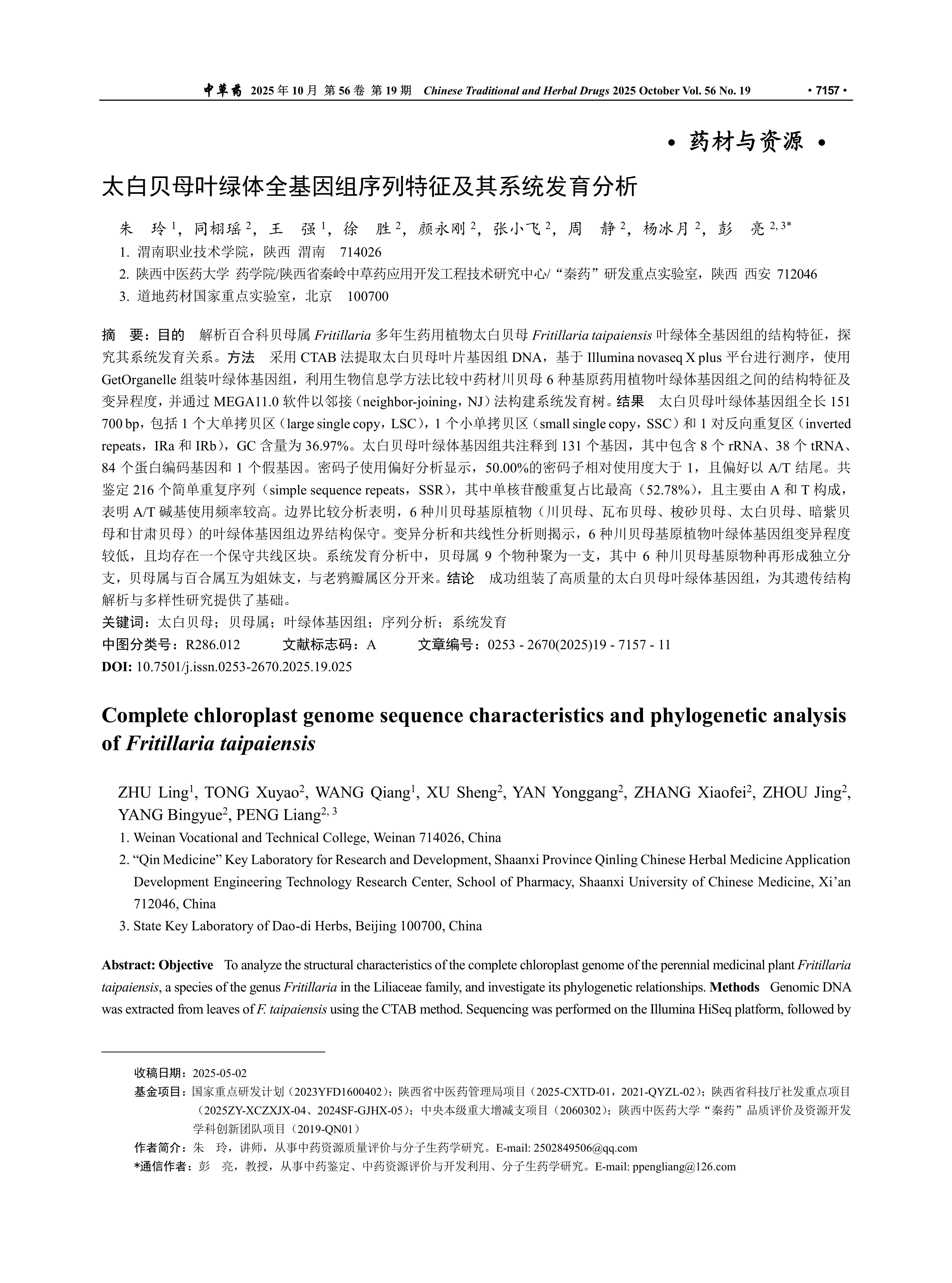 国家重点研发计划(2023YFD1600402);陕西省中医药管理局项目(2025-CXTD-01,2021-QYZL-02);陕西省科技厅社发重点项目(2025ZY-XCZXJX-04、2024SF-GJHX-05);中央本级重大增减支项目(2060302);陕西中医药大学“秦药”品质评价及资源开发学科创新团队项目(2019-QN01)