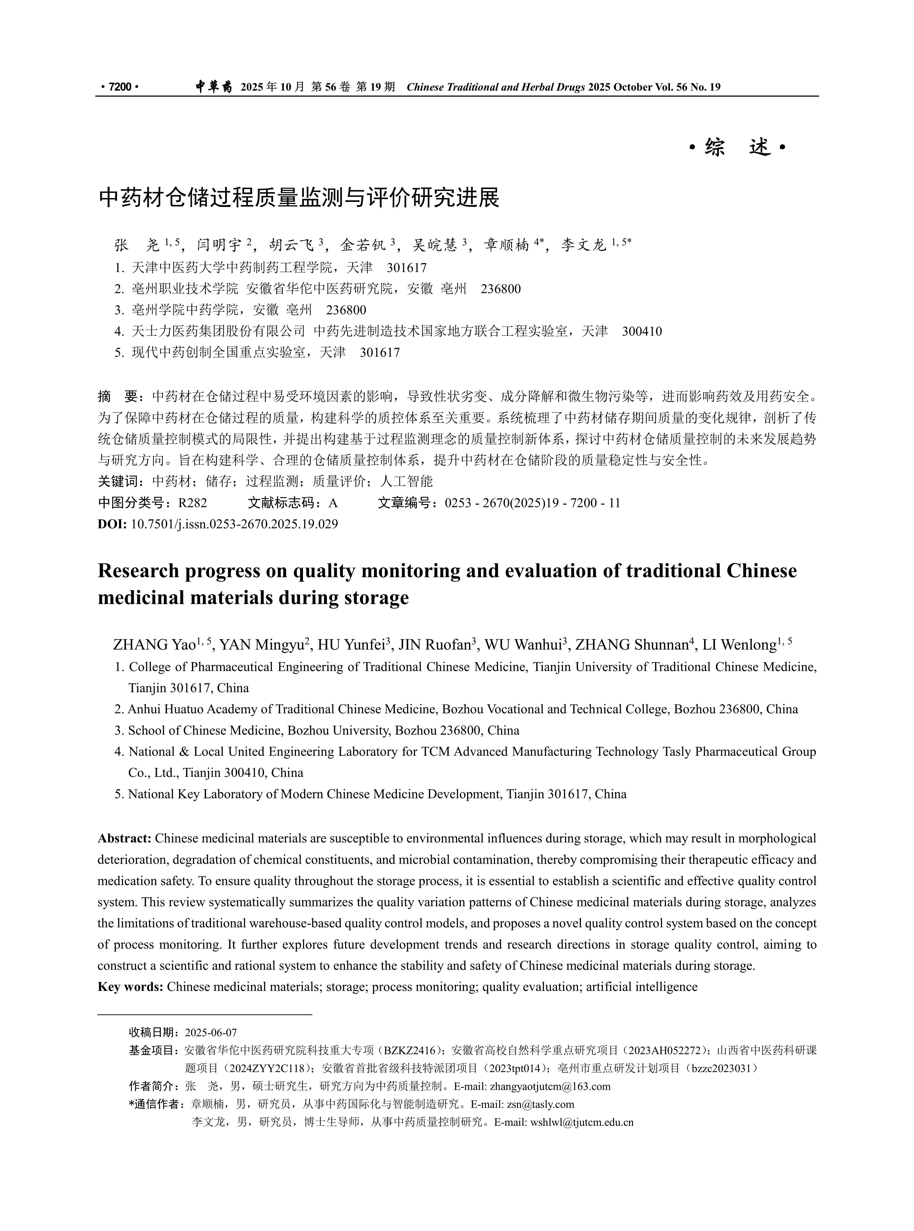 中药材在仓储过程中易受环境因素的影响,导致性状劣变、成分降解和微生物污染等,进而影响药效及用药安全。为了保障中药材在仓储过程的质量,构建科学的质控体系至关重要。系统梳理了中药材储存期间质量的变化规律,剖析了传统仓储质量控制模式的局限性,并提出构建基于过程监测理念的质量控制新体系,探讨中药材仓储质量控制的未来发展趋势与研究方向。旨在构建科学、合理的仓储质量控制体系,提升中药材在仓储阶段的质量稳定性与安全性。