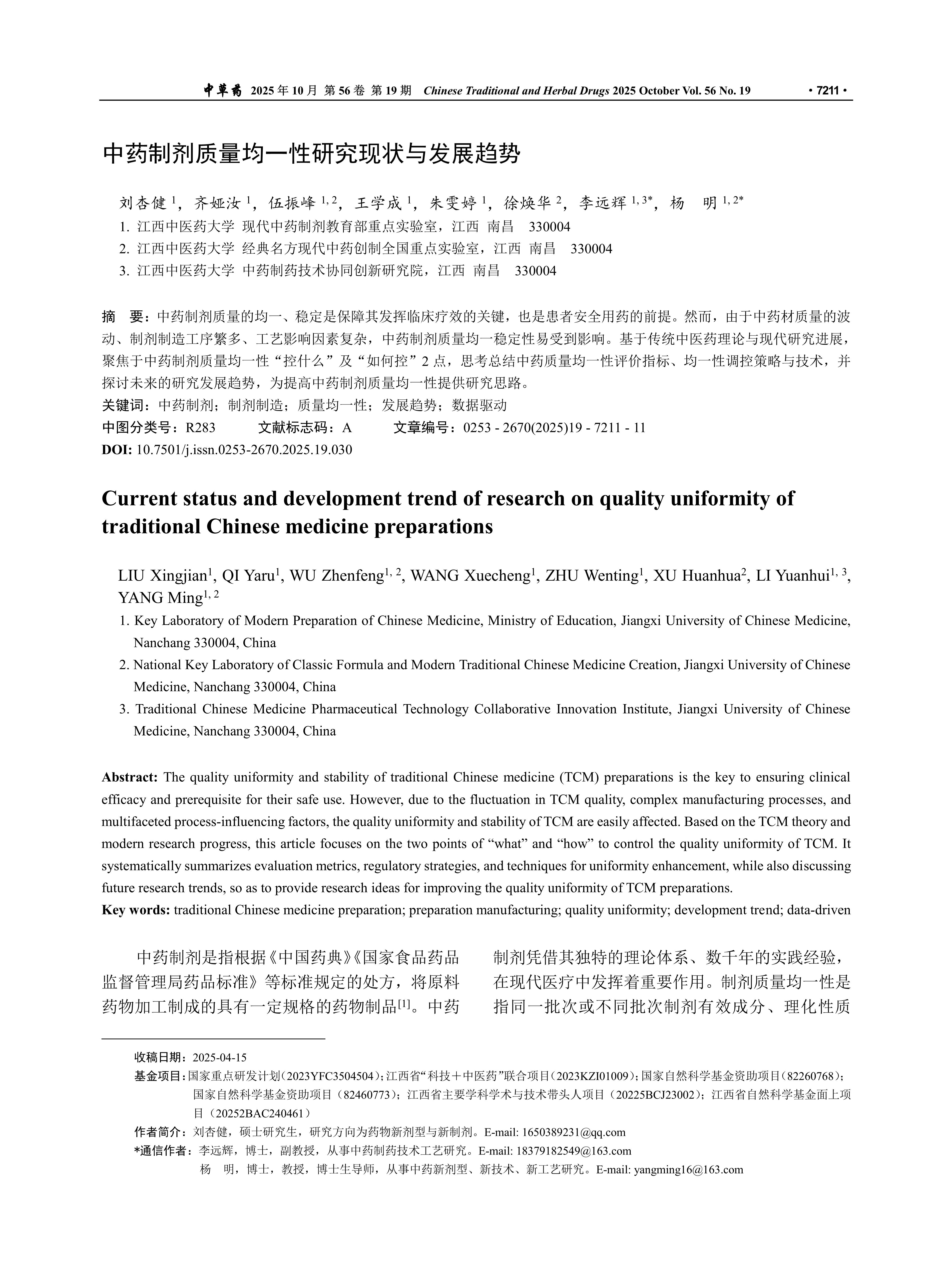 The quality uniformity and stability of traditional Chinese medicine (TCM) preparations is the key to ensuring clinical efficacy and prerequisite for their safe use. However, due to the fluctuation in TCM quality, complex manufacturing processes, and multifaceted process-influencing factors, the quality uniformity and stability of TCM are easily affected. Based on the TCM theory and modern research progress, this article focuses on the two points of “what” and “how” to control the quality uniformity of TCM. It systematically summarizes evaluation metrics, regulatory strategies, and techniques for uniformity enhancement, while also discussing future research trends, so as to provide research ideas for improving the quality uniformity of TCM preparations.