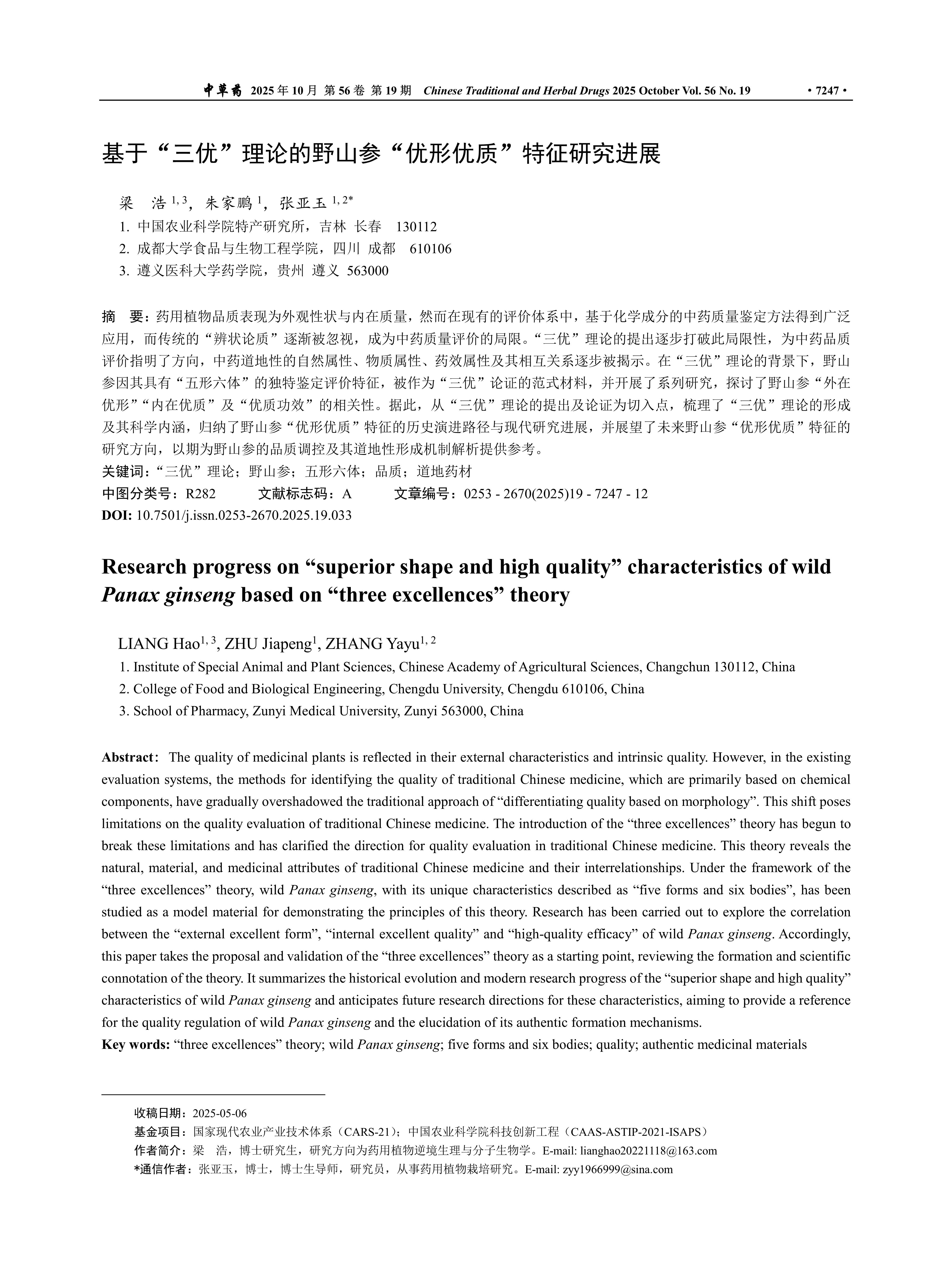 The quality of medicinal plants is reflected in their external characteristics and intrinsic quality. However, in the existing evaluation systems, the methods for identifying the quality of traditional Chinese medicine, which are primarily based on chemical components, have gradually overshadowed the traditional approach of “differentiating quality based on morphology”. This shift poses limitations on the quality evaluation of traditional Chinese medicine. The introduction of the “three excellences” theory has begun to break these limitations and has clarified the direction for quality evaluation in traditional Chinese medicine. This theory reveals the natural, material, and medicinal attributes of traditional Chinese medicine and their interrelationships. Under the framework of the “three excellences” theory, wild Panax ginseng, with its unique characteristics described as “five forms and six bodies”, has been studied as a model material for demonstrating the principles of this theory. Research has been carried out to explore the correlation between the “external excellent form”, “internal excellent quality” and “high-quality efficacy” of wild Panax ginseng. Accordingly, this paper takes the proposal and validation of the “three excellences” theory as a starting point, reviewing the formation and scientific connotation of the theory. It summarizes the historical evolution and modern research progress of the “superior shape and high quality” characteristics of wild Panax ginseng and anticipates future research directions for these characteristics, aiming to provide a reference for the quality regulation of wild Panax ginseng and the elucidation of its authentic formation mechanisms.