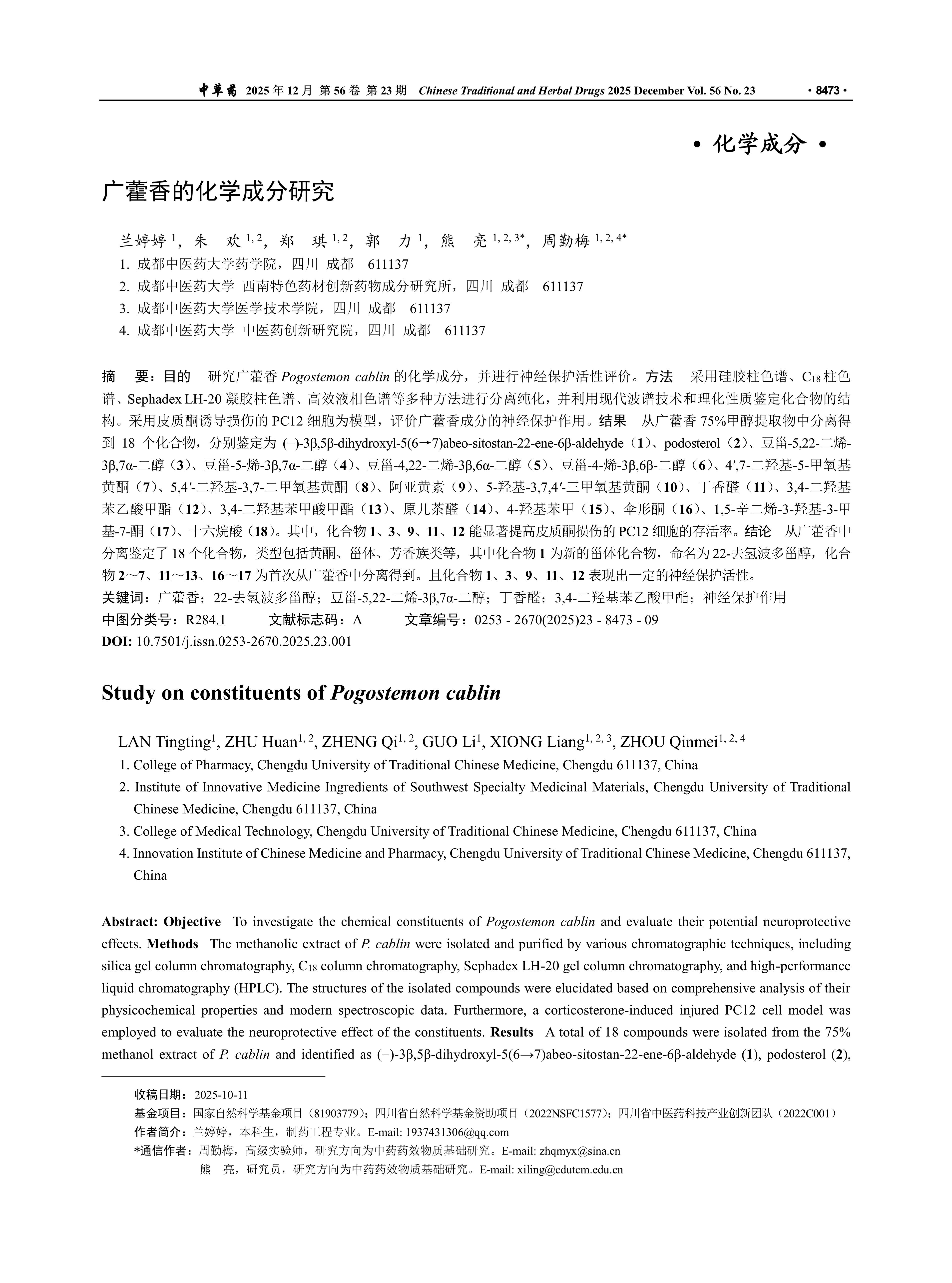 Objective To investigate the chemical constituents of Pogostemon cablin and evaluate their potential neuroprotective effects. Methods The methanolic extract of P. cablin were isolated and purified by various chromatographic techniques, including silica gel column chromatography, C18 column chromatography, Sephadex LH-20 gel column chromatography, and high-performance liquid chromatography (HPLC). The structures of the isolated compounds were elucidated based on comprehensive analysis of their physicochemical properties and modern spectroscopic data. Furthermore, a corticosterone-induced injured PC12 cell model was employed to evaluate the neuroprotective effect of the constituents. Results A total of 18 compounds were isolated from the 75% methanol extract of P. cablin and identified as (-)-3β,5β-dihydroxyl-5(6→7)abeo-sitostan-22-ene-6β-aldehyde (1), podosterol (2), stigmasta-5,22-diene-3β,7α-diol (3), 7α-hydroxysitosterol (4), stigmasta-4,22-diene-3β,6β-diol (5), stigmast-4-ene-3β,6β-diol (6), 4′,7-dihydroxy-5-methoxyflavone (7), 5,4′-dihydroxy-3,7-dimethoxyflavone (8), 5,4′-dihydroxy-3,7,3′-trimethoxyflavon (9), 5-hydroxy-7,3′,4′-trimethoxyflavanone (10), syringaldehyde (11), 3,4-dihydroxyphenylacetic acid methyl ester (12), methyl 3,4-dihydroxybenzoate (13), protocatechuyl aldehyde (14), 4-hydroxybenzaldehyde (15), umbelliferone (16), 1,5-octadien-3-hydroxy-3-methyl-7-one (17), hexadecanoic acid (18). Among these, compounds 1, 3, 9, 11, and 12 significantly enhanced the survival rate of CORT-induced PC12 cells. Conclusion Eighteen compounds were obtained from patchouli, including flavonoids, steroids, aromatic compounds, and others. Notably, compound 1 was identified as a novel steroid, named 22-dehydropodosterol. Additionally, compounds 2—7, 11—13, and 16—17 were reported from P. cablin for the first time. Among all isolated compounds 1, 3, 9, 11, and 12 demonstrated notable neuroprotective activity.
