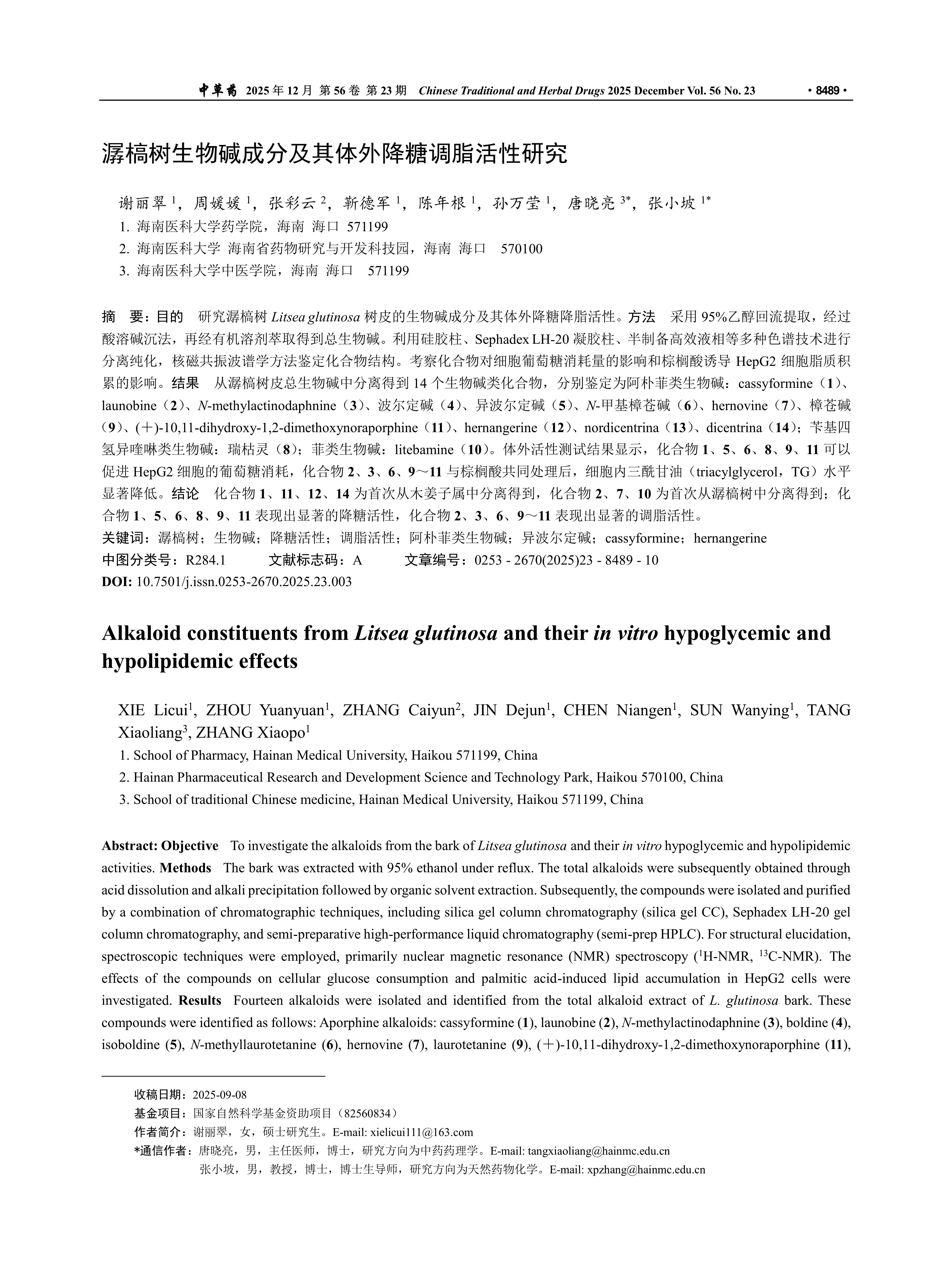 Objective To investigate the alkaloids from the bark of Litsea glutinosa and their in vitro hypoglycemic and hypolipidemic activities. Methods The bark was extracted with 95% ethanol under reflux. The total alkaloids were subsequently obtained through acid dissolution and alkali precipitation followed by organic solvent extraction. Subsequently, the compounds were isolated and purified by a combination of chromatographic techniques, including silica gel column chromatography (silica gel CC), Sephadex LH-20 gel column chromatography, and semi-preparative high-performance liquid chromatography (semi-prep HPLC). For structural elucidation, spectroscopic techniques were employed, primarily nuclear magnetic resonance (NMR) spectroscopy (1H-NMR, 13C-NMR). The effects of the compounds on cellular glucose consumption and palmitic acid-induced lipid accumulation in HepG2 cells were investigated. Results Fourteen alkaloids were isolated and identified from the total alkaloid extract of L. glutinosa bark. These compounds were identified as follows: Aporphine alkaloids: cassyformine (1), launobine (2), N-methylactinodaphnine (3), boldine (4), isoboldine (5), N-methyllaurotetanine (6), hernovine (7), laurotetanine (9), (+)-10,11-dihydroxy-1,2-dimethoxynoraporphine (11), hernangerine (12), nordicentrina (13), and dicentrina (14); benzyltetrahydroisoquinoline alkaloid: reticuline (8); Phenanthrene alkaloid: litebamine (10). The results of in vitro assays showed that compounds 1, 5, 6, 8, 9, and 11 promoted glucose consumption in HepG2 cells, while compounds 2, 3, 6, 9—11 significantly reduced intracellular triglyceride (TG) levels when co-treated with palmitic acid. Conclusion Compounds 1, 11, 12, and 14 were isolated from the genus Litsea for the first time, while compounds 2, 7, and 10 were firstly obtained from Litsea glutinosa. Furthermore, compounds 1, 5, 6, 8, 9, and 11 exhibited significant hypoglycemic activity, and compounds 2, 3, 6, 9—11 showed potent hypolipidemic effects.