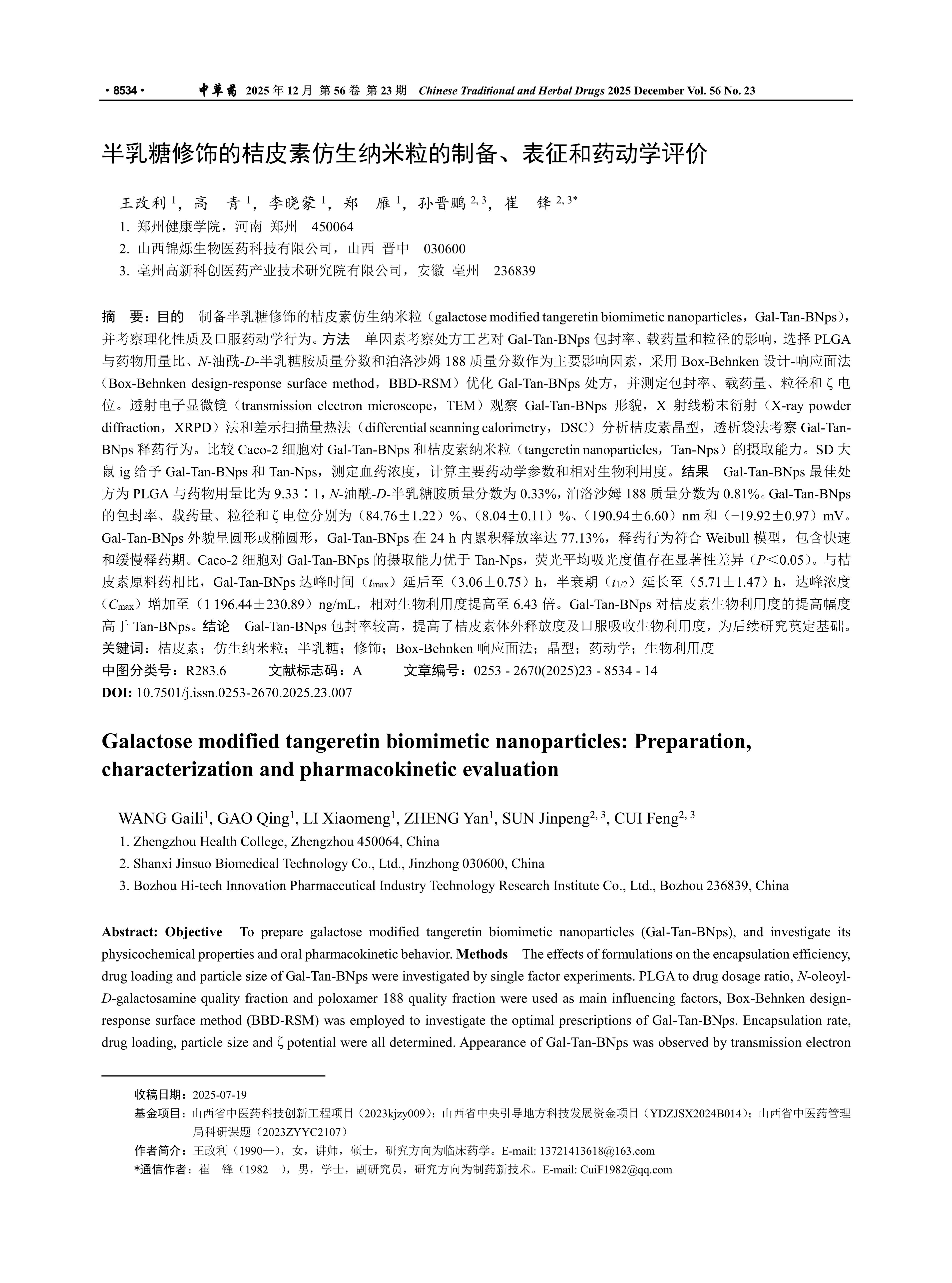 目的 制备半乳糖修饰的桔皮素仿生纳米粒(galactose modified tangeretin biomimetic nanoparticles,Gal-Tan-BNps),并考察理化性质及口服药动学行为。方法 单因素考察处方工艺对Gal-Tan-BNps包封率、载药量和粒径的影响,选择PLGA与药物用量比、N-油酰-D-半乳糖胺质量分数和泊洛沙姆188质量分数作为主要影响因素,采用Box-Behnken设计-响应面法(Box-Behnken design-response surface method,BBD-RSM)优化Gal-Tan-BNps处方,并测定包封率、载药量、粒径和ζ电位。透射电子显微镜(transmission electron microscope,TEM)观察Gal-Tan-BNps形貌,X射线粉末衍射(X-ray powder diffraction,XRPD)法和差示扫描量热法(differential scanning calorimetry,DSC)分析桔皮素晶型,透析袋法考察Gal-Tan-BNps释药行为。比较Caco-2细胞对Gal-Tan-BNps和桔皮素纳米粒(tangeretin nanoparticles,Tan-Nps)的摄取能力。SD大鼠ig给予Gal-Tan-BNps和Tan-Nps,测定血药浓度,计算主要药动学参数和相对生物利用度。结果 Gal-Tan-BNps最佳处方为PLGA与药物用量比为9.33∶1,N-油酰-D-半乳糖胺质量分数为0.33%,泊洛沙姆188质量分数为0.81%。Gal-Tan-BNps的包封率、载药量、粒径和ζ电位分别为(84.76±1.22)%、(8.04±0.11)%、(190.94±6.60)nm和(-19.92±0.97)mV。Gal-Tan-BNps外貌呈圆形或椭圆形,Gal-Tan-BNps在24 h内累积释放率达77.13%,释药行为符合Weibull模型,包含快速和缓慢释药期。Caco-2细胞对Gal-Tan-BNps的摄取能力优于Tan-Nps,荧光平均吸光度值存在显著性差异(P<0.05)。与桔皮素原料药相比,Gal-Tan-BNps达峰时间(tmax)延后至(3.06±0.75)h,半衰期(t1/2)延长至(5.71±1.47)h,达峰浓度(Cmax)增加至(1 196.44±230.89)ng/mL,相对生物利用度提高至6.43倍。Gal-Tan-BNps对桔皮素生物利用度的提高幅度高于Tan-BNps。结论 Gal-Tan-BNps包封率较高,提高了桔皮素体外释放度及口服吸收生物利用度,为后续研究奠定基础。