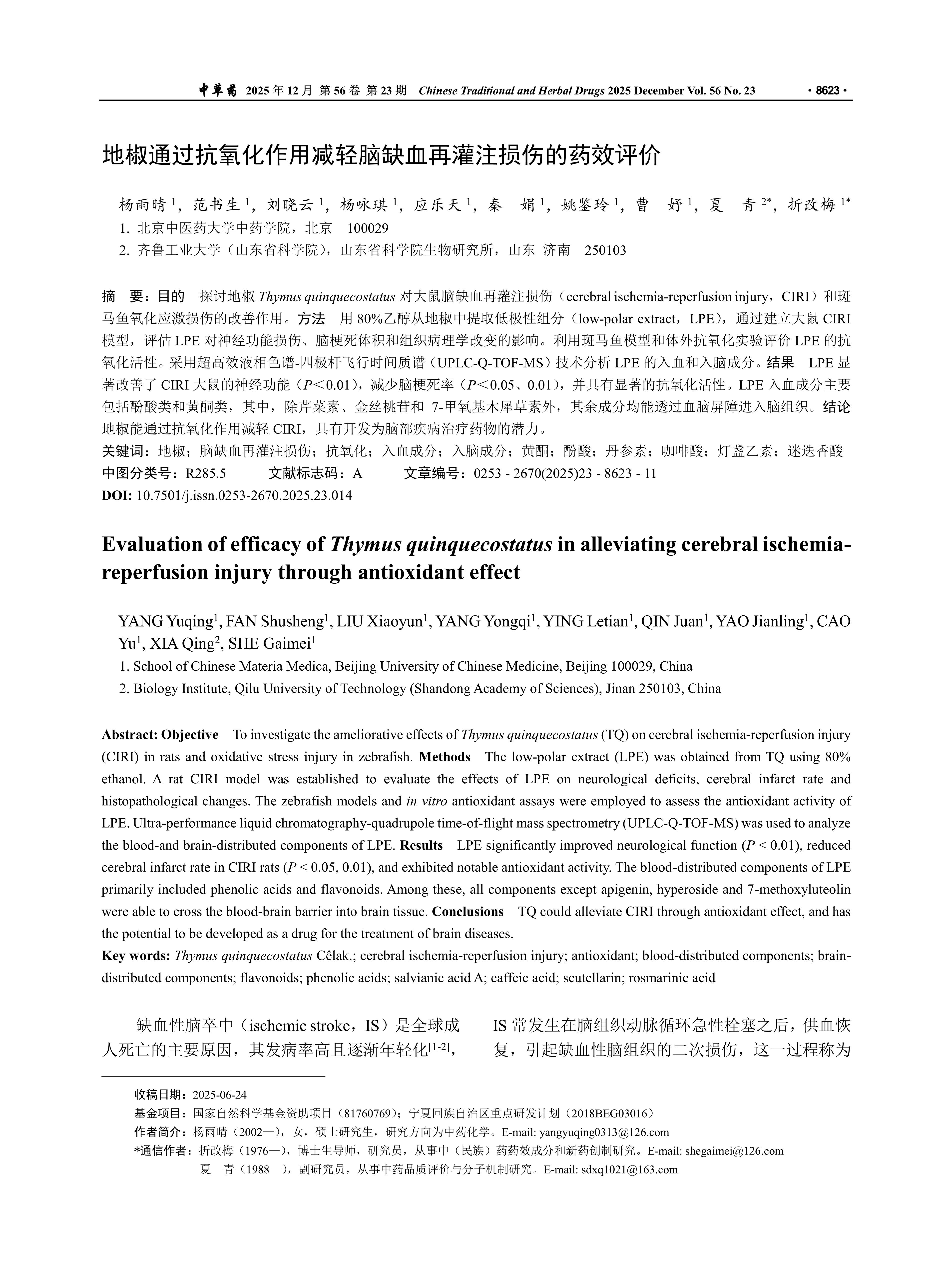 Objective To investigate the ameliorative effects of Thymus quinquecostatus (TQ) on cerebral ischemia-reperfusion injury (CIRI) in rats and oxidative stress injury in zebrafish. Methods The low-polar extract (LPE) was obtained from TQ using 80% ethanol. A rat CIRI model was established to evaluate the effects of LPE on neurological deficits, cerebral infarct rate and histopathological changes. The zebrafish models and in vitro antioxidant assays were employed to assess the antioxidant activity of LPE. Ultra-performance liquid chromatography-quadrupole time-of-flight mass spectrometry (UPLC-Q-TOF-MS) was used to analyze the blood-and brain-distributed components of LPE. Results LPE significantly improved neurological function (P < 0.01), reduced cerebral infarct rate in CIRI rats (P < 0.05, 0.01), and exhibited notable antioxidant activity. The blood-distributed components of LPE primarily included phenolic acids and flavonoids. Among these, all components except apigenin, hyperoside and 7-methoxyluteolin were able to cross the blood-brain barrier into brain tissue. Conclusions TQ could alleviate CIRI through antioxidant effect, and has the potential to be developed as a drug for the treatment of brain diseases.