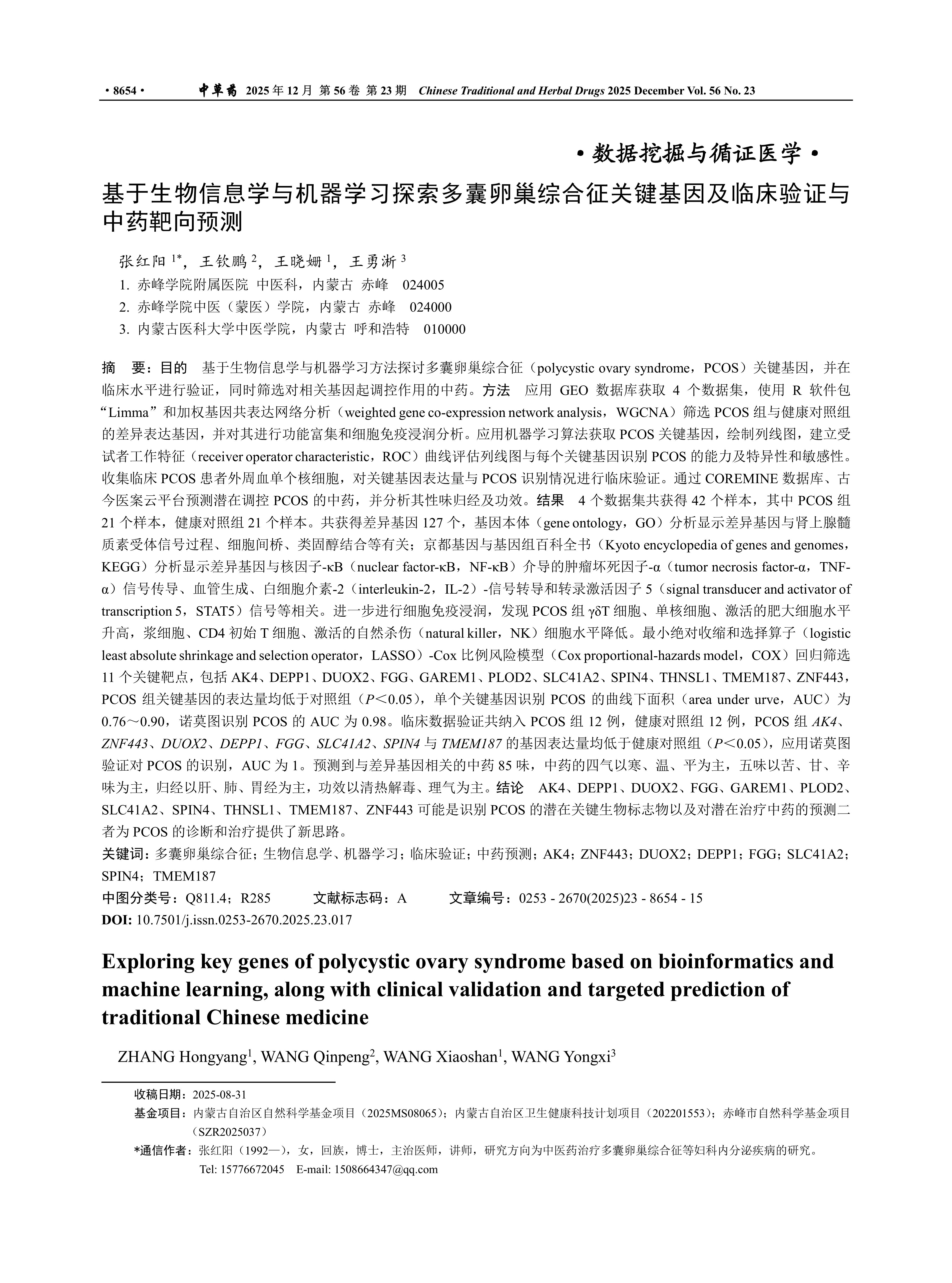 目的 基于生物信息学与机器学习方法探讨多囊卵巢综合征(polycystic ovary syndrome,PCOS)关键基因,并在临床水平进行验证,同时筛选对相关基因起调控作用的中药。方法 应用GEO数据库获取4个数据集,使用R软件包“Limma”和加权基因共表达网络分析(weighted gene co-expression network analysis,WGCNA)筛选PCOS组与健康对照组的差异表达基因,并对其进行功能富集和细胞免疫浸润分析。应用机器学习算法获取PCOS关键基因,绘制列线图,建立受试者工作特征(receiver operator characteristic,ROC)曲线评估列线图与每个关键基因识别PCOS的能力及特异性和敏感性。收集临床PCOS患者外周血单个核细胞,对关键基因表达量与PCOS识别情况进行临床验证。通过COREMINE数据库、古今医案云平台预测潜在调控PCOS的中药,并分析其性味归经及功效。结果 4个数据集共获得42个样本,其中PCOS组21个样本,健康对照组21个样本。共获得差异基因127个,基因本体(gene ontology,GO)分析显示差异基因与肾上腺髓质素受体信号过程、细胞间桥、类固醇结合等有关;京都基因与基因组百科全书(Kyoto encyclopedia of genes and genomes,KEGG)分析显示差异基因与核因子-κB(nuclear factor-κB,NF-κB)介导的肿瘤坏死因子-α(tumor necrosis factor-α,TNF-α)信号传导、血管生成、白细胞介素-2(interleukin-2,IL-2)-信号转导和转录激活因子5(signal transducer and activator of transcription 5,STAT5)信号等相关。进一步进行细胞免疫浸润,发现PCOS组γδT细胞、单核细胞、激活的肥大细胞水平升高,浆细胞、CD4初始T细胞、激活的自然杀伤(natural killer,NK)细胞水平降低。最小绝对收缩和选择算子(logistic least absolute shrinkage and selection operator,LASSO)-Cox比例风险模型(Cox proportional-hazards model,COX)回归筛选11个关键靶点,包括AK4、DEPP1、DUOX2、FGG、GAREM1、PLOD2、SLC41A2、SPIN4、THNSL1、TMEM187、ZNF443,PCOS组关键基因的表达量均低于对照组(P<0.05),单个关键基因识别PCOS的曲线下面积(area under urve,AUC)为0.76~0.90,诺莫图识别PCOS的AUC为0.98。临床数据验证共纳入PCOS组12例,健康对照组12例,PCOS组AK4、ZNF443、DUOX2、DEPP1、FGG、SLC41A2、SPIN4与TMEM187的基因表达量均低于健康对照组(P<0.05),应用诺莫图验证对PCOS的识别,AUC为1。预测到与差异基因相关的中药85味,中药的四气以寒、温、平为主,五味以苦、甘、辛味为主,归经以肝、肺、胃经为主,功效以清热解毒、理气为主。结论 AK4、DEPP1、DUOX2、FGG、GAREM1、PLOD2、SLC41A2、SPIN4、THNSL1、TMEM187、ZNF443可能是识别PCOS的潜在关键生物标志物以及对潜在治疗中药的预测二者为PCOS的诊断和治疗提供了新思路。