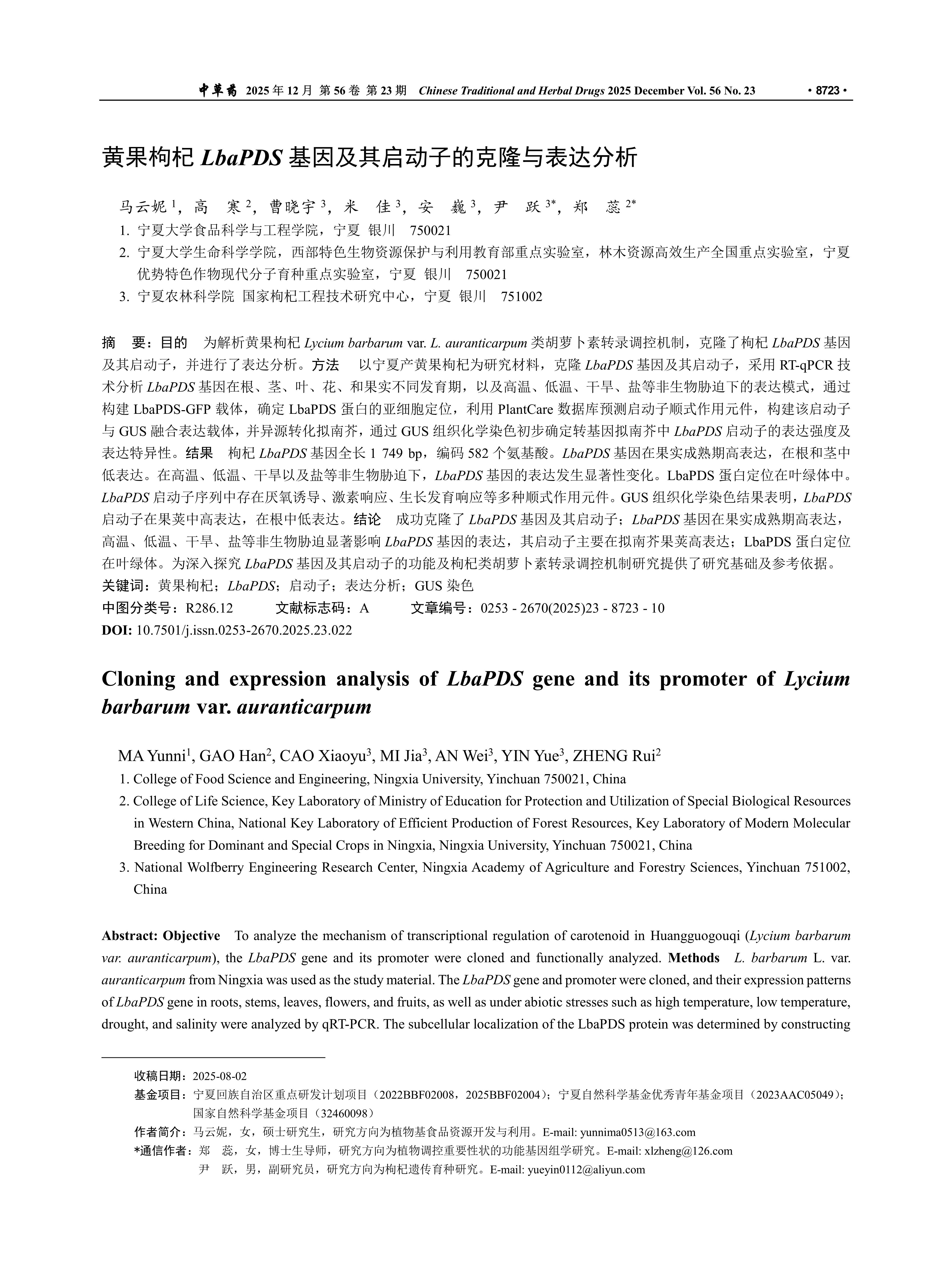 Cloning and expression analysis of LbaPDS gene and its promoter of Lycium barbarum var. auranticarpum