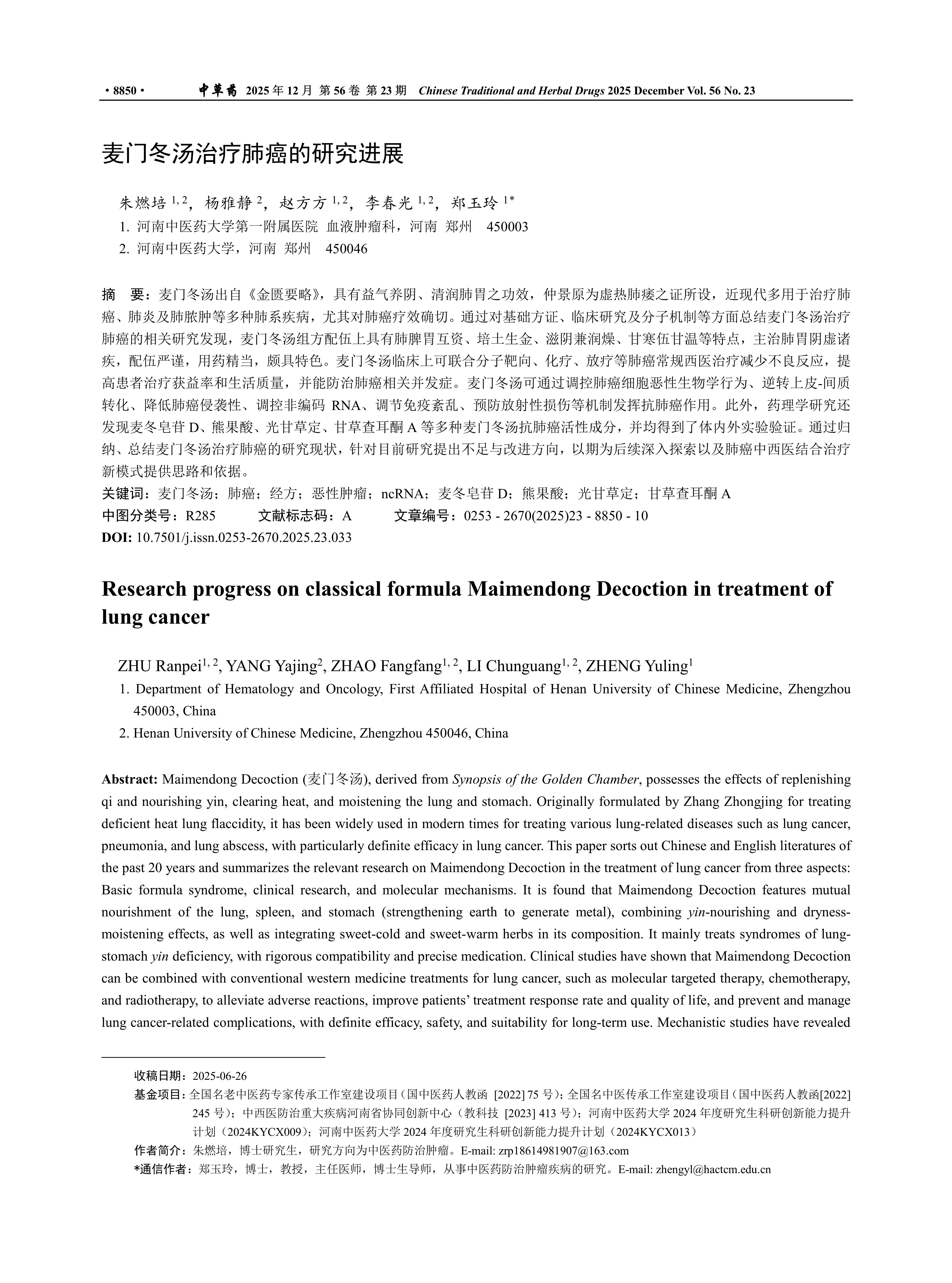 Maimendong Decoction (麦门冬汤), derived from Synopsis of the Golden Chamber, possesses the effects of replenishing qi and nourishing yin, clearing heat, and moistening the lung and stomach. Originally formulated by Zhang Zhongjing for treating deficient heat lung flaccidity, it has been widely used in modern times for treating various lung-related diseases such as lung cancer, pneumonia, and lung abscess, with particularly definite efficacy in lung cancer. This paper sorts out Chinese and English literatures of the past 20 years and summarizes the relevant research on Maimendong Decoction in the treatment of lung cancer from three aspects: Basic formula syndrome, clinical research, and molecular mechanisms. It is found that Maimendong Decoction features mutual nourishment of the lung, spleen, and stomach (strengthening earth to generate metal), combining yin-nourishing and dryness-moistening effects, as well as integrating sweet-cold and sweet-warm herbs in its composition. It mainly treats syndromes of lung-stomach yin deficiency, with rigorous compatibility and precise medication. Clinical studies have shown that Maimendong Decoction can be combined with conventional western medicine treatments for lung cancer, such as molecular targeted therapy, chemotherapy, and radiotherapy, to alleviate adverse reactions, improve patients’ treatment response rate and quality of life, and prevent and manage lung cancer-related complications, with definite efficacy, safety, and suitability for long-term use. Mechanistic studies have revealed that Maimendong Decoction exerts anti-lung cancer effects by regulating the malignant biological behavior of lung cancer cells, reversing epithelial-mesenchymal transition (EMT), reducing lung cancer invasiveness, regulating non-coding RNAs, modulating immune disorders, and preventing radiation-induced injury, with clear molecular mechanisms. Furthermore, pharmacological studies have identified multiple anti-lung cancer active components in Maimendong Decoction, such as ophiopogonin D, ursolic acid, glabridin, and licorice chalcone A, which have been validated by in vivo and in vitro experiments. Through literature induction, this paper comprehensively and elaborately expounds the research status of Maimendong Decoction in treating lung cancer, points out the deficiencies and improvements of current research, and aims to provide ideas and evidence for the subsequent in-depth exploration of this formula and the new model of integrated traditional Chinese and Western medicine treatment for lung cancer.