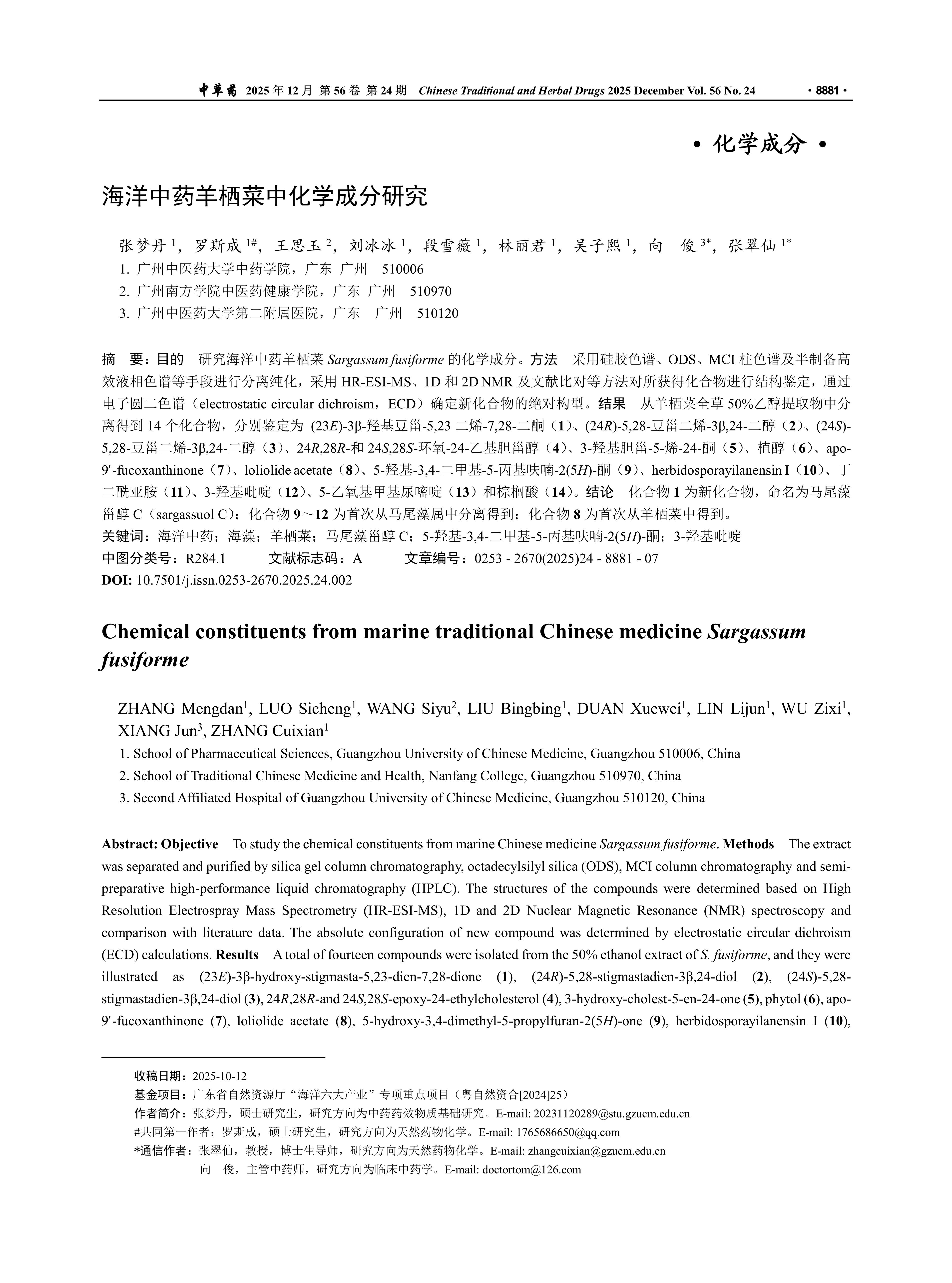 目的 研究海洋中药羊栖菜Sargassum fusiforme的化学成分。方法 采用硅胶色谱、ODS、MCI柱色谱及半制备高效液相色谱等手段进行分离纯化,采用HR-ESI-MS、1D和2D NMR及文献比对等方法对所获得化合物进行结构鉴定,通过电子圆二色谱(electrostatic circular dichroism,ECD)确定新化合物的绝对构型。结果 从羊栖菜全草50%乙醇提取物中分离得到14个化合物,分别鉴定为 (23E)-3β-羟基豆甾-5,23二烯-7,28-二酮(1)、(24R)-5,28-豆甾二烯-3β,24-二醇(2)、(24S)-5,28-豆甾二烯-3β,24-二醇(3)、24R,28R-和24S,28S-环氧-24-乙基胆甾醇(4)、3-羟基胆甾-5-烯-24-酮(5)、植醇(6)、apo-9¢-fucoxanthinone(7)、loliolide acetate(8)、5-羟基-3,4-二甲基-5-丙基呋喃-2(5H)-酮(9)、herbidosporayilanensin I(10)、丁二酰亚胺(11)、3-羟基吡啶(12)、5-乙氧基甲基尿嘧啶(13)和棕榈酸(14)。结论 化合物1为新化合物,命名为马尾藻甾醇C(sargassuol C);化合物9~12为首次从马尾藻属中分离得到;化合物8为首次从羊栖菜中得到。