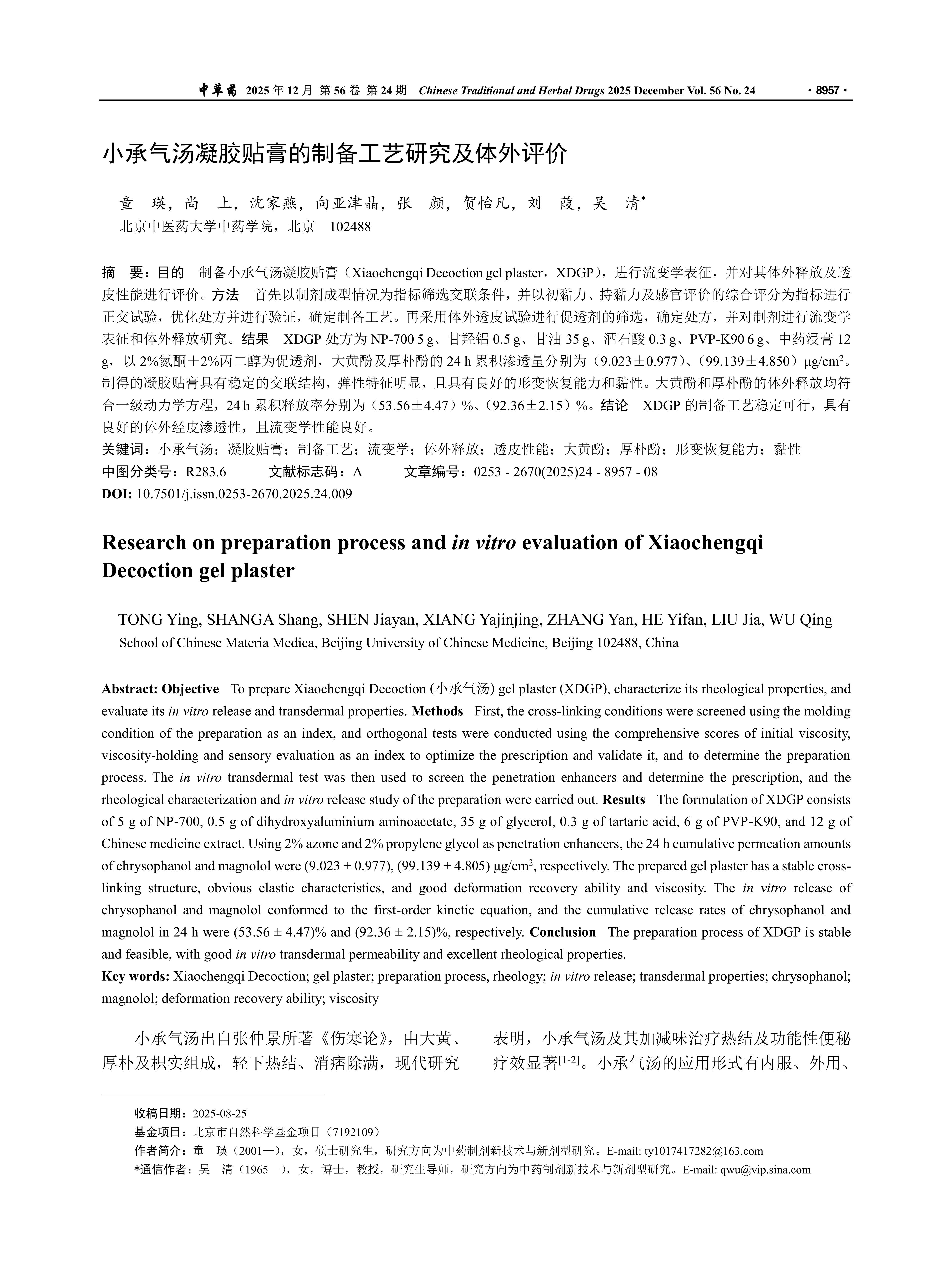 Objective To prepare Xiaochengqi Decoction (小承气汤) gel plaster (XDGP), characterize its rheological properties, and evaluate its in vitro release and transdermal properties. Methods First, the cross-linking conditions were screened using the molding condition of the preparation as an index, and orthogonal tests were conducted using the comprehensive scores of initial viscosity, viscosity-holding and sensory evaluation as an index to optimize the prescription and validate it, and to determine the preparation process. The in vitro transdermal test was then used to screen the penetration enhancers and determine the prescription, and the rheological characterization and in vitro release study of the preparation were carried out. Results The formulation of XDGP consists of 5 g of NP-700, 0.5 g of dihydroxyaluminium aminoacetate, 35 g of glycerol, 0.3 g of tartaric acid, 6 g of PVP-K90, and 12 g of Chinese medicine extract. Using 2% azone and 2% propylene glycol as penetration enhancers, the 24 h cumulative permeation amounts of chrysophanol and magnolol were (9.023 ±0.977), (99.139 ±4.805) μg/cm2, respectively. The prepared gel plaster has a stable cross-linking structure, obvious elastic characteristics, and good deformation recovery ability and viscosity. The in vitro release of chrysophanol and magnolol conformed to the first-order kinetic equation, and the cumulative release rates of chrysophanol and magnolol in 24 h were (53.56 ±4.47)% and (92.36 ±2.15)%, respectively. Conclusion The preparation process of XDGP is stable and feasible, with good in vitro transdermal permeability and excellent rheological properties.