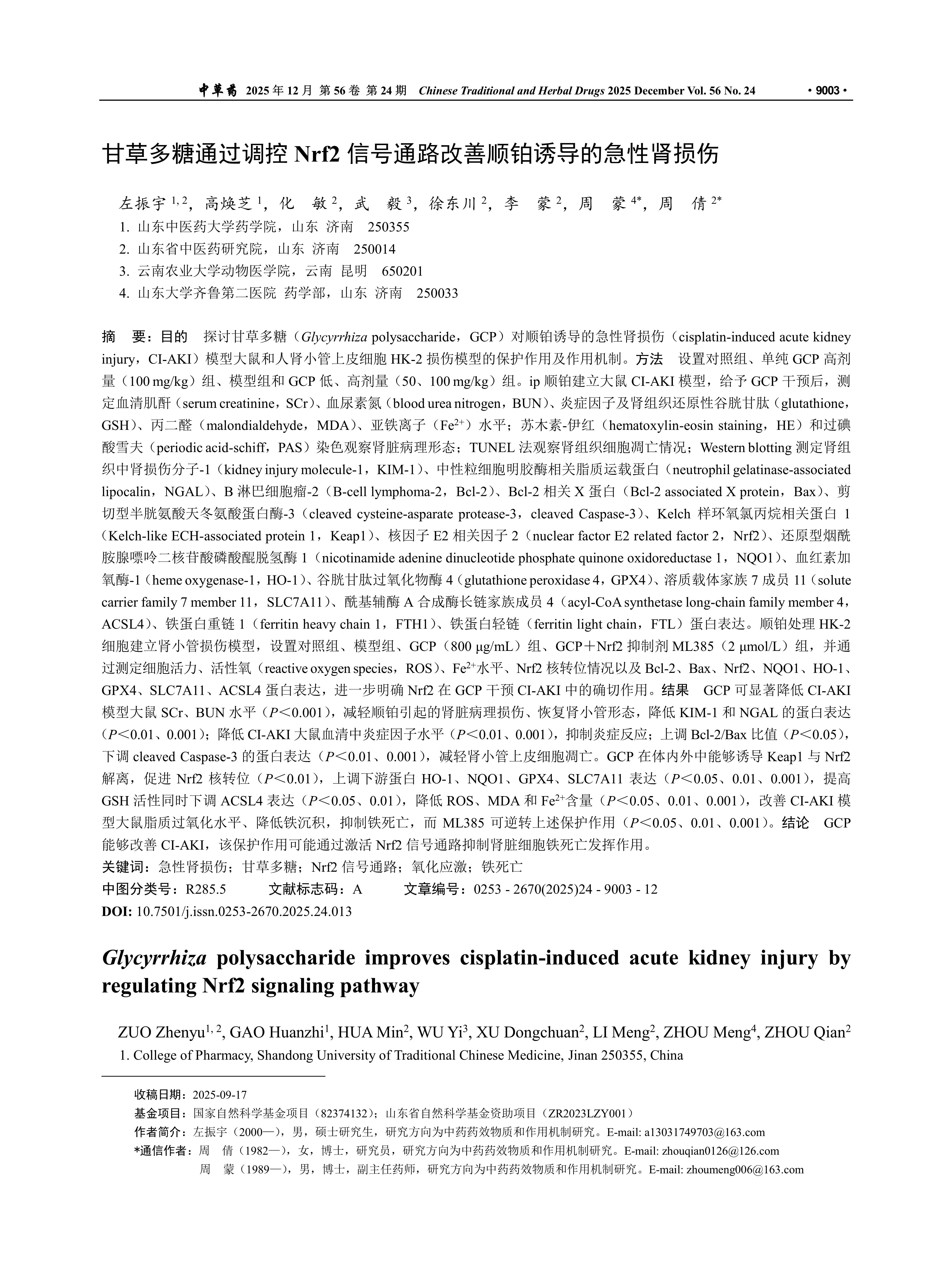 目的 探讨甘草多糖(Glycyrrhiza polysaccharide,GCP)对顺铂诱导的急性肾损伤(cisplatin-induced acute kidney injury,CI-AKI)模型大鼠和人肾小管上皮细胞HK-2损伤模型的保护作用及作用机制。方法 设置对照组、单纯GCP高剂量(100 mg/kg)组、模型组和GCP低、高剂量(50、100 mg/kg)组。ip顺铂建立大鼠CI-AKI模型,给予GCP干预后,测定血清肌酐(serum creatinine,SCr)、血尿素氮(blood urea nitrogen,BUN)、炎症因子及肾组织还原性谷胱甘肽(glutathione,GSH)、丙二醛(malondialdehyde,MDA)、亚铁离子(Fe2+)水平;苏木素-伊红(hematoxylin-eosin staining,HE)和过碘酸雪夫(periodic acid-schiff,PAS)染色观察肾脏病理形态;TUNEL法观察肾组织细胞凋亡情况;Western blotting测定肾组织中肾损伤分子-1(kidney injury molecule-1,KIM-1)、中性粒细胞明胶酶相关脂质运载蛋白(neutrophil gelatinase-associated lipocalin,NGAL)、B淋巴细胞瘤-2(B-cell lymphoma-2,Bcl-2)、Bcl-2相关X蛋白(Bcl-2 associated X protein,Bax)、剪切型半胱氨酸天冬氨酸蛋白酶-3(cleaved cysteine-asparate protease-3,cleaved Caspase-3)、Kelch样环氧氯丙烷相关蛋白1(Kelch-like ECH-associated protein 1,Keap1)、核因子E2相关因子2(nuclear factor E2 related factor 2,Nrf2)、还原型烟酰胺腺嘌呤二核苷酸磷酸醌脱氢酶1(nicotinamide adenine dinucleotide phosphate quinone oxidoreductase 1,NQO1)、血红素加氧酶-1(heme oxygenase-1,HO-1)、谷胱甘肽过氧化物酶4(glutathione peroxidase 4,GPX4)、溶质载体家族7成员11(solute carrier family 7 member 11,SLC7A11)、酰基辅酶A合成酶长链家族成员4(acyl-CoA synthetase long-chain family member 4,ACSL4)、铁蛋白重链1(ferritin heavy chain 1,FTH1)、铁蛋白轻链(ferritin light chain,FTL)蛋白表达。顺铂处理HK-2细胞建立肾小管损伤模型,设置对照组、模型组、GCP(800 μg/mL)组、GCP+Nrf2抑制剂ML385(2 μmol/L)组,并通过测定细胞活力、活性氧(reactive oxygen species,ROS)、Fe2+水平、Nrf2核转位情况以及Bcl-2、Bax、Nrf2、NQO1、HO-1、GPX4、SLC7A11、ACSL4蛋白表达,进一步明确Nrf2在GCP干预CI-AKI中的确切作用。结果 GCP可显著降低CI-AKI模型大鼠SCr、BUN水平(P<0.001),减轻顺铂引起的肾脏病理损伤、恢复肾小管形态,降低KIM-1和NGAL的蛋白表达(P<0.01、0.001);降低CI-AKI大鼠血清中炎症因子水平(P<0.01、0.001),抑制炎症反应;上调Bcl-2/Bax比值(P<0.05),下调cleaved Caspase-3的蛋白表达(P<0.01、0.001),减轻肾小管上皮细胞凋亡。GCP在体内外中能够诱导Keap1与Nrf2解离,促进Nrf2核转位(P<0.01),上调下游蛋白HO-1、NQO1、GPX4、SLC7A11表达(P<0.05、0.01、0.001),提高GSH活性同时下调ACSL4表达(P<0.05、0.01),降低ROS、MDA和Fe2+含量(P<0.05、0.01、0.001),改善CI-AKI模型大鼠脂质过氧化水平、降低铁沉积,抑制铁死亡,而ML385可逆转上述保护作用(P<0.05、0.01、0.001)。结论 GCP能够改善CI-AKI,该保护作用可能通过激活Nrf2信号通路抑制肾脏细胞铁死亡发挥作用。