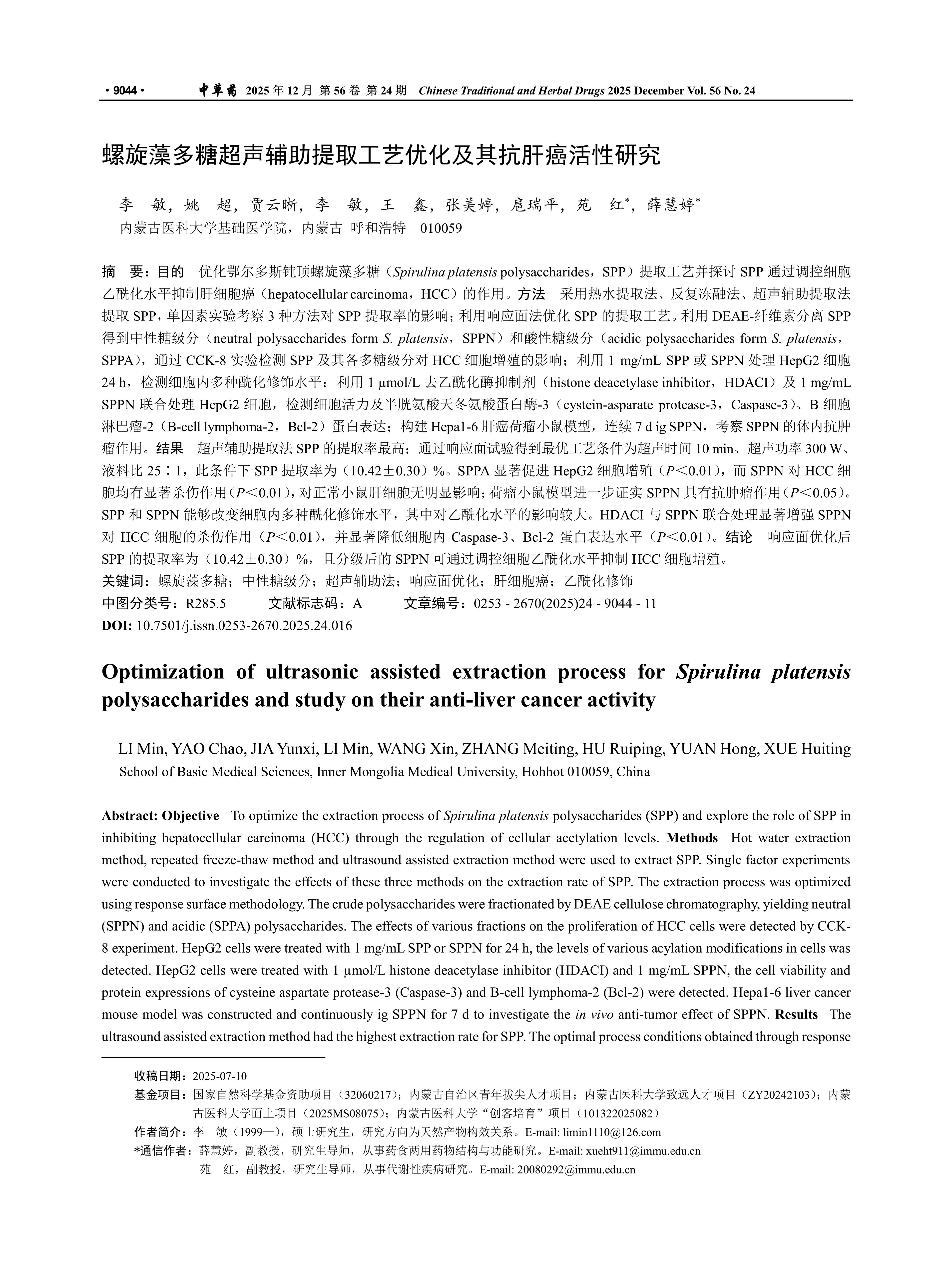 目的 优化鄂尔多斯钝顶螺旋藻多糖(Spirulina platensis polysaccharides,SPP)提取工艺并探讨SPP通过调控细胞乙酰化水平抑制肝细胞癌(hepatocellular carcinoma,HCC)的作用。方法 采用热水提取法、反复冻融法、超声辅助提取法提取SPP,单因素实验考察3种方法对SPP提取率的影响;利用响应面法优化SPP的提取工艺。利用DEAE-纤维素分离SPP得到中性糖级分(neutral polysaccharides form S. platensis,SPPN)和酸性糖级分(acidic polysaccharides form S. platensis,SPPA),通过CCK-8实验检测SPP及其各多糖级分对HCC细胞增殖的影响;利用1 mg/mL SPP或SPPN处理HepG2细胞24 h,检测细胞内多种酰化修饰水平;利用1 µmol/L去乙酰化酶抑制剂(histone deacetylase inhibitor,HDACI)及1 mg/mL SPPN联合处理HepG2细胞,检测细胞活力及半胱氨酸天冬氨酸蛋白酶-3(cystein-asparate protease-3,Caspase-3)、B细胞淋巴瘤-2(B-cell lymphoma-2,Bcl-2)蛋白表达;构建Hepa1-6肝癌荷瘤小鼠模型,连续7 d ig SPPN,考察SPPN的体内抗肿瘤作用。结果 超声辅助提取法SPP的提取率最高;通过响应面试验得到最优工艺条件为超声时间10 min、超声功率300 W、液料比25∶1,此条件下SPP提取率为(10.42±0.30)%。SPPA显著促进HepG2细胞增殖(P<0.01),而SPPN对HCC细胞均有显著杀伤作用(P<0.01),对正常小鼠肝细胞无明显影响;荷瘤小鼠模型进一步证实SPPN具有抗肿瘤作用(P<0.05)。SPP和SPPN能够改变细胞内多种酰化修饰水平,其中对乙酰化水平的影响较大。HDACI与SPPN联合处理显著增强SPPN对HCC细胞的杀伤作用(P<0.01),并显著降低细胞内Caspase-3、Bcl-2蛋白表达水平(P<0.01)。结论 响应面优化后SPP的提取率为(10.42±0.30)%,且分级后的SPPN可通过调控细胞乙酰化水平抑制HCC细胞增殖。