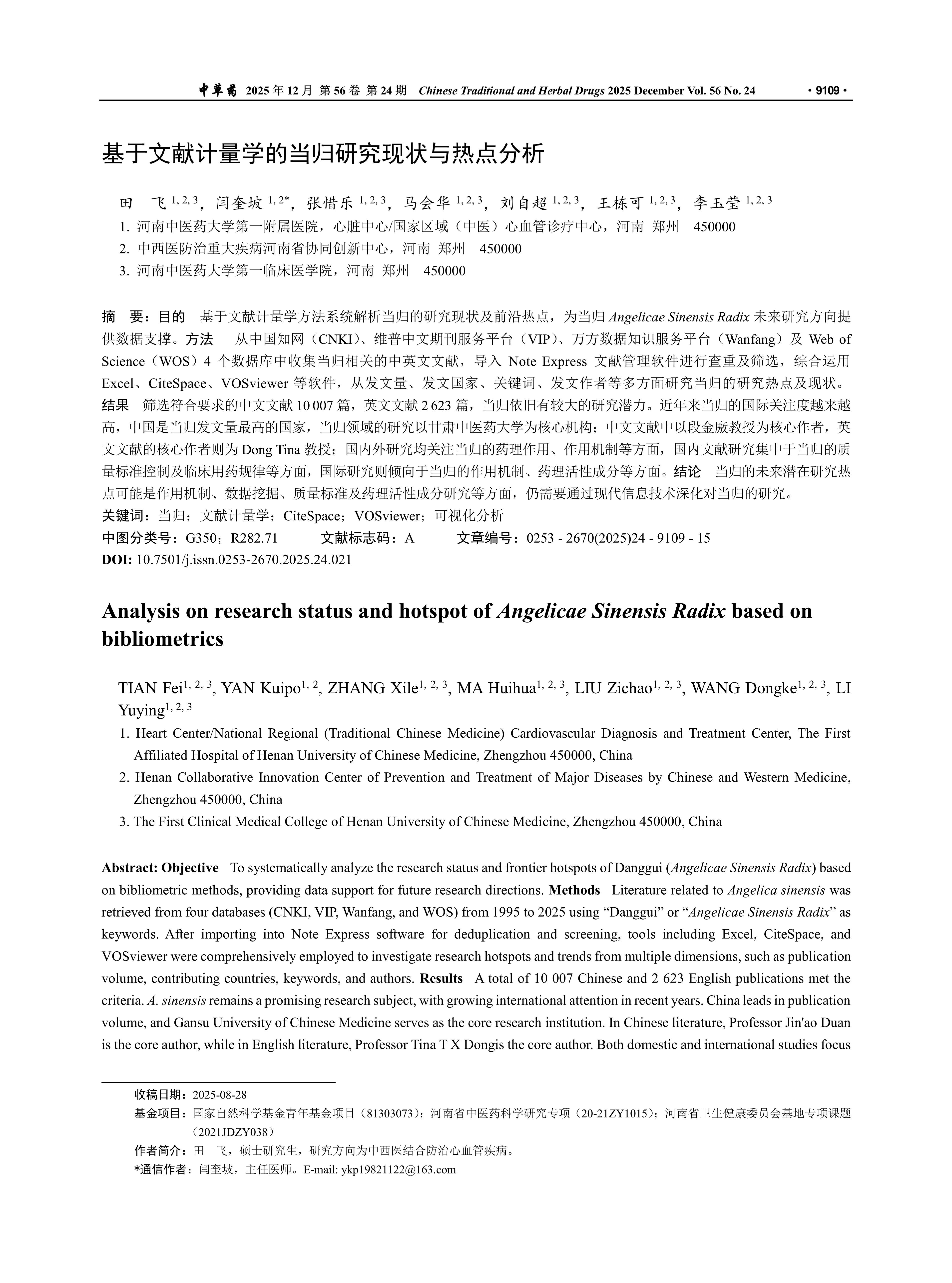 Objective To systematically analyze the research status and frontier hotspots of Danggui (Angelicae Sinensis Radix) based on bibliometric methods, providing data support for future research directions. Methods Literature related to Angelica sinensis was retrieved from four databases (CNKI, VIP, Wanfang, and WOS) from 1995 to 2025 using “Danggui” or “Angelicae Sinensis Radix” as keywords. After importing into Note Express software for deduplication and screening, tools including Excel, CiteSpace, and VOSviewer were comprehensively employed to investigate research hotspots and trends from multiple dimensions, such as publication volume, contributing countries, keywords, and authors. Results A total of 10 007 Chinese and 2 623 English publications met the criteria. A. sinensis remains a promising research subject, with growing international attention in recent years. China leads in publication volume, and Gansu University of Chinese Medicine serves as the core research institution. In Chinese literature, Professor Jin'ao Duan is the core author, while in English literature, Professor Tina T X Dongis the core author. Both domestic and international studies focus on pharmacological effects and mechanisms. Chinese literature emphasizes quality standard control and clinical application patterns, while international research prioritizes mechanisms of action and bioactive components. Conclusion Future research hotspots may include mechanisms of action, data mining, quality standards, and pharmacological constituents. Further advancement through modern information technology is essential to deepen the understanding of Angelica sinensis.