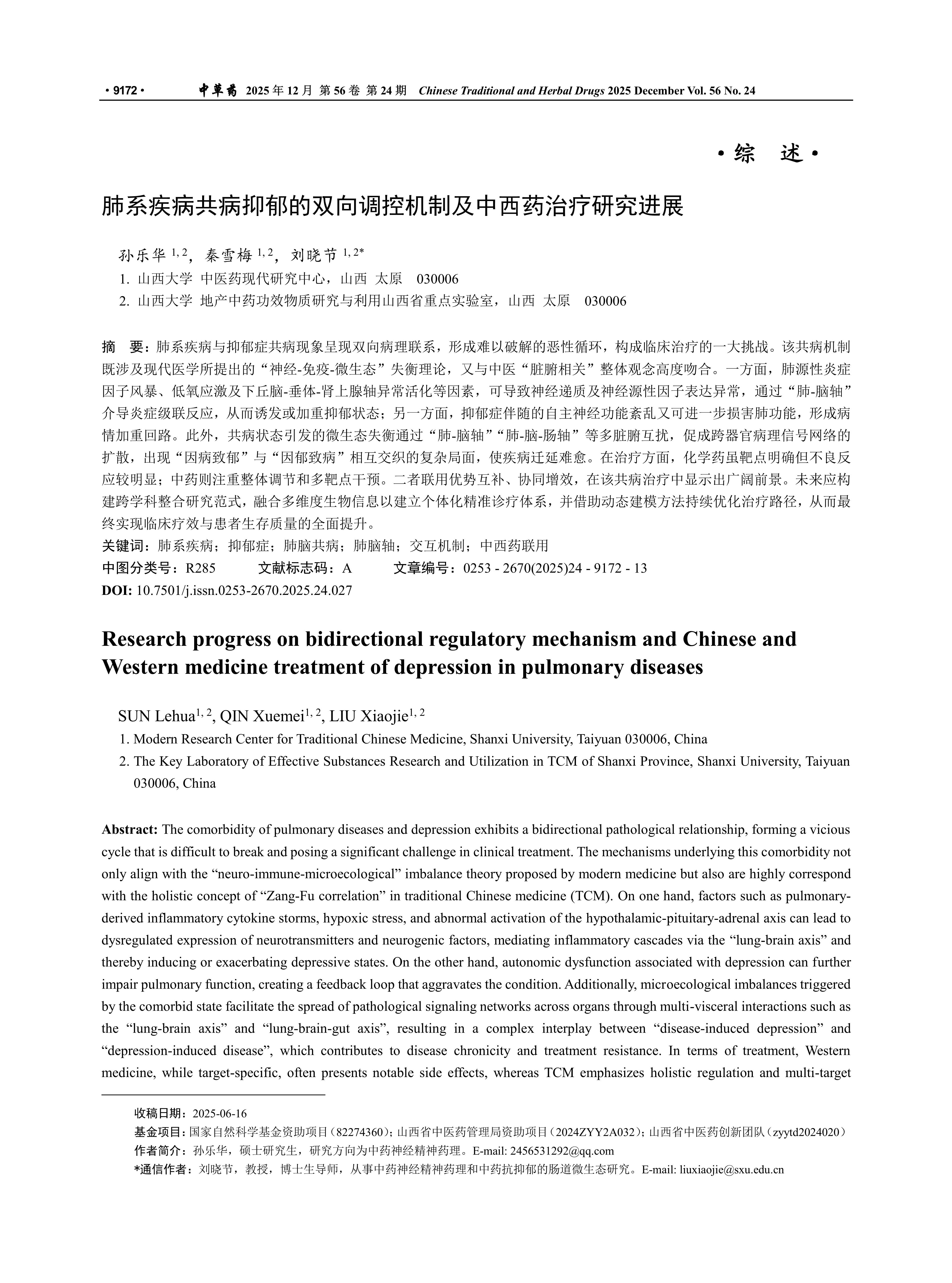 肺系疾病与抑郁症共病现象呈现双向病理联系,形成难以破解的恶性循环,构成临床治疗的一大挑战。该共病机制既涉及现代医学所提出的“神经-免疫-微生态”失衡理论,又与中医“脏腑相关”整体观念高度吻合。一方面,肺源性炎症因子风暴、低氧应激及下丘脑-垂体-肾上腺轴异常活化等因素,可导致神经递质及神经源性因子表达异常,通过“肺-脑轴”介导炎症级联反应,从而诱发或加重抑郁状态;另一方面,抑郁症伴随的自主神经功能紊乱又可进一步损害肺功能,形成病情加重回路。此外,共病状态引发的微生态失衡通过“肺-脑轴”“肺-脑-肠轴”等多脏腑互扰,促成跨器官病理信号网络的扩散,出现“因病致郁”与“因郁致病”相互交织的复杂局面,使疾病迁延难愈。在治疗方面,化学药虽靶点明确但不良反应较明显;中药则注重整体调节和多靶点干预。二者联用优势互补、协同增效,在该共病治疗中显示出广阔前景。未来应构建跨学科整合研究范式,融合多维度生物信息以建立个体化精准诊疗体系,并借助动态建模方法持续优化治疗路径,从而最终实现临床疗效与患者生存质量的全面提升。
