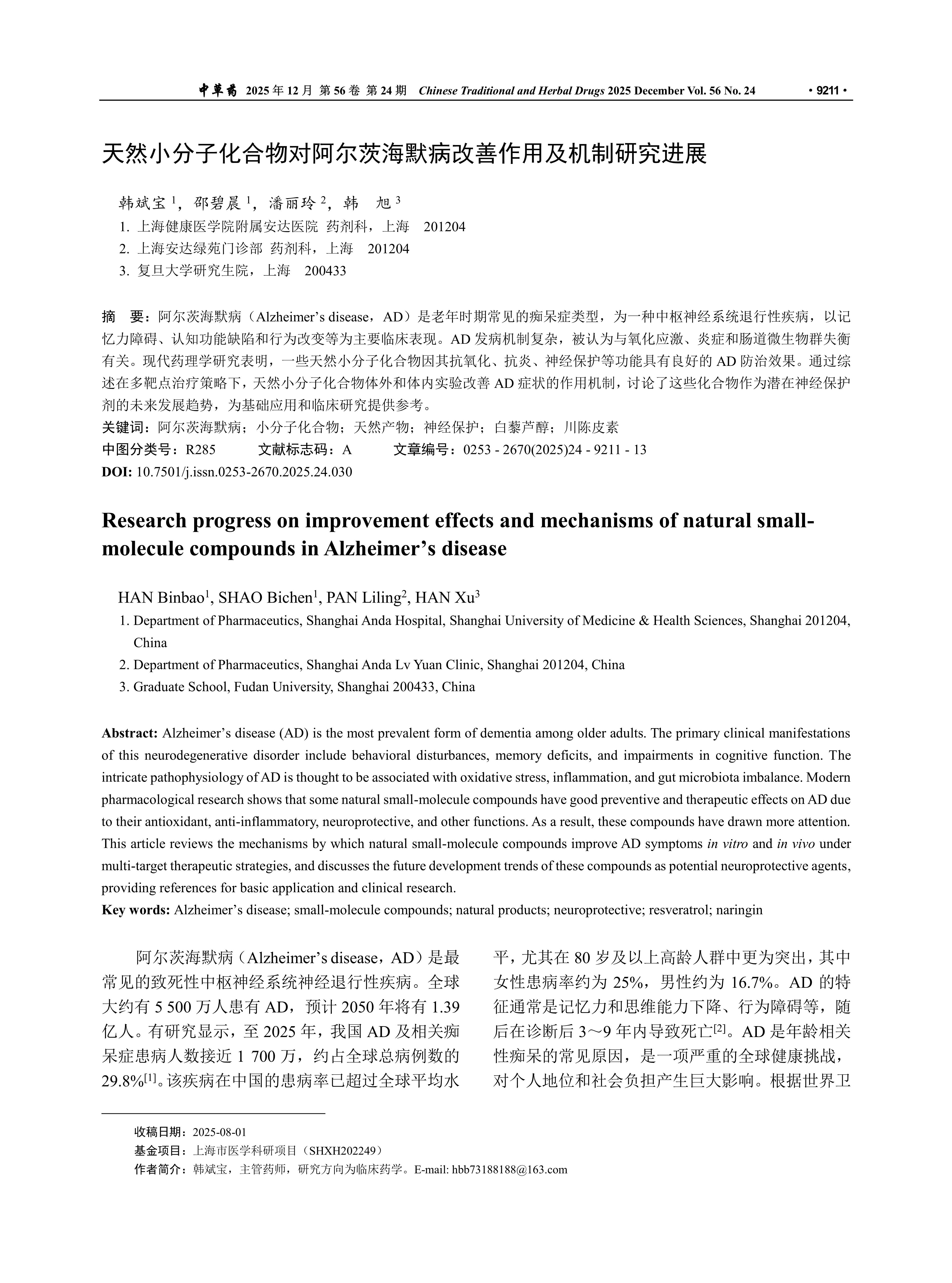 阿尔茨海默病(Alzheimer’s disease,AD)是老年时期常见的痴呆症类型,为一种中枢神经系统退行性疾病,以记忆力障碍、认知功能缺陷和行为改变等为主要临床表现。AD发病机制复杂,被认为与氧化应激、炎症和肠道微生物群失衡有关。现代药理学研究表明,一些天然小分子化合物因其抗氧化、抗炎、神经保护等功能具有良好的AD防治效果。通过综述在多靶点治疗策略下,天然小分子化合物体外和体内实验改善AD症状的作用机制,讨论了这些化合物作为潜在神经保护剂的未来发展趋势,为基础应用和临床研究提供参考。