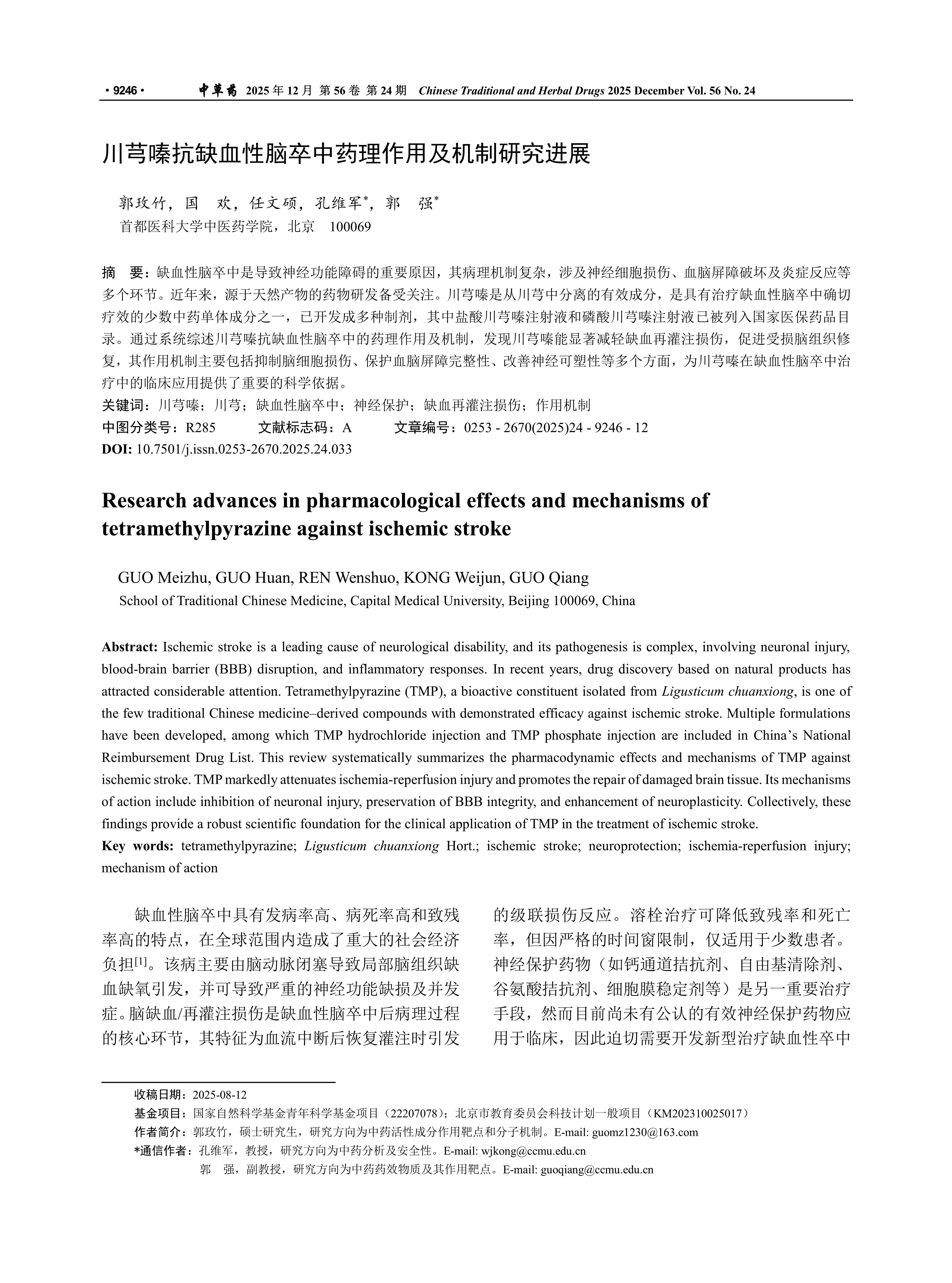 缺血性脑卒中是导致神经功能障碍的重要原因,其病理机制复杂,涉及神经细胞损伤、血脑屏障破坏及炎症反应等多个环节。近年来,源于天然产物的药物研发备受关注。川芎嗪是从川芎中分离的有效成分,是具有治疗缺血性脑卒中确切疗效的少数中药单体成分之一,已开发成多种制剂,其中盐酸川芎嗪注射液和磷酸川芎嗪注射液已被列入国家医保药品目录。通过系统综述川芎嗪抗缺血性脑卒中的药理作用及机制,发现川芎嗪能显著减轻缺血再灌注损伤,促进受损脑组织修复,其作用机制主要包括抑制脑细胞损伤、保护血脑屏障完整性、改善神经可塑性等多个方面,为川芎嗪在缺血性脑卒中治疗中的临床应用提供了重要的科学依据。