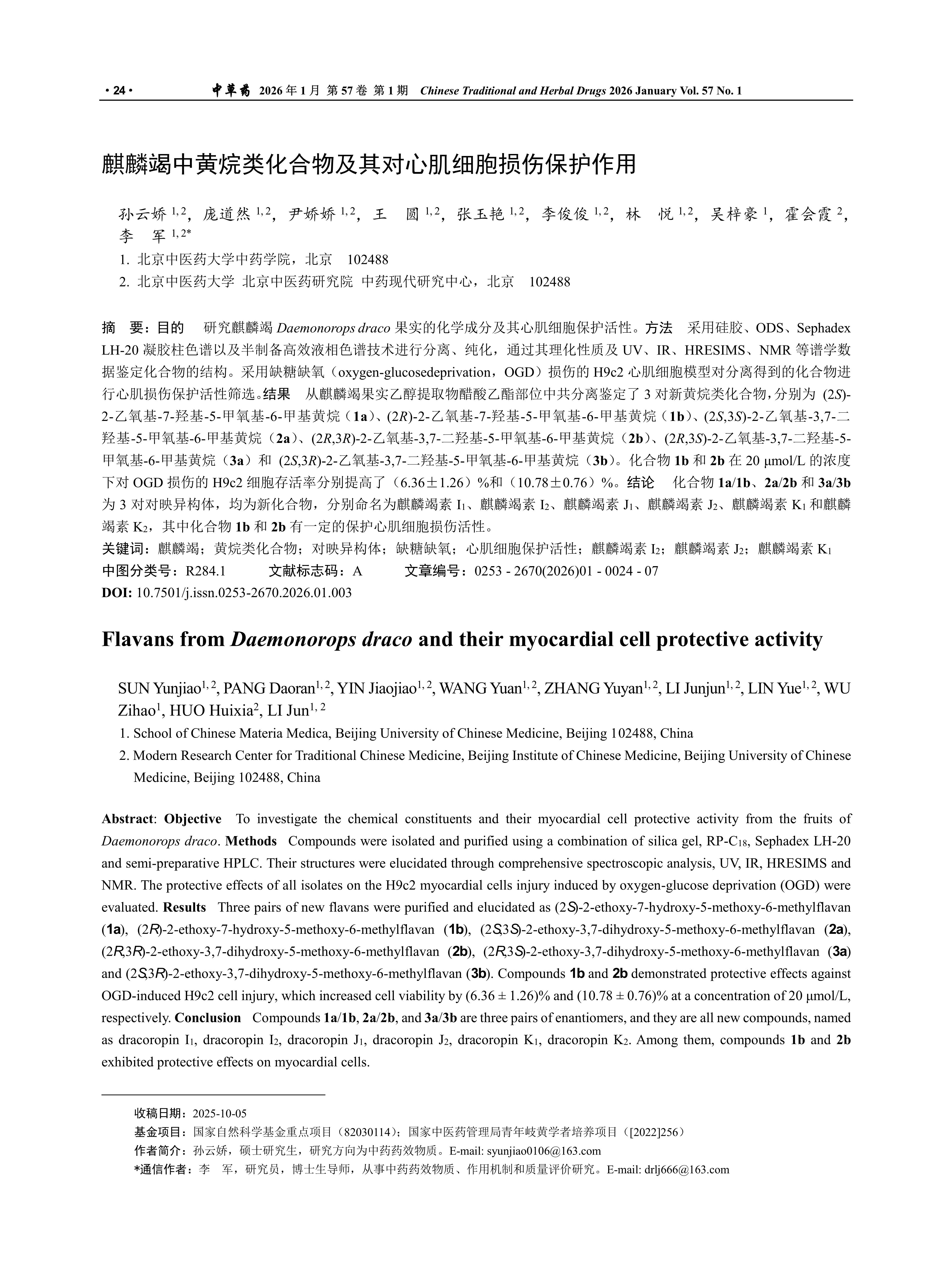 Objective To investigate the chemical constituents and their myocardial cell protective activity from the fruits of Daemonorops draco. Methods Compounds were isolated and purified using a combination of silica gel, RP-C18, Sephadex LH-20 and semi-preparative HPLC. Their structures were elucidated through comprehensive spectroscopic analysis, UV, IR, HRESIMS and NMR. The protective effects of all isolates on the H9c2 myocardial cells injury induced by oxygen-glucose deprivation (OGD) were evaluated. Results Three pairs of new flavans were purified and elucidated as (2S)-2-ethoxy-7-hydroxy-5-methoxy-6-methylflavan (1a), (2R)-2-ethoxy-7-hydroxy-5-methoxy-6-methylflavan (1b), (2S,3S)-2-ethoxy-3,7-dihydroxy-5-methoxy-6-methylflavan (2a), (2R,3R)-2-ethoxy-3,7-dihydroxy-5-methoxy-6-methylflavan (2b), (2R,3S)-2-ethoxy-3,7-dihydroxy-5-methoxy-6-methylflavan (3a) and (2S,3R)-2-ethoxy-3,7-dihydroxy-5-methoxy-6-methylflavan (3b). Compounds 1b and 2b demonstrated protective effects against OGD-induced H9c2 cell injury, which increased cell viability by (6.36 ±1.26)% and (10.78 ±0.76)% at a concentration of 20 μmol/L, respectively. Conclusion Compounds 1a/1b, 2a/2b, and 3a/3b are three pairs of enantiomers, and they are all new compounds, named as dracoropin I1, dracoropin I2, dracoropin J1, dracoropin J2, dracoropin K1, dracoropin K2. Among them, compounds 1b and 2b exhibited protective effects on myocardial cells.