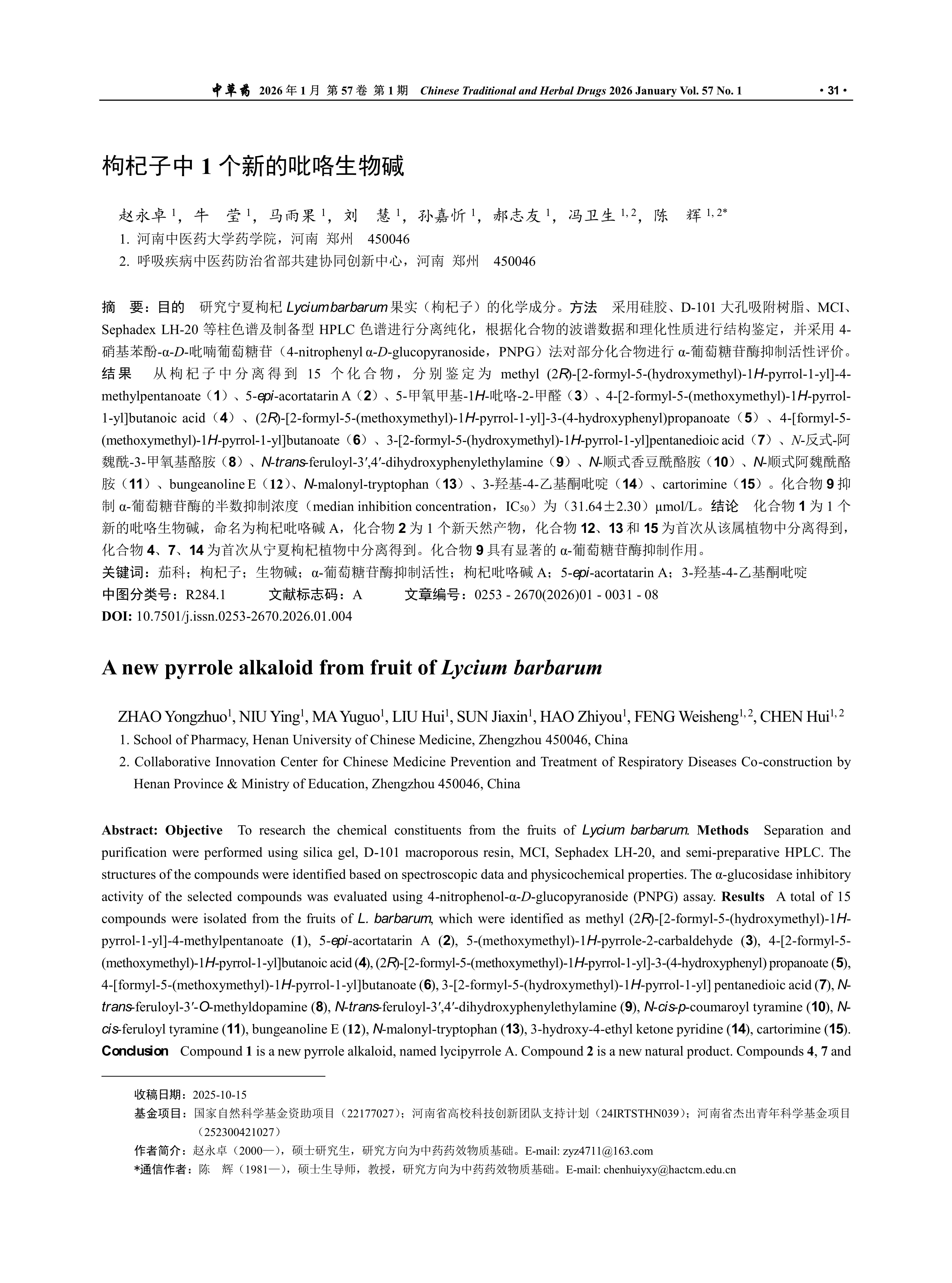 Objective To research the chemical constituents from the fruits of Lycium barbarum. Methods Separation and purification were performed using silica gel, D-101 macroporous resin, MCI, Sephadex LH-20, and semi-preparative HPLC. The structures of the compounds were identified based on spectroscopic data and physicochemical properties. The α-glucosidase inhibitory activity of the selected compounds was evaluated using 4-nitrophenol-α-D-glucopyranoside (PNPG) assay. Results A total of 15 compounds were isolated from the fruits of L. barbarum, which were identified as methyl (2R)-[2-formyl-5-(hydroxymethyl)-1H-pyrrol-1-yl]-4-methylpentanoate (1), 5-epi-acortatarin A (2), 5-(methoxymethyl)-1H-pyrrole-2-carbaldehyde (3), 4-[2-formyl-5-(methoxymethyl)-1H-pyrrol-1-yl]butanoic acid (4), (2R)-[2-formyl-5-(methoxymethyl)-1H-pyrrol-1-yl]-3-(4-hydroxyphenyl) propanoate (5), 4-[formyl-5-(methoxymethyl)-1H-pyrrol-1-yl]butanoate (6), 3-[2-formyl-5-(hydroxymethyl)-1H-pyrrol-1-yl] pentanedioic acid (7), N-trans-feruloyl-3'-O-methyldopamine (8), N-trans-feruloyl-3',4'-dihydroxyphenylethylamine (9), N-cis-p-coumaroyl tyramine (10), N-cis-feruloyl tyramine (11), bungeanoline E (12), N-malonyl-tryptophan (13), 3-hydroxy-4-ethyl ketone pyridine (14), cartorimine (15). Conclusion Compound 1 is a new pyrrole alkaloid, named lycipyrrole A. Compound 2 is a new natural product. Compounds 4, 7 and 12—15 were isolated from L. barbarum for the first time, while compounds 12, 13 and 15 were isolated from this genus for the first time. Notably, compound 9 exhibited significant inhibitory activity against α-glucosidase.