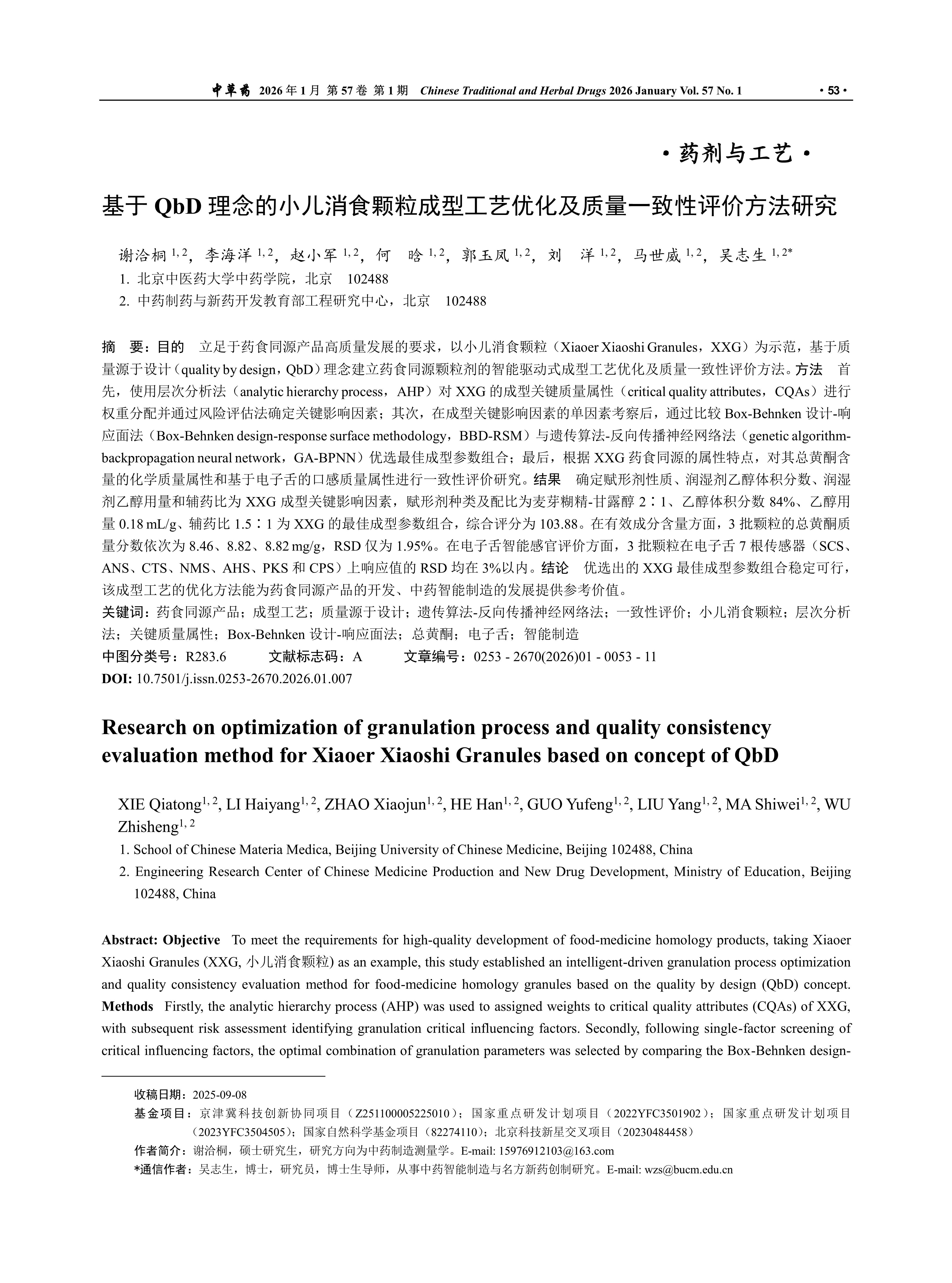 Objective To meet the requirements for high-quality development of food-medicine homology products, taking Xiaoer Xiaoshi Granules (XXG, 小儿消食颗粒) as an example, this study established an intelligent-driven granulation process optimization and quality consistency evaluation method for food-medicine homology granules based on the quality by design (QbD) concept. Methods Firstly, the analytic hierarchy process (AHP) was used to assigned weights to critical quality attributes (CQAs) of XXG, with subsequent risk assessment identifying granulation critical influencing factors. Secondly, following single-factor screening of critical influencing factors, the optimal combination of granulation parameters was selected by comparing the Box-Behnken design-response surface methodology (BBD-RSM) and the genetic algorithm-backpropagation neural network (GA-BPNN). Finally, leveraging the medicine-food homology properties of XXG, a quality consistency assessment was performed targeting both chemical attributes (total flavonoid content) and taste quality attribute based on electronic tongue. Results The excipient properties, ethanol volume fraction of wetting agent, ethanol amount, and excipient-to-drug ratio were determined as critical influencing factors, the optimal granulation parameters for XXG were determined as follows: an excipient system of maltodextrin to mannitol at a 2∶1 ratio, an ethanol concentration of 84%, an ethanol amount of 0.18 mL/g, and an excipient-to-drug ratio of 1.5∶1, yielding a comprehensive score of 103.88. Regarding bioactive constituents, the RSD of total flavonoid content across three batches was as low as 1.95%. For instrumental sensory evaluation, the e-tongue response values demonstrated batch-to-batch consistency with RSDs below 3% across all seven sensors. Conclusion The optimized granulation parameter set demonstrated stability and feasibility, and this process optimization approach can offer valuable insights for developing medicine-food homology products and advancing intelligent manufacturing in traditional Chinese medicine.