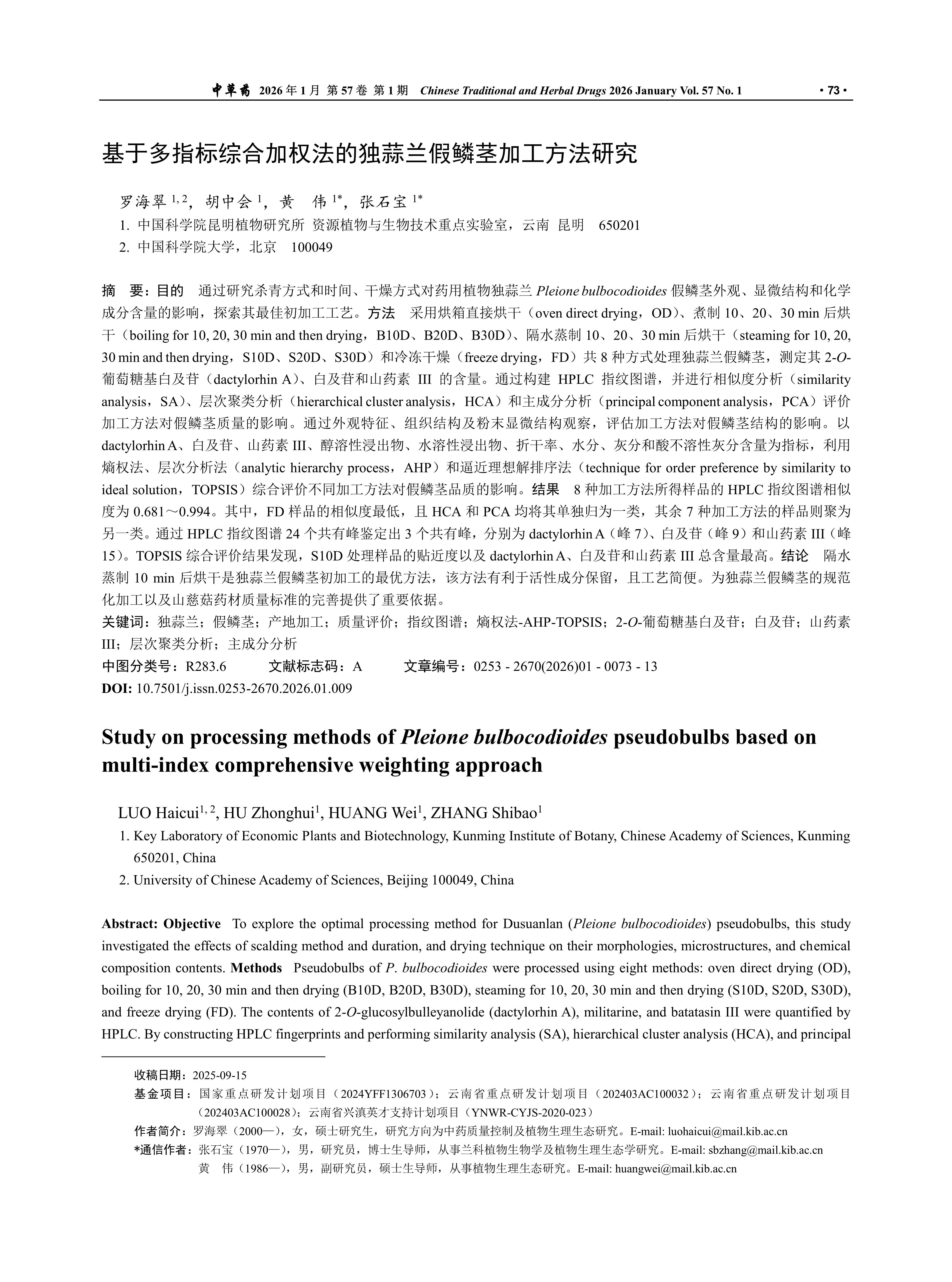 Objective To explore the optimal processing method for Dusuanlan (Pleione bulbocodioides) pseudobulbs, this study investigated the effects of scalding method and duration, and drying technique on their morphologies, microstructures, and chemical composition contents. Methods Pseudobulbs of P. bulbocodioides were processed using eight methods: oven direct drying (OD), boiling for 10, 20, 30 min and then drying (B10D, B20D, B30D), steaming for 10, 20, 30 min and then drying (S10D, S20D, S30D), and freeze drying (FD). The contents of 2-O-glucosylbulleyanolide (dactylorhin A), militarine, and batatasin III were quantified by HPLC. By constructing HPLC fingerprints and performing similarity analysis (SA), hierarchical cluster analysis (HCA), and principal component analysis (PCA), the impact of processing methods on the quality of pseudobulbs was evaluated. Structural changes were assessed through examination of macroscopic features, tissue organization, and powdered microscopic characteristics. Using dactylorhin A content, militarine content, batatasin III content, alcohol-soluble extractives, water-soluble extractives, drying rate, moisture content, total ash content, and acid-insoluble ash content as indicators, the effects of eight processing methods on the quality of pseudobulbs were comprehensively evaluated by entropy weight method, analytic hierarchy process (AHP), and technique for order preference by similarity to ideal solution (TOPSIS). Results The values for HPLC fingerprint similarity of the samples obtained from eight methods ranged from 0.681 to 0.994. The freeze-dried (FD) samples exhibited the lowest similarity and were segregated as a distinct cluster in both hierarchical cluster analysis (HCA) and principal component analysis (PCA), while the samples from other seven methods formed a separate cluster. Three common peaks were identified among the 24 common peaks in the HPLC fingerprints: dactylorhin A (peak 7), militarine (peak 9), and batatasin III (peak 15). According to TOPSIS-based comprehensive evaluation, samples steamed for 10 min followed by oven drying (S10D) showed both the highest relative closeness coefficient and the greatest total content of dactylorhin A, militarine, and batatasin III. Conclusion Based on comprehensive multi-index evaluation, steaming for 10 min followed by oven drying (S10D) was identified as an optimal primary processing method for P. bulbocodioides pseudobulbs. This method enhanced the retention of active compounds while being technically straightforward. The study establishes a critical foundation for standardizing processing of P. bulbocodioides pseudobulbs and refining quality standards of Shancigu (Cremastrae Pseudobulbus Pleiones Pseudobulbus) in pharmacopeial monographs.