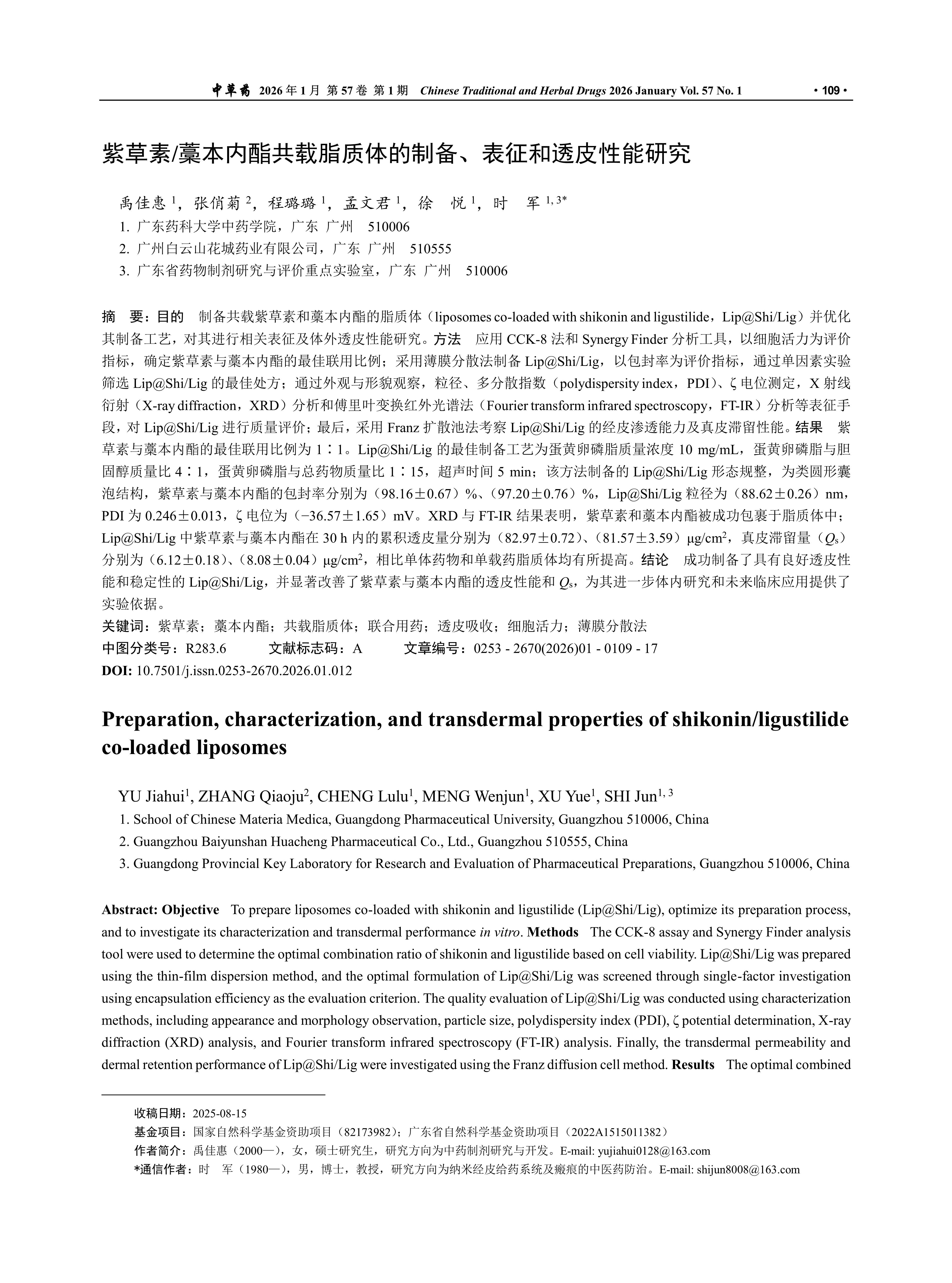 紫草素/藁本内酯共载脂质体的制备、表征和透皮性能研究