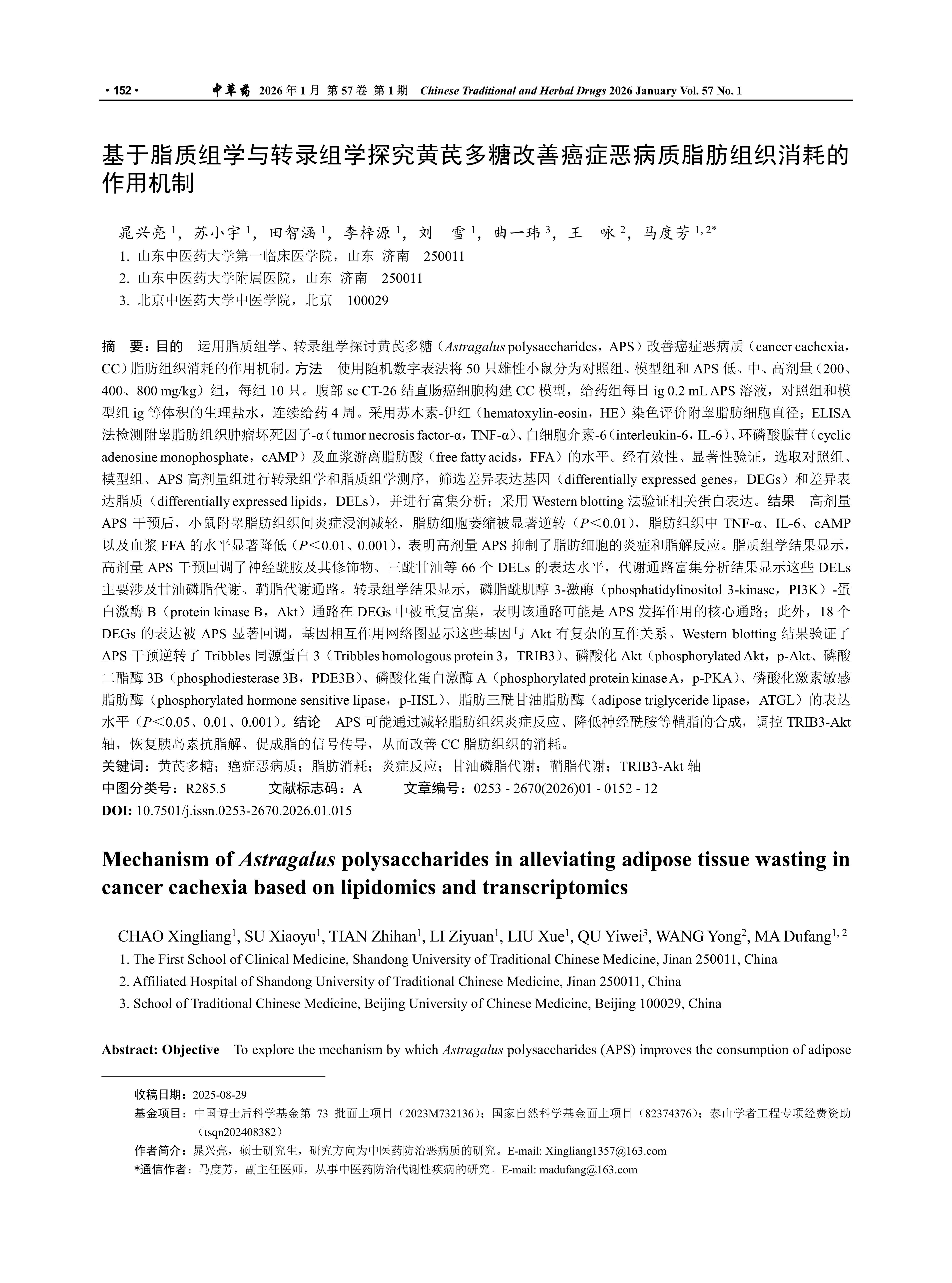 基于脂质组学与转录组学探究黄芪多糖改善癌症恶病质脂肪组织消耗的作用机制