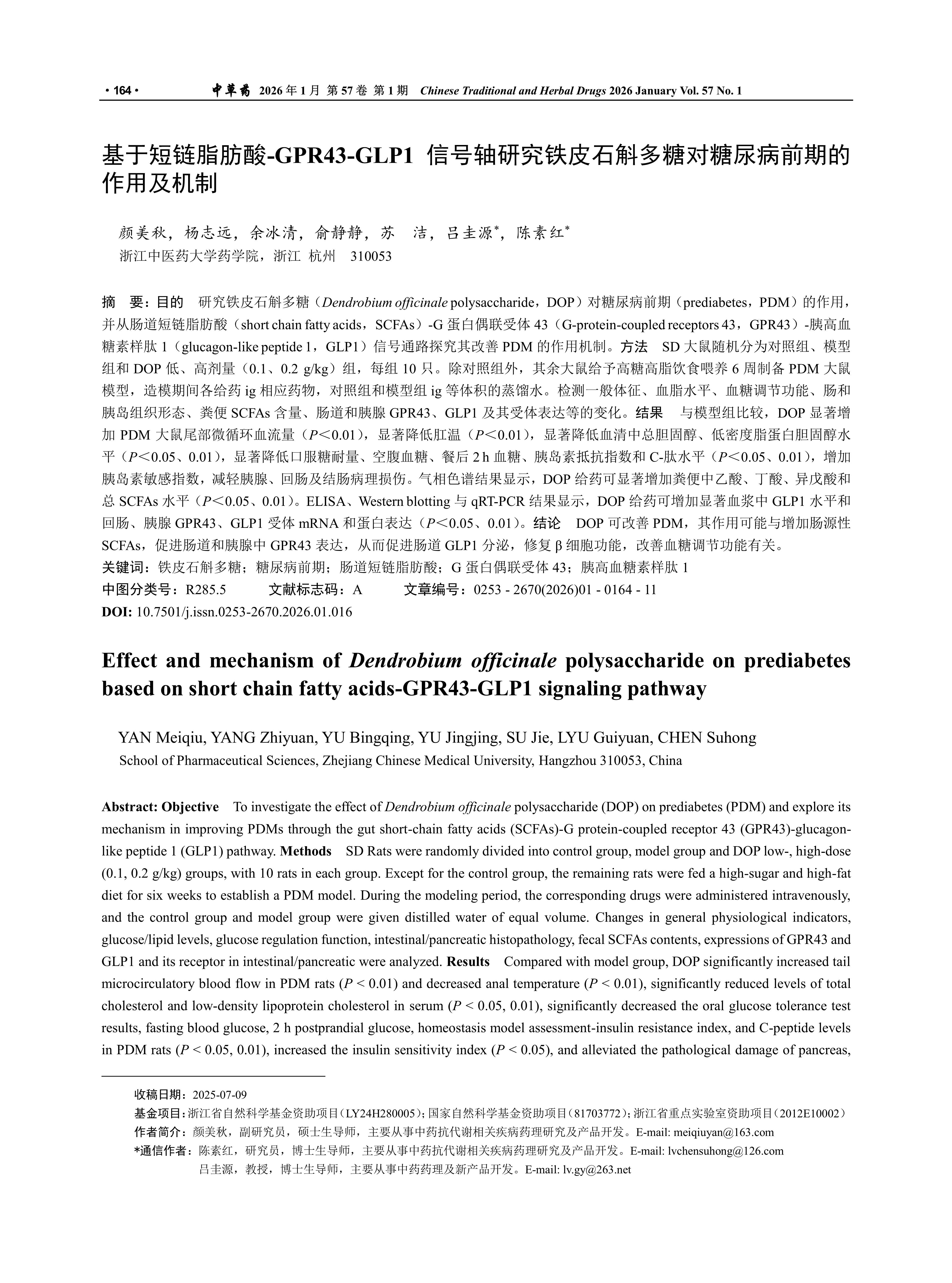 Objective To investigate the effect of Dendrobium officinale polysaccharide (DOP) on prediabetes (PDM) and explore its mechanism in improving PDMs through the gut short-chain fatty acids (SCFAs)-G protein-coupled receptor 43 (GPR43)-glucagon-like peptide 1 (GLP1) pathway. Methods SD Rats were randomly divided into control group, model group and DOP low-, high-dose (0.1, 0.2 g/kg) groups, with 10 rats in each group. Except for the control group, the remaining rats were fed a high-sugar and high-fat diet for six weeks to establish a PDM model. During the modeling period, the corresponding drugs were administered intravenously, and the control group and model group were given distilled water of equal volume. Changes in general physiological indicators, glucose/lipid levels, glucose regulation function, intestinal/pancreatic histopathology, fecal SCFAs contents, expressions of GPR43 and GLP1 and its receptor in intestinal/pancreatic were analyzed. Results Compared with model group, DOP significantly increased tail microcirculatory blood flow in PDM rats (P < 0.01) and decreased anal temperature (P < 0.01), significantly reduced levels of total cholesterol and low-density lipoprotein cholesterol in serum (P < 0.05, 0.01), significantly decreased the oral glucose tolerance test results, fasting blood glucose, 2 h postprandial glucose, homeostasis model assessment-insulin resistance index, and C-peptide levels in PDM rats (P < 0.05, 0.01), increased the insulin sensitivity index (P < 0.05), and alleviated the pathological damage of pancreas, ileum and colon. Gas chromatography results showed that DOP administration could significantly increase the levels of acetic acid, butyric acid, isovaleric acid and SCFAs in feces (P < 0.05, 0.01). ELISA, Western blotting and qRT-PCR results showed that DOP administration could significantly increase the plasma GLP1 level, as well as the mRNA and protein expressions of GPR43 and GLP1 receptor in ileum and pancreas (P < 0.05, 0.01). Conclusion DOP could improve PDM, and its effect may be related to enhancing gut-derived SCFA production, up-regulating GPR43 expressions in intestine and pancreas, subsequent promoting GLP1 secretion, restoring β-cell function and improving glucose regulation.