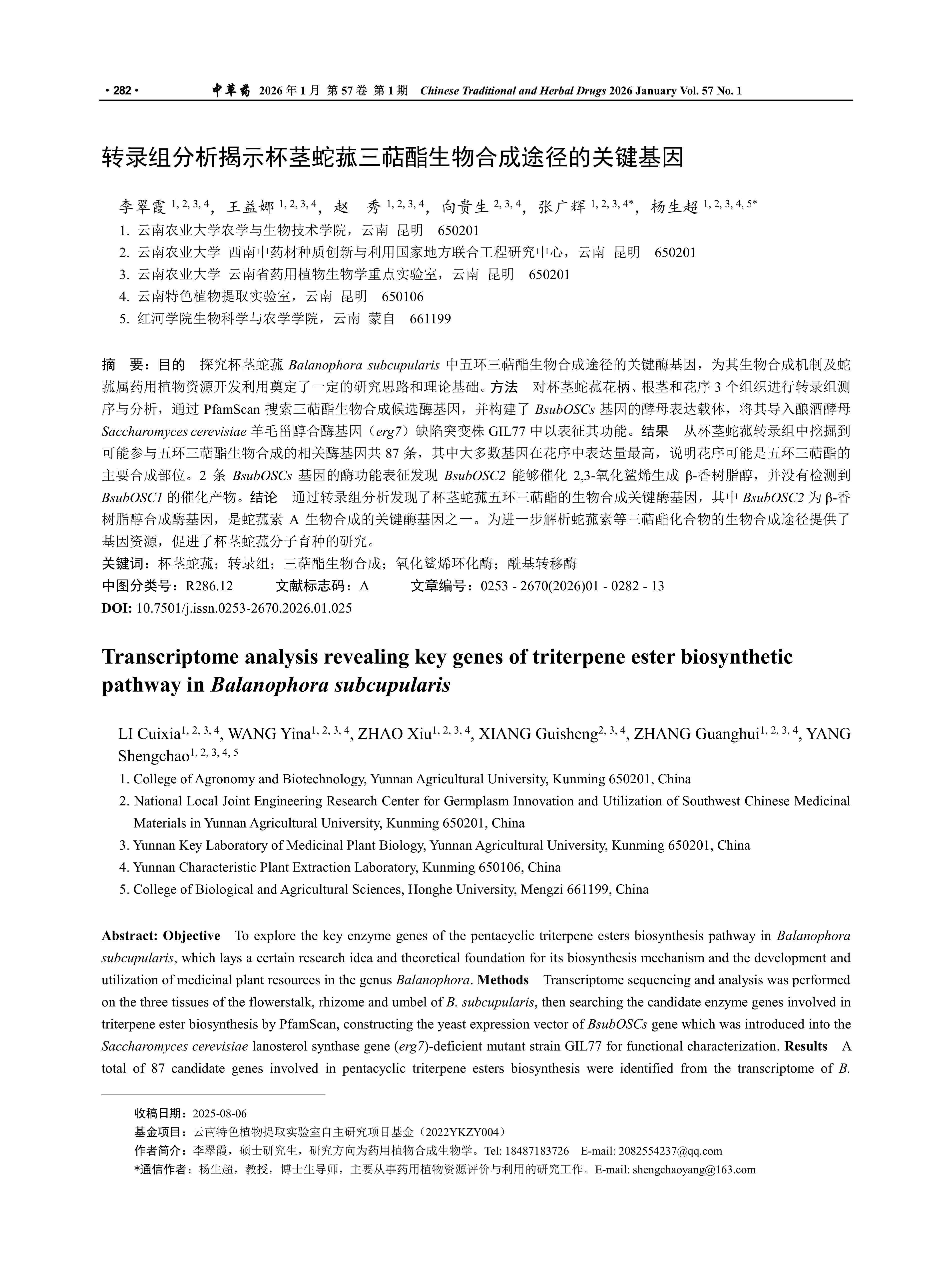 转录组分析揭示杯茎蛇菰三萜酯生物合成途径的关键基因