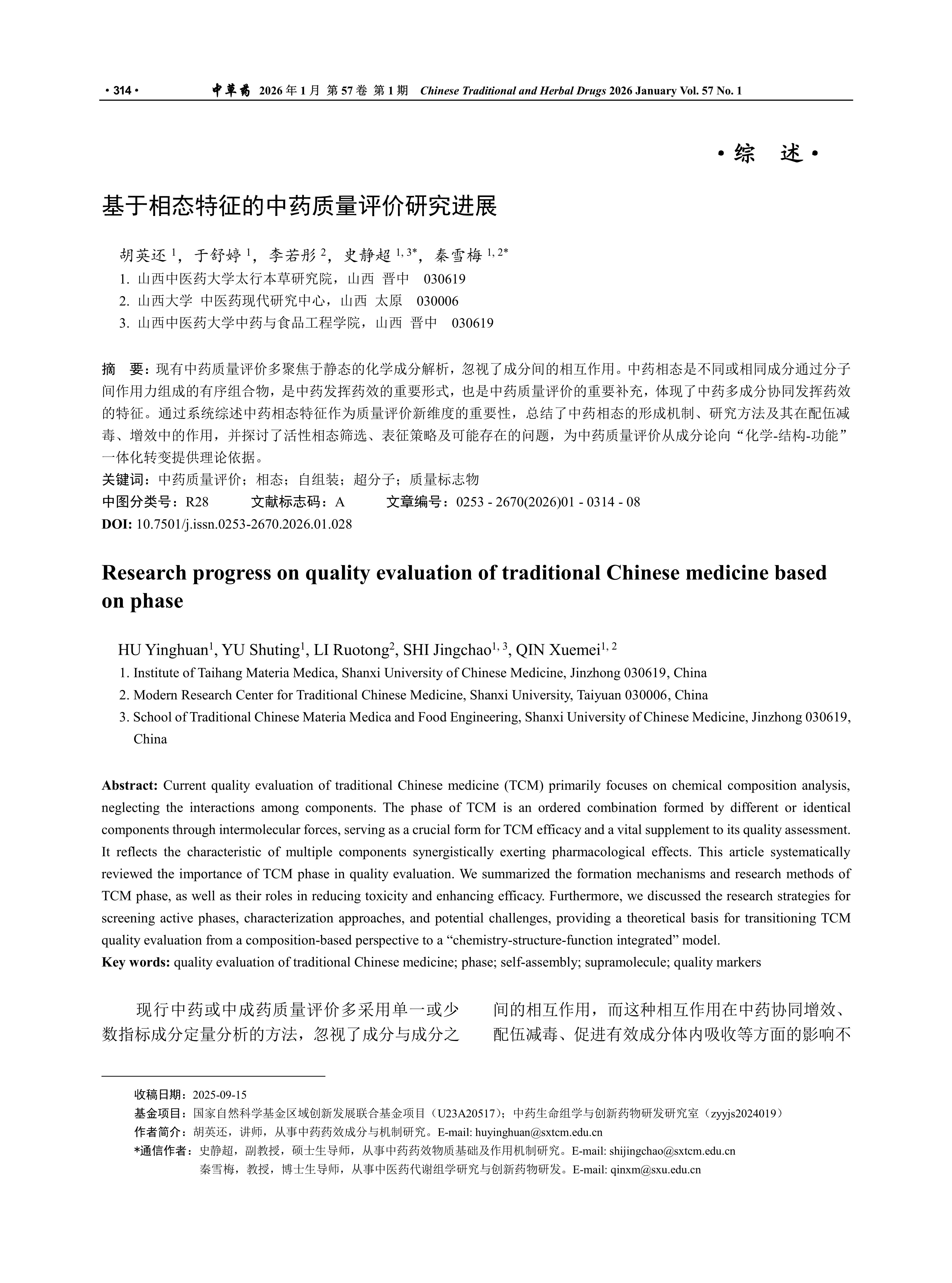 现有中药质量评价多聚焦于静态的化学成分解析,忽视了成分间的相互作用。中药相态是不同或相同成分通过分子间作用力组成的有序组合物,是中药发挥药效的重要形式,也是中药质量评价的重要补充,体现了中药多成分协同发挥药效的特征。通过系统综述中药相态特征作为质量评价新维度的重要性,总结了中药相态的形成机制、研究方法及其在配伍减毒、增效中的作用,并探讨了活性相态筛选、表征策略及可能存在的问题,为中药质量评价从成分论向“化学-结构-功能”一体化转变提供理论依据。