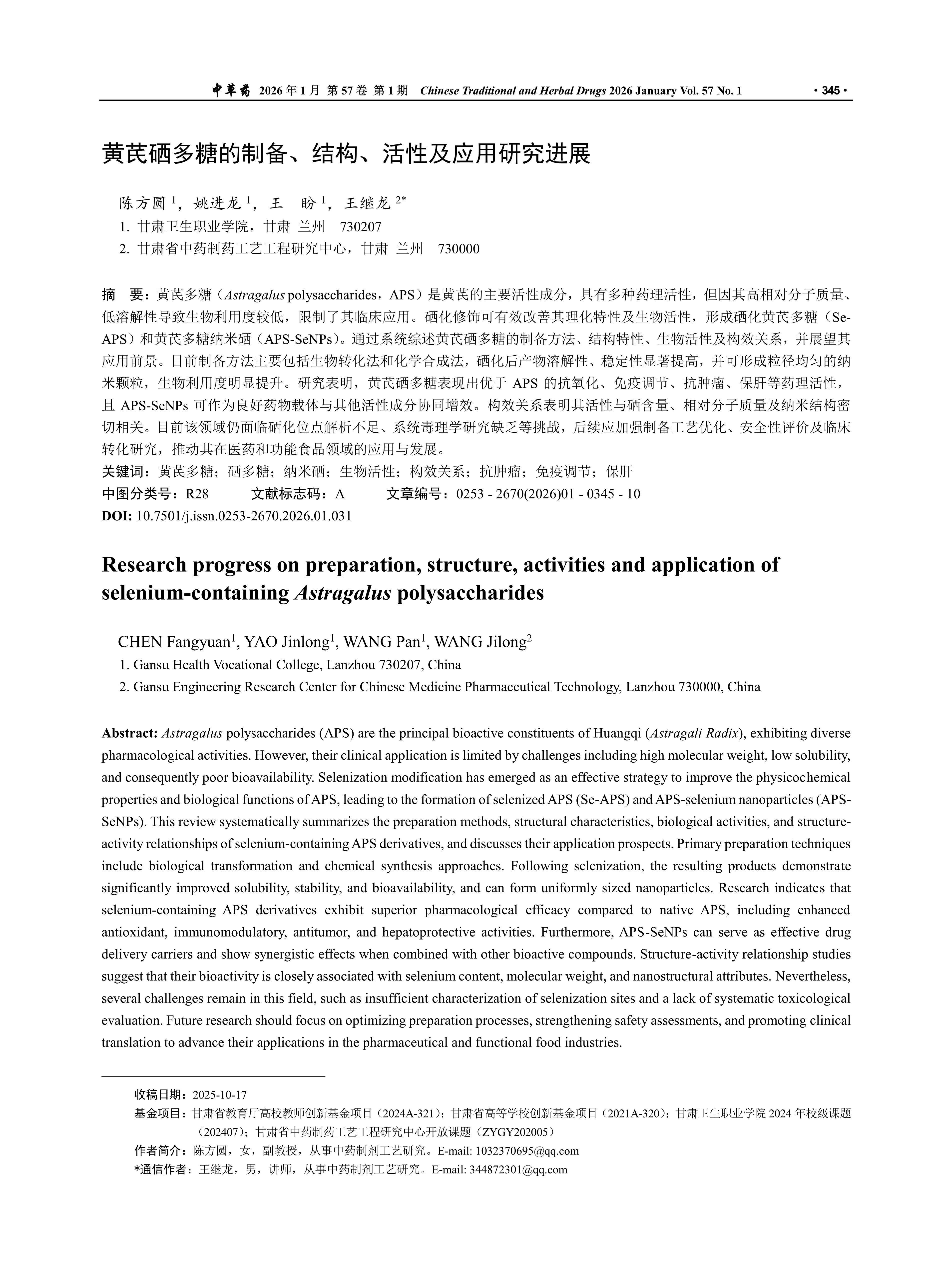 黄芪多糖(Astragalus polysaccharides,APS)是黄芪的主要活性成分,具有多种药理活性,但因其高相对分子质量、低溶解性导致生物利用度较低,限制了其临床应用。硒化修饰可有效改善其理化特性及生物活性,形成硒化黄芪多糖(Se-APS)和黄芪多糖纳米硒(APS-SeNPs)。通过系统综述黄芪硒多糖的制备方法、结构特性、生物活性及构效关系,并展望其应用前景。目前制备方法主要包括生物转化法和化学合成法,硒化后产物溶解性、稳定性显著提高,并可形成粒径均匀的纳米颗粒,生物利用度明显提升。研究表明,黄芪硒多糖表现出优于APS的抗氧化、免疫调节、抗肿瘤、保肝等药理活性,且APS-SeNPs可作为良好药物载体与其他活性成分协同增效。构效关系表明其活性与硒含量、相对分子质量及纳米结构密切相关。目前该领域仍面临硒化位点解析不足、系统毒理学研究缺乏等挑战,后续应加强制备工艺优化、安全性评价及临床转化研究,推动其在医药和功能食品领域的应用与发展。