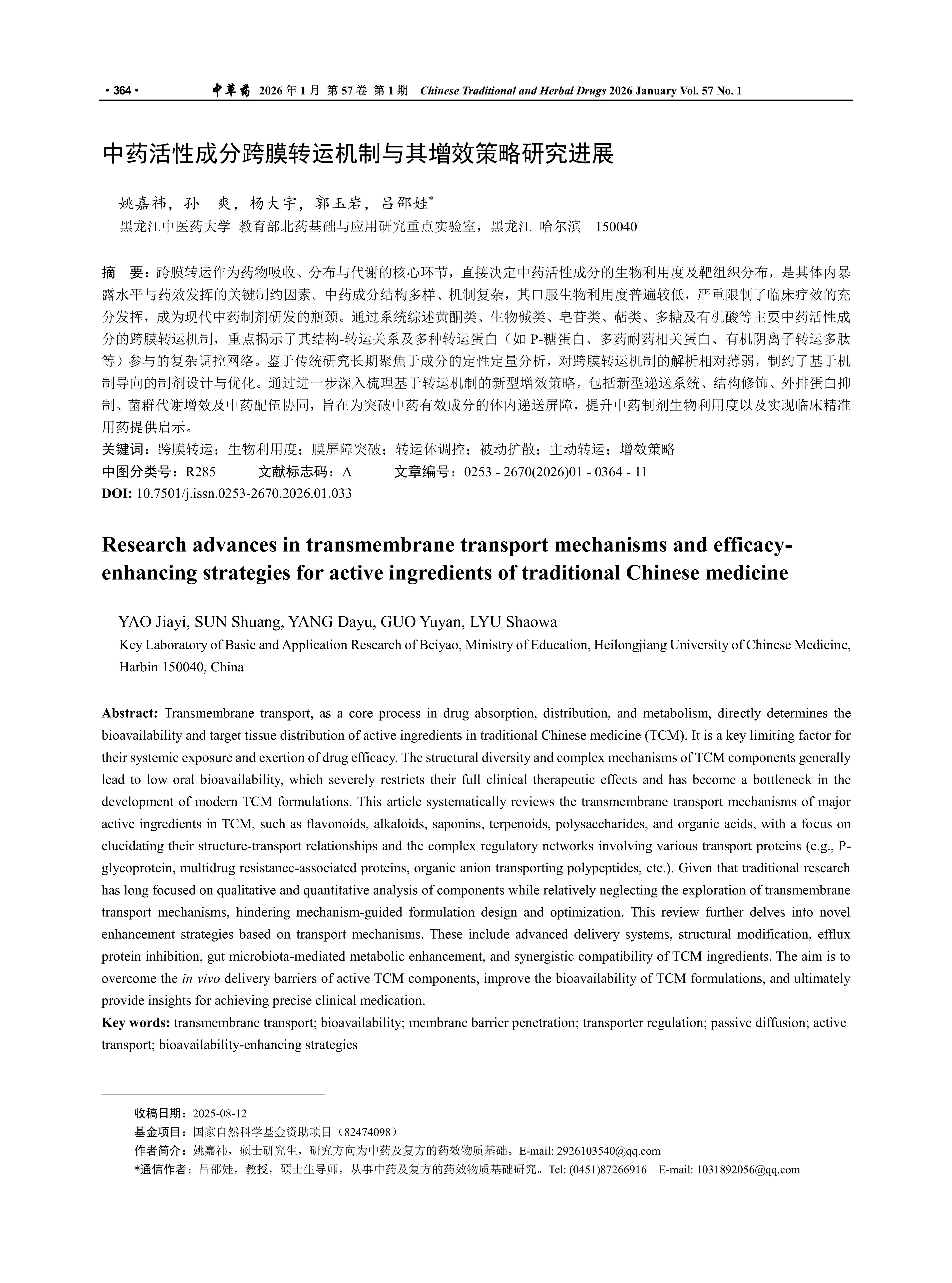 跨膜转运作为药物吸收、分布与代谢的核心环节,直接决定中药活性成分的生物利用度及靶组织分布,是其体内暴露水平与药效发挥的关键制约因素。中药成分结构多样、机制复杂,其口服生物利用度普遍较低,严重限制了临床疗效的充分发挥,成为现代中药制剂研发的瓶颈。通过系统综述黄酮类、生物碱类、皂苷类、萜类、多糖及有机酸等主要中药活性成分的跨膜转运机制,重点揭示了其结构-转运关系及多种转运蛋白(如P-糖蛋白、多药耐药相关蛋白、有机阴离子转运多肽等)参与的复杂调控网络。鉴于传统研究长期聚焦于成分的定性定量分析,对跨膜转运机制的解析相对薄弱,制约了基于机制导向的制剂设计与优化。通过进一步深入梳理基于转运机制的新型增效策略,包括新型递送系统、结构修饰、外排蛋白抑制、菌群代谢增效及中药配伍协同,旨在为突破中药有效成分的体内递送屏障,提升中药制剂生物利用度以及实现临床精准用药提供启示。