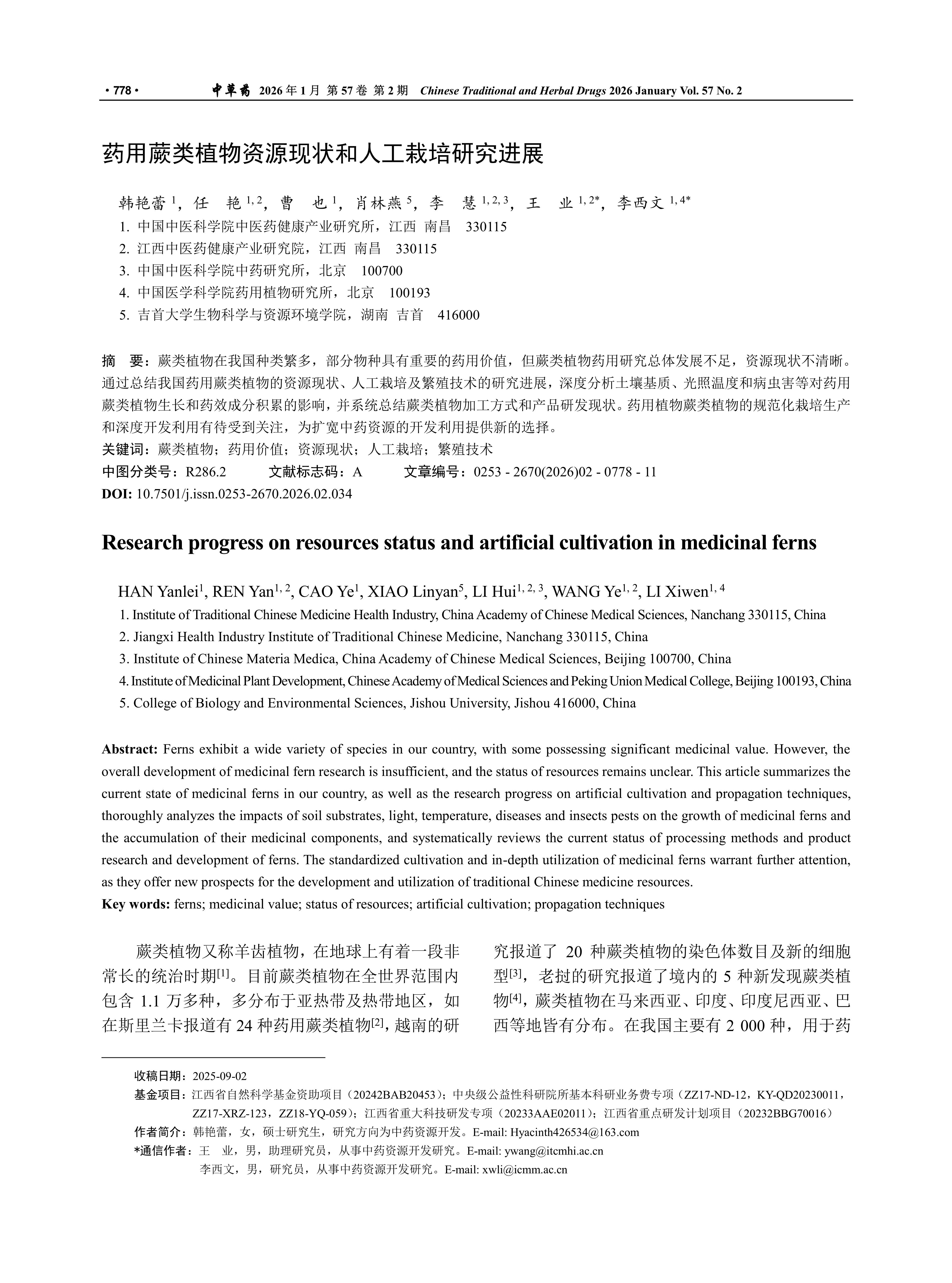 蕨类植物在我国种类繁多,部分物种具有重要的药用价值,但蕨类植物药用研究总体发展不足,资源现状不清晰。通过总结我国药用蕨类植物的资源现状、人工栽培及繁殖技术的研究进展,深度分析土壤基质、光照温度和病虫害等对药用蕨类植物生长和药效成分积累的影响,并系统总结蕨类植物加工方式和产品研发现状。药用植物蕨类植物的规范化栽培生产和深度开发利用有待受到关注,为扩宽中药资源的开发利用提供新的选择。