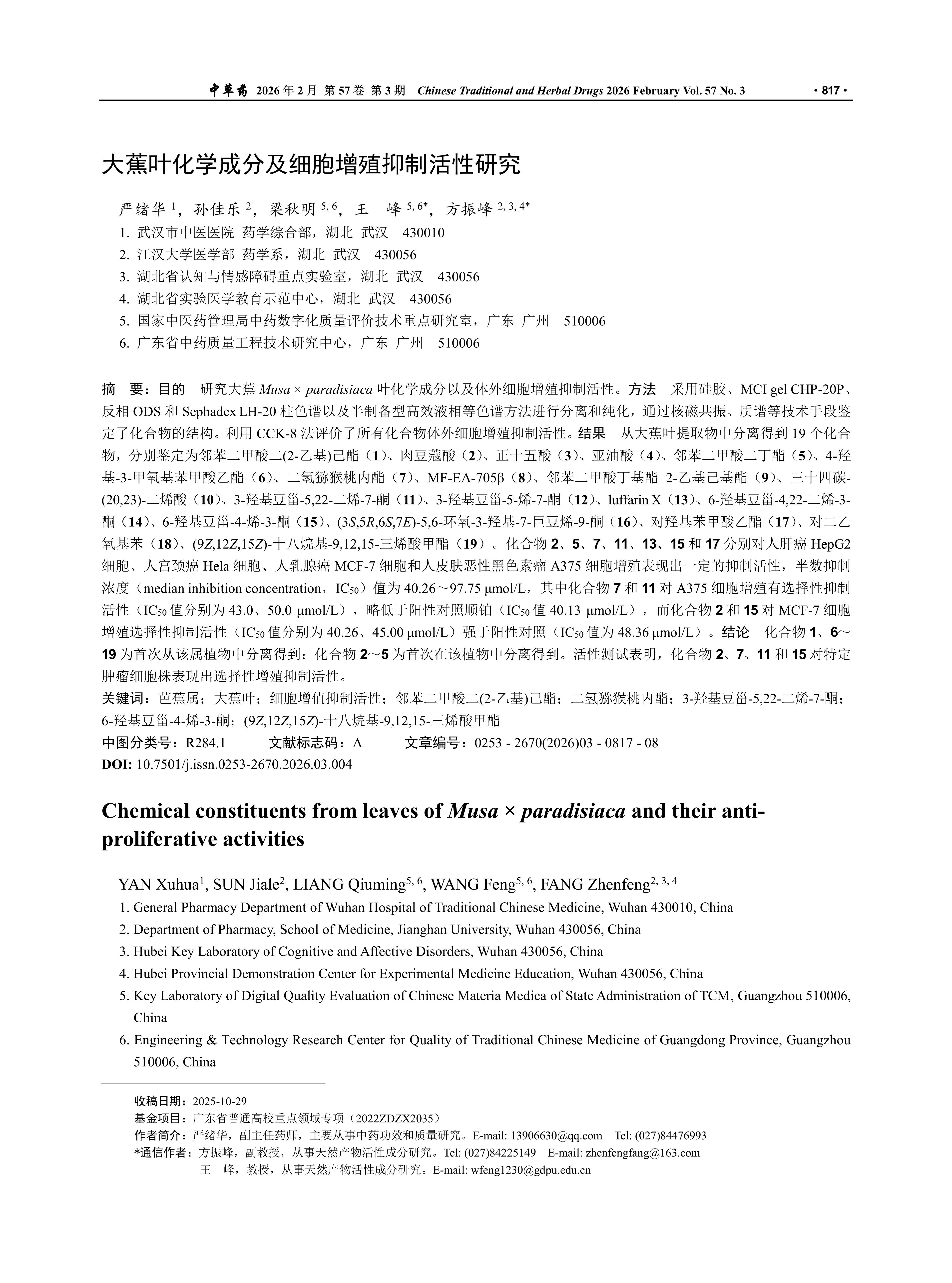 大蕉叶化学成分及细胞增殖抑制活性研究