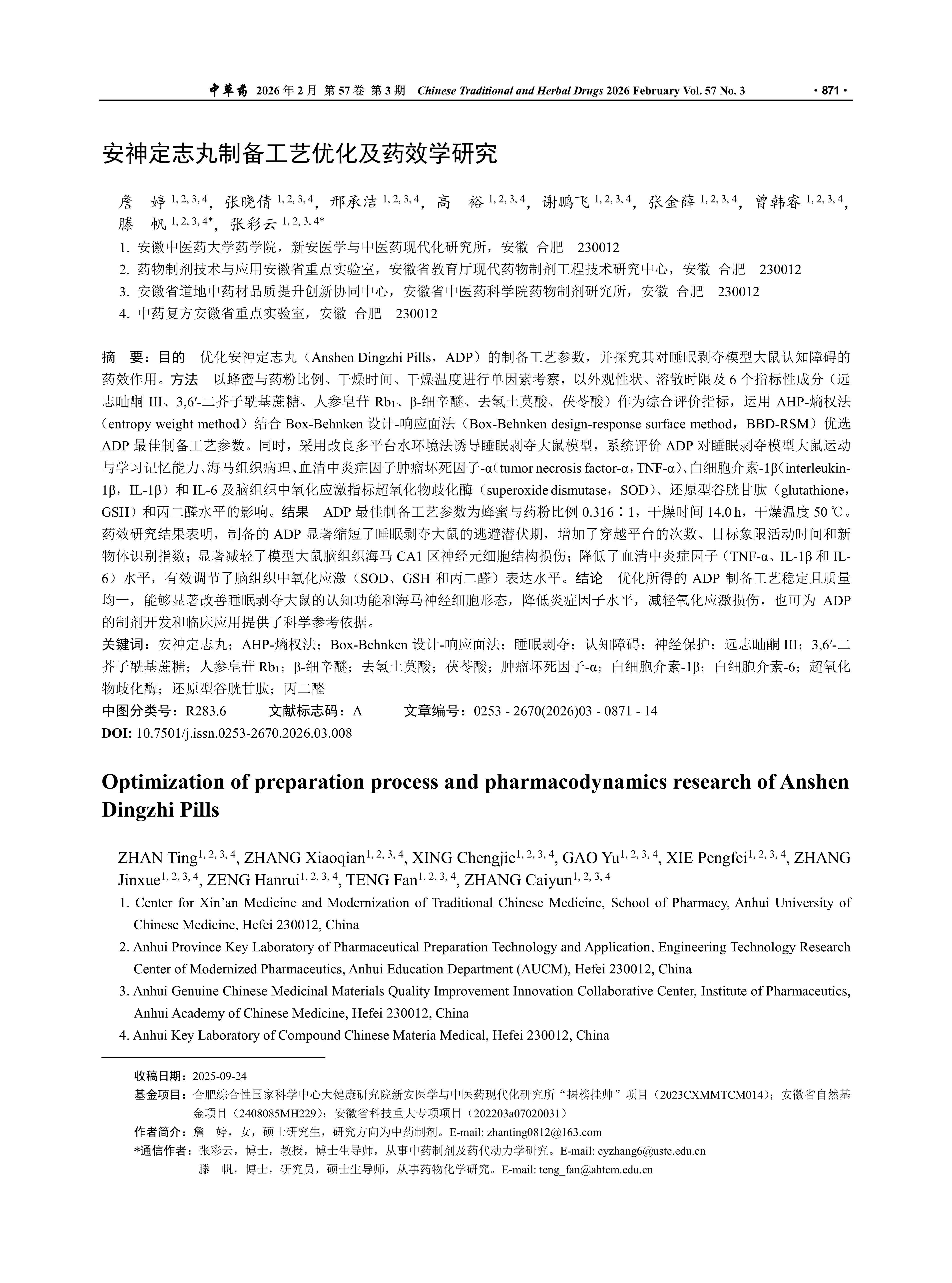 Objective To optimize the preparation process parameters of Anshen Dingzhi Pills (ADP, 安神定志丸) and explore its efficacy in alleviating cognitive impairment in sleep deprived model rats. Methods Single factor experiments were conducted on the ratio of powder to honey, drying time and drying temperature. The appearance characteristics, disintegration time limit and six index components (polygalaxanthone III, 3,6′-disinapoylsucrose, ginsenoside Rb1, β-asarone, dehydrotumulosic acid and pachymic acid) were used as comprehensive evaluation indexes. The AHP-entropy weight method combined with the Box-Behnken design-response surface method (BBD-RSM) were used to optimize the best process parameters for the preparation of ADP. The improved multi-platform water environment method was used to induce a rat model of sleep deprivation. The efficacy of ADP on sleep deprivation rats with cognitive impairment was evaluated by motor function, learning and memory performance, hippocampal histopathological changes, serum levels of inflammatory cytokines, including tumor necrosis factor-α (TNF-α), interleukin-1β (IL-1β) and IL-6 and oxidative stress markers in brain tissue, such as superoxide dismutase (SOD), reduced glutathione (GSH) and malondialdehyde (MDA). Results The optimal preparation process parameters for ADP was determined as follows, the ratio of honey to medicinal powder of 0.316:1, drying time of 14.0 h and drying temperature of 50 ℃. Pharmacological evaluation demonstrated that the prepared ADP significantly reduced escape latency in sleep deprived rats, increased the number of platform crossings, time spent in the target quadrant, and novel object recognition index. Additionally, it markedly alleviated neuronal structural damage in the hippocampal CA1 region, decreased serum levels of inflammatory factors (TNF-α, IL-1β and IL-6) and effectively regulated the expression levels of oxidative stress (SOD, GSH and MDA) in brain tissue. Conclusion The optimized ADP preparation process is stable and has consistent quality, which can significantly improve the cognitive function and hippocampal nerve cell morphology of sleep-deprived rats, reduce the levels of inflammatory factors, alleviate oxidative stress damage, and also provide a scientific reference basis for the development of ADP preparations and clinical applications.