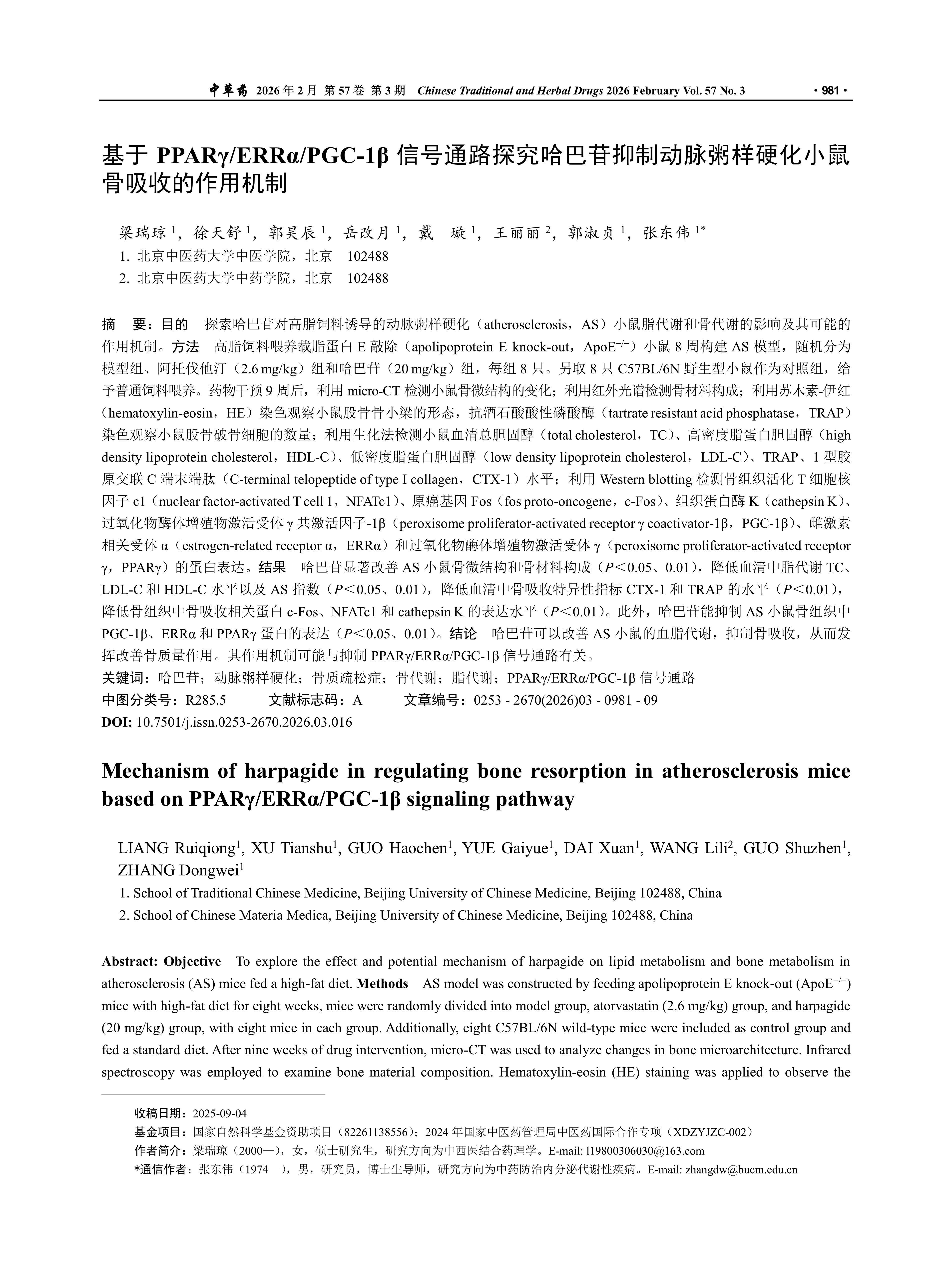 基于PPARγ/ERRα/PGC-1β信号通路探究哈巴苷抑制动脉粥样硬化小鼠骨吸收的作用机制