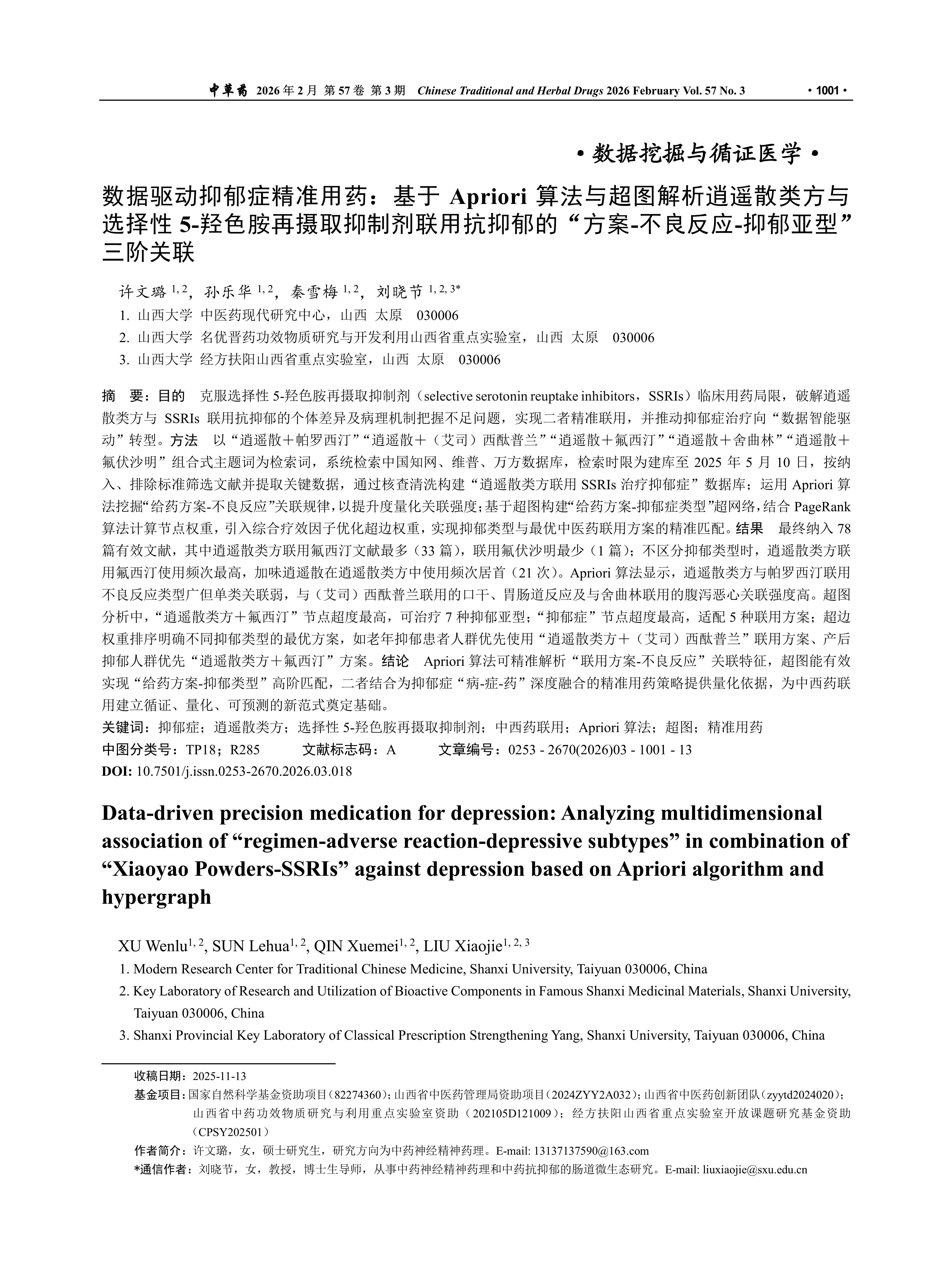 目的 克服选择性5-羟色胺再摄取抑制剂(selective serotonin reuptake inhibitors,SSRIs)临床用药局限,破解逍遥散类方与SSRIs联用抗抑郁的个体差异及病理机制把握不足问题,实现二者精准联用,并推动抑郁症治疗向“数据智能驱动”转型。方法 以“逍遥散+帕罗西汀”“逍遥散+(艾司)西酞普兰”“逍遥散+氟西汀”“逍遥散+舍曲林”“逍遥散+氟伏沙明”组合式主题词为检索词,系统检索中国知网、维普、万方数据库,检索时限为建库至2025年5月10日,按纳入、排除标准筛选文献并提取关键数据,通过核查清洗构建“逍遥散类方联用SSRIs治疗抑郁症”数据库;运用Apriori算法挖掘“给药方案-不良反应”关联规律,以提升度量化关联强度;基于超图构建“给药方案-抑郁症类型”超网络,结合PageRank算法计算节点权重,引入综合疗效因子优化超边权重,实现抑郁类型与最优中医药联用方案的精准匹配。结果 最终纳入78篇有效文献,其中逍遥散类方联用氟西汀文献最多(33篇),联用氟伏沙明最少(1篇);不区分抑郁类型时,逍遥散类方联用氟西汀使用频次最高,加味逍遥散在逍遥散类方中使用频次居首(21次)。Apriori算法显示,逍遥散类方与帕罗西汀联用不良反应类型广但单类关联弱,与(艾司)西酞普兰联用的口干、胃肠道反应及与舍曲林联用的腹泻恶心关联强度高。超图分析中,“逍遥散类方+氟西汀”节点超度最高,可治疗7种抑郁亚型;“抑郁症”节点超度最高,适配5种联用方案;超边权重排序明确不同抑郁类型的最优方案,如老年抑郁患者人群优先使用“逍遥散类方+(艾司)西酞普兰”联用方案、产后抑郁人群优先“逍遥散类方+氟西汀”方案。结论 Apriori算法可精准解析“联用方案-不良反应”关联特征,超图能有效实现“给药方案-抑郁类型”高阶匹配,二者结合为抑郁症“病-症-药”深度融合的精准用药策略提供量化依据,为中西药联用建立循证、量化、可预测的新范式奠定基础。