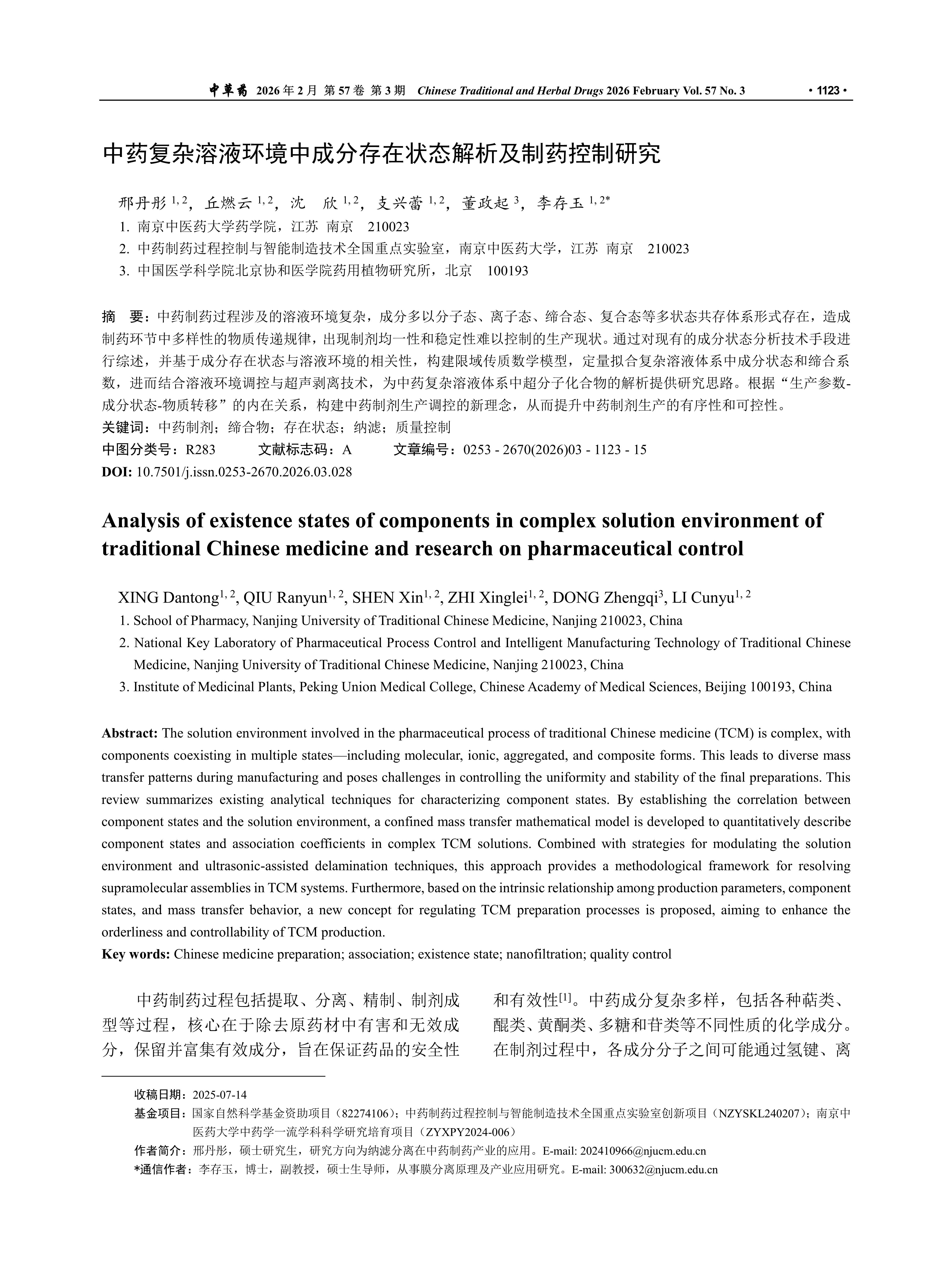 国家自然科学基金资助项目(82274106);中药制药过程控制与智能制造技术全国重点实验室创新项目(NZYSKL240207);南京中医药大学中药学一流学科科学研究培育项目(ZYXPY2024-006)
