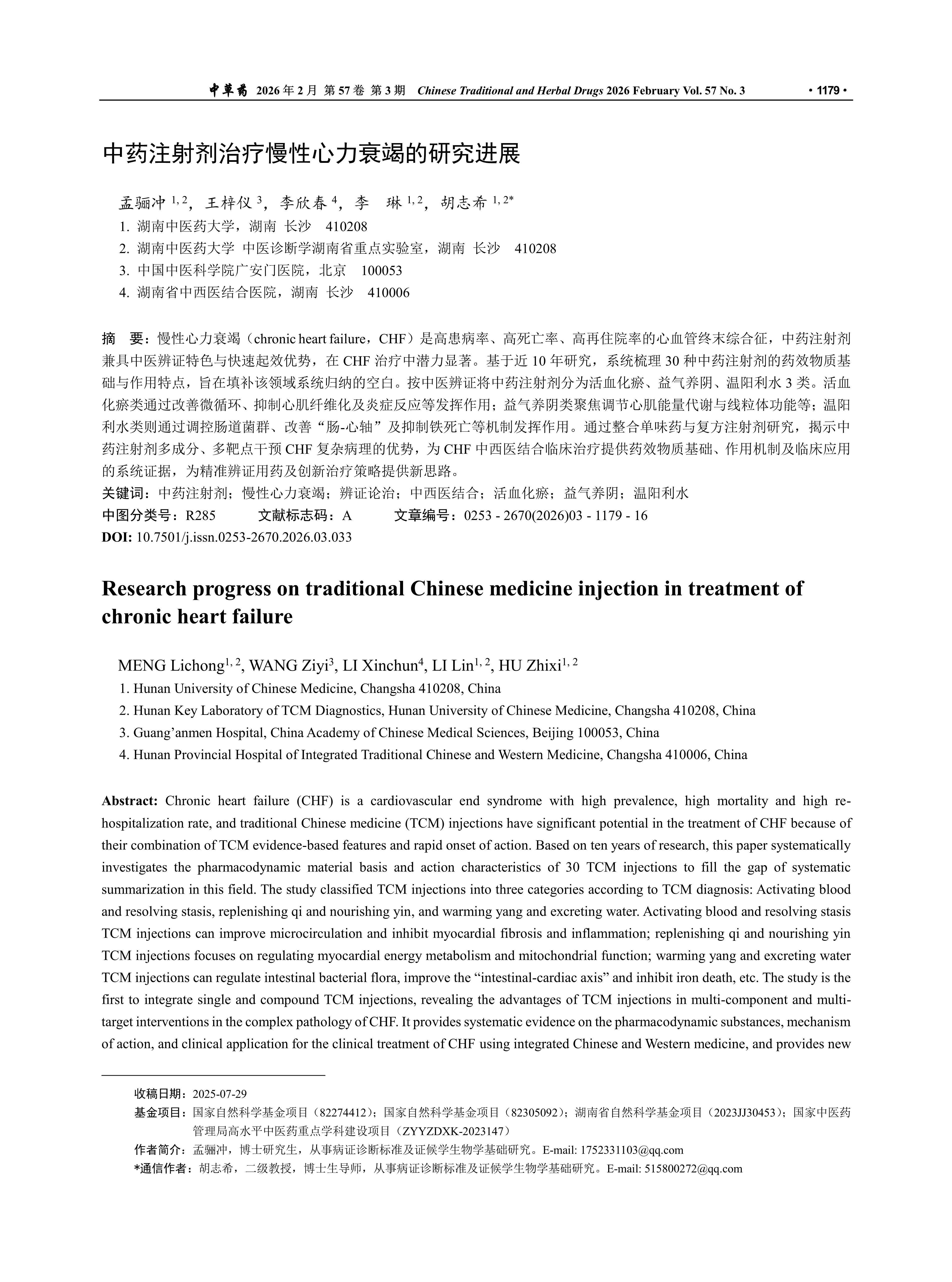 慢性心力衰竭(chronic heart failure,CHF)是高患病率、高死亡率、高再住院率的心血管终末综合征,中药注射剂兼具中医辨证特色与快速起效优势,在CHF治疗中潜力显著。基于近10年研究,系统梳理30种中药注射剂的药效物质基础与作用特点,旨在填补该领域系统归纳的空白。按中医辨证将中药注射剂分为活血化瘀、益气养阴、温阳利水3类。活血化瘀类通过改善微循环、抑制心肌纤维化及炎症反应等发挥作用;益气养阴类聚焦调节心肌能量代谢与线粒体功能等;温阳利水类则通过调控肠道菌群、改善“肠-心轴”及抑制铁死亡等机制发挥作用。通过整合单味药与复方注射剂研究,揭示中药注射剂多成分、多靶点干预CHF复杂病理的优势,为CHF中西医结合临床治疗提供药效物质基础、作用机制及临床应用的系统证据,为精准辨证用药及创新治疗策略提供新思路。