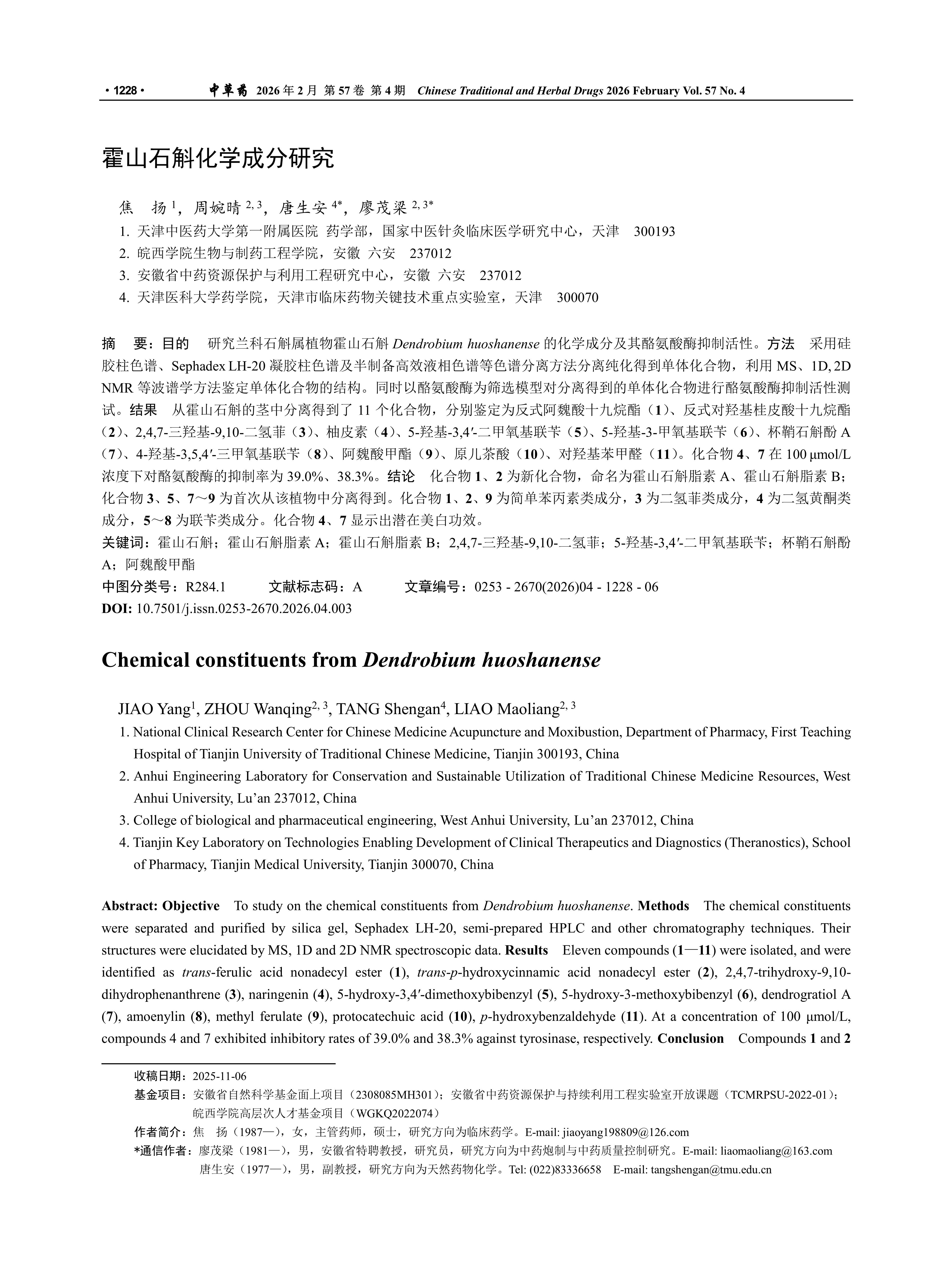 Objective To study on the chemical constituents from Dendrobium huoshanense. Methods The chemical constituents were separated and purified by silica gel, Sephadex LH-20, semi-prepared HPLC and other chromatography techniques. Their structures were elucidated by MS, 1D and 2D NMR spectroscopic data. Results Eleven compounds (1—11) were isolated, and were identified as trans-ferulic acid nonadecyl ester (1), trans-p-hydroxycinnamic acid nonadecyl ester (2), 2,4,7-trihydroxy-9,10-dihydrophenanthrene (3), naringenin (4), 5-hydroxy-3,4′-dimethoxybibenzyl (5), 5-hydroxy-3-methoxybibenzyl (6), dendrogratiol A (7), amoenylin (8), methyl ferulate (9), protocatechuic acid (10), p-hydroxybenzaldehyde (11). At a concentration of 100 μmol/L, compounds 4 and 7 exhibited inhibitory rates of 39.0% and 38.3% against tyrosinase, respectively. Conclusion Compounds 1 and 2 are new compounds, named dendrohuoshanin A and dendrohuoshanin B. Compounds 3, 5, 7—9 were isolated for the first time from this plant. Compound 3 was the first to be separated and purified through phytochemical methods from this plant. Compounds 1, 2, and 9 belong to simple phenylpropanoids, compound 3 is a dihydrophenanthrene, compound 4 is a dihydroflavone, and compounds 5—8 are bibenzyls. Compounds 4 and 7 show potential skin-whitening effects.
