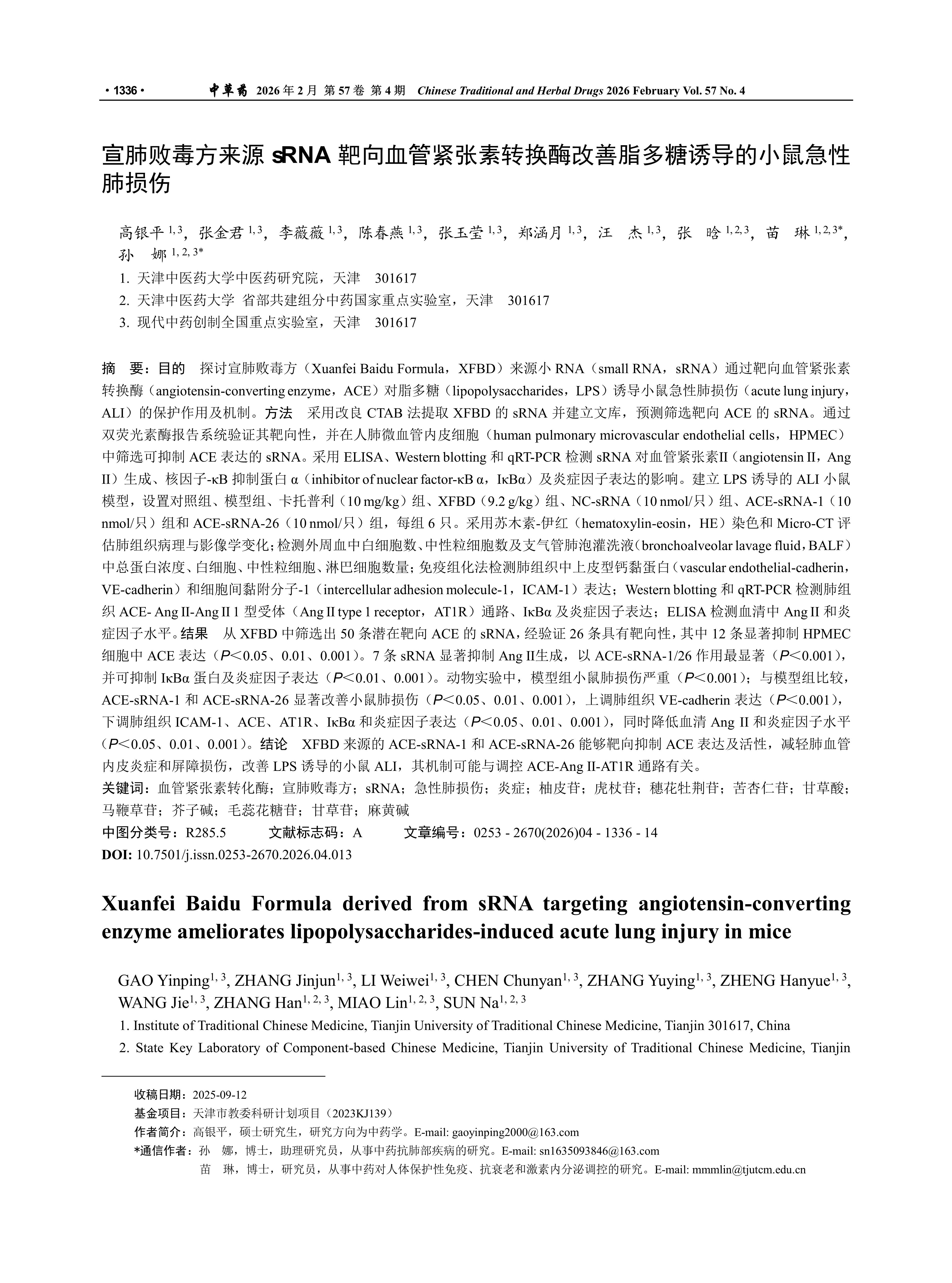 目的 探讨宣肺败毒方(Xuanfei Baidu Formula,XFBD)来源小RNA(small RNA,sRNA)通过靶向血管紧张素转换酶(angiotensin-converting enzyme,ACE)对脂多糖(lipopolysaccharides,LPS)诱导小鼠急性肺损伤(acute lung injury,ALI)的保护作用及机制。方法 采用改良CTAB法提取XFBD的sRNA并建立文库,预测筛选靶向ACE的sRNA。通过双荧光素酶报告系统验证其靶向性,并在人肺微血管内皮细胞(human pulmonary microvascular endothelial cells,HPMEC)中筛选可抑制ACE表达的sRNA。采用ELISA、Western blotting和qRT-PCR检测sRNA对血管紧张素Ⅱ(angiotensin Ⅱ,AngⅡ)生成、核因子-κB抑制蛋白α(inhibitor of nuclear factor-κB α,IκBα)及炎症因子表达的影响。建立LPS诱导的ALI小鼠模型,设置对照组、模型组、卡托普利(10 mg/kg)组、XFBD(9.2 g/kg)组、NC-sRNA(10 nmol/只)组、ACE-sRNA-1(10 nmol/只)组和ACE-sRNA-26(10 nmol/只)组,每组6只。采用苏木素-伊红(hematoxylin-eosin,HE)染色和Micro-CT评估肺组织病理与影像学变化;检测外周血中白细胞数、中性粒细胞数及支气管肺泡灌洗液(bronchoalveolar lavage fluid,BALF)中总蛋白浓度、白细胞、中性粒细胞、淋巴细胞数量;免疫组化法检测肺组织中上皮型钙黏蛋白(vascular endothelial-cadherin,VE-cadherin)和细胞间黏附分子-1(intercellular adhesion molecule-1,ICAM-1)表达;Western blotting和qRT-PCR检测肺组织ACE- Ang Ⅱ-Ang Ⅱ 1型受体(AngⅡ type 1 receptor,AT1R)通路、IκBα及炎症因子表达;ELISA检测血清中Ang II和炎症因子水平。结果 从XFBD中筛选出50条潜在靶向ACE的sRNA,经验证26条具有靶向性,其中12条显著抑制HPMEC细胞中ACE表达(P<0.05、0.01、0.001)。7条sRNA显著抑制Ang Ⅱ生成,以ACE-sRNA-1/26作用最显著(P<0.001),并可抑制IκBα蛋白及炎症因子表达(P<0.01、0.001)。动物实验中,模型组小鼠肺损伤严重(P<0.001);与模型组比较,ACE-sRNA-1和ACE-sRNA-26显著改善小鼠肺损伤(P<0.05、0.01、0.001),上调肺组织VE-cadherin表达(P<0.001),下调肺组织ICAM-1、ACE、AT1R、IκBα和炎症因子表达(P<0.05、0.01、0.001),同时降低血清Ang II和炎症因子水平(P<0.05、0.01、0.001)。结论 XFBD来源的ACE-sRNA-1和ACE-sRNA-26能够靶向抑制ACE表达及活性,减轻肺血管内皮炎症和屏障损伤,改善LPS诱导的小鼠ALI,其机制可能与调控ACE-Ang Ⅱ-AT1R通路有关。