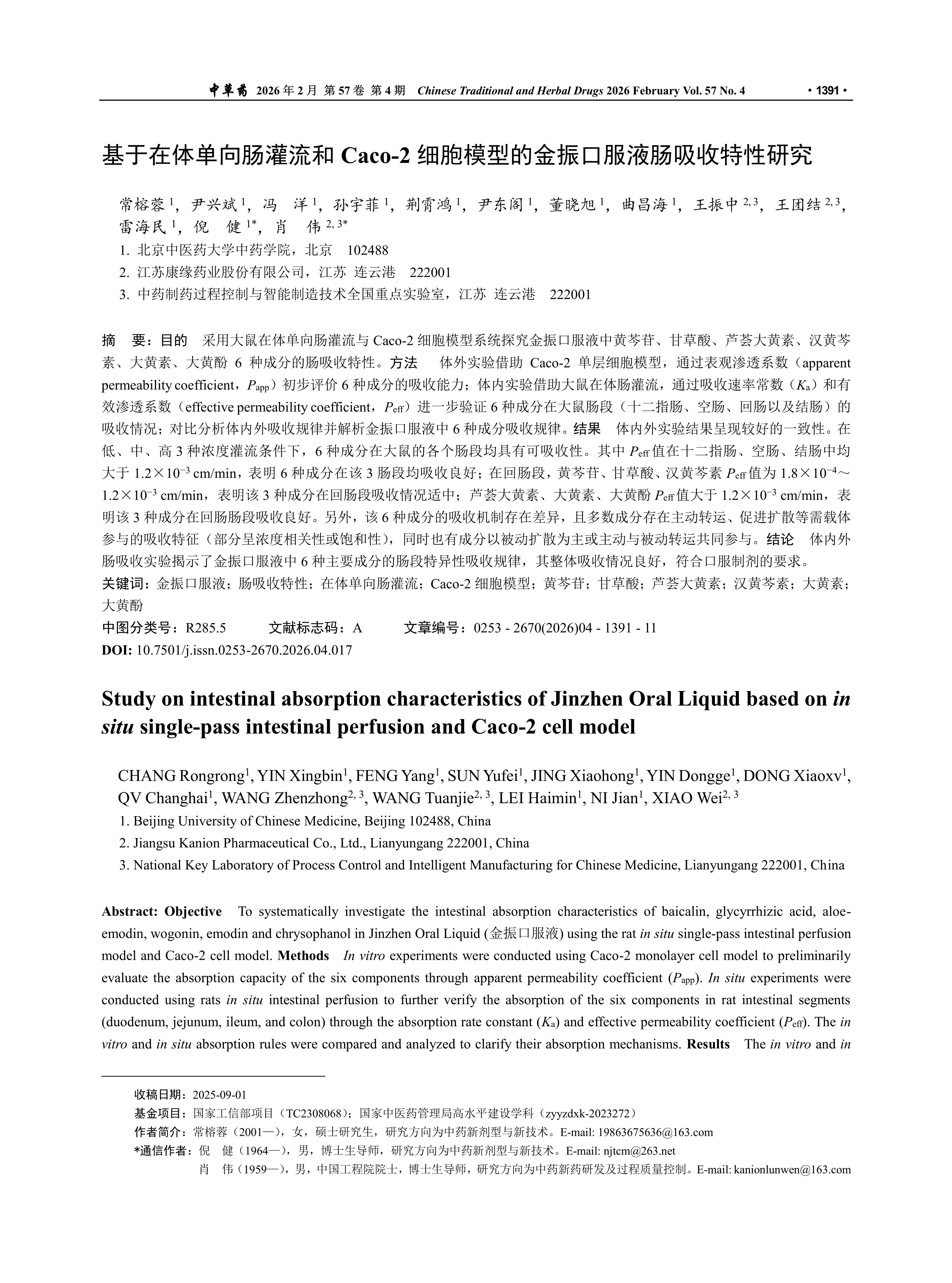 基于在体单向肠灌流和Caco-2细胞模型的金振口服液肠吸收特性研究