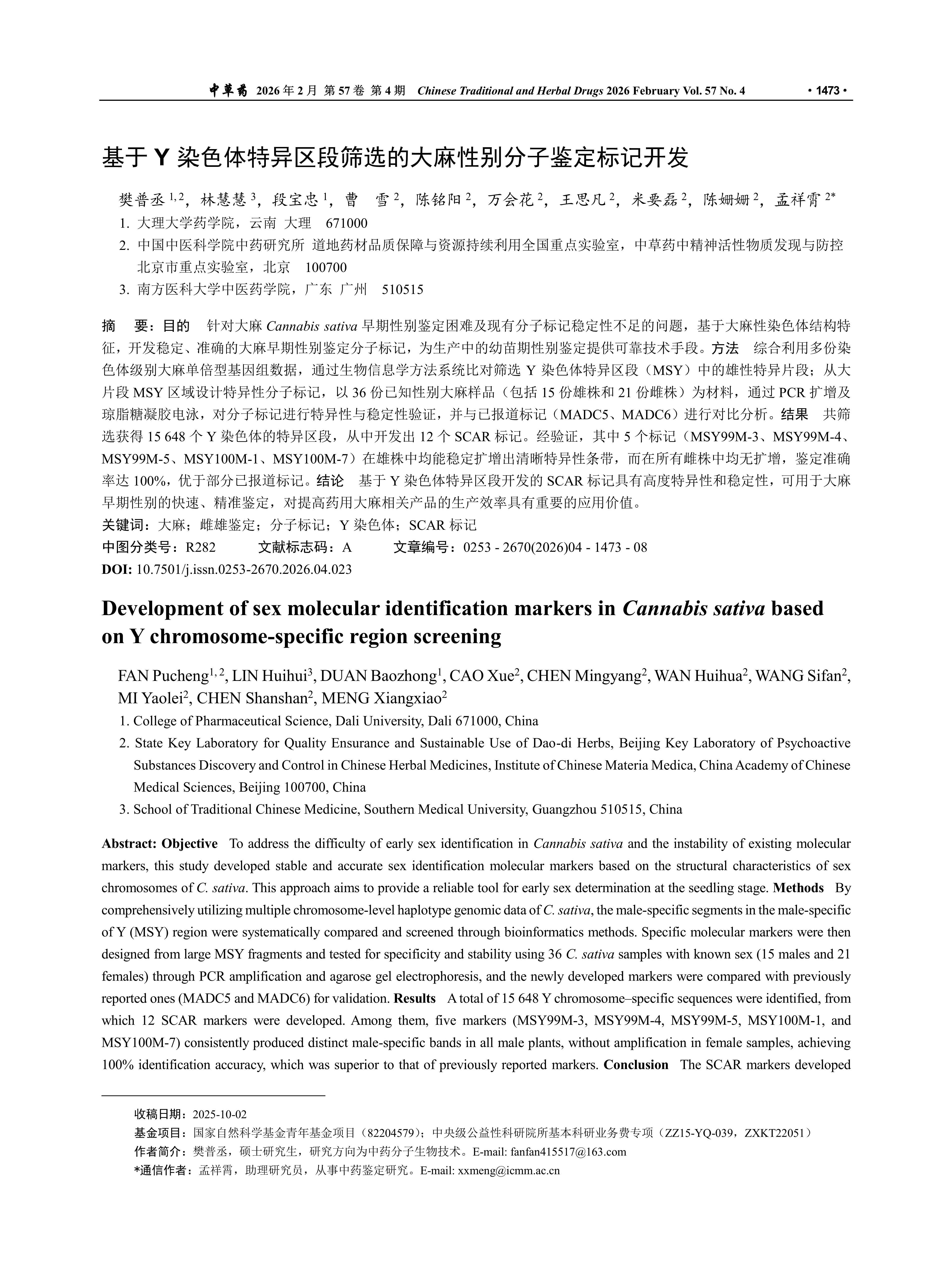 Development of sex molecular identification markers in Cannabis sativa based on Y chromosome-specific region screening