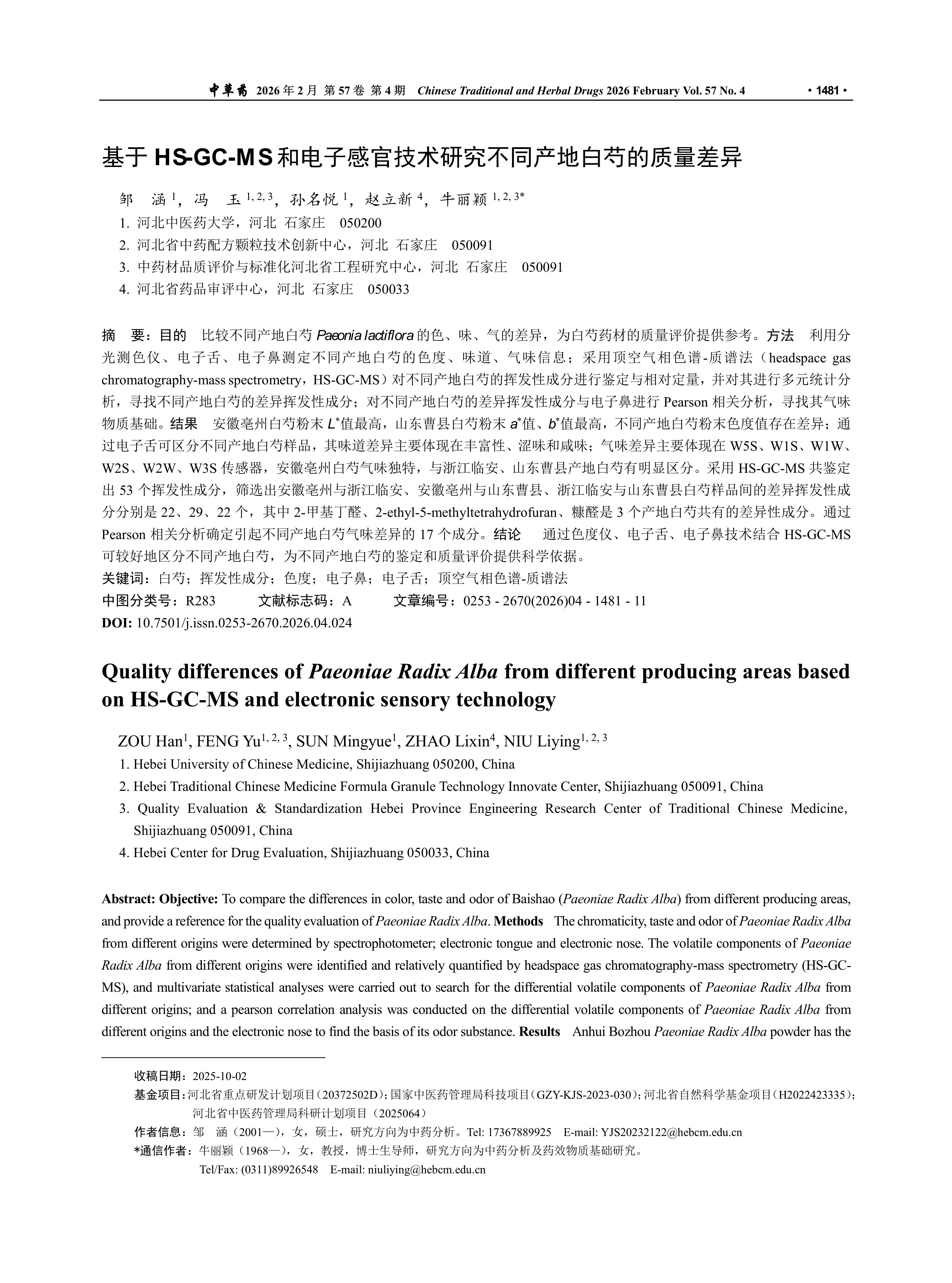 目的 比较不同产地白芍Paeonia lactiflora的色、味、气的差异,为白芍药材的质量评价提供参考。方法 利用分光测色仪、电子舌、电子鼻测定不同产地白芍的色度、味道、气味信息;采用顶空气相色谱-质谱法(headspace gas chromatography-mass spectrometry,HS-GC-MS)对不同产地白芍的挥发性成分进行鉴定与相对定量,并对其进行多元统计分析,寻找不同产地白芍的差异挥发性成分;对不同产地白芍的差异挥发性成分与电子鼻进行Pearson相关分析,寻找其气味物质基础。结果 安徽亳州白芍粉末L*值最高,山东曹县白芍粉末a*值、b*值最高,不同产地白芍粉末色度值存在差异;通过电子舌可区分不同产地白芍样品,其味道差异主要体现在丰富性、涩味和咸味;气味差异主要体现在W5S、W1S、W1W、W2S、W2W、W3S传感器,安徽亳州白芍气味独特,与浙江临安、山东曹县产地白芍有明显区分。采用HS-GC-MS共鉴定出53个挥发性成分,筛选出安徽亳州与浙江临安、安徽亳州与山东曹县、浙江临安与山东曹县白芍样品间的差异挥发性成分分别是22、29、22个,其中2-甲基丁醛、2-ethyl-5-methyltetrahydrofuran、糠醛是3个产地白芍共有的差异性成分。通过Pearson相关分析确定引起不同产地白芍气味差异的17个成分。结论 通过色度仪、电子舌、电子鼻技术结合HS-GC-MS可较好地区分不同产地白芍,为不同产地白芍的鉴定和质量评价提供科学依据。