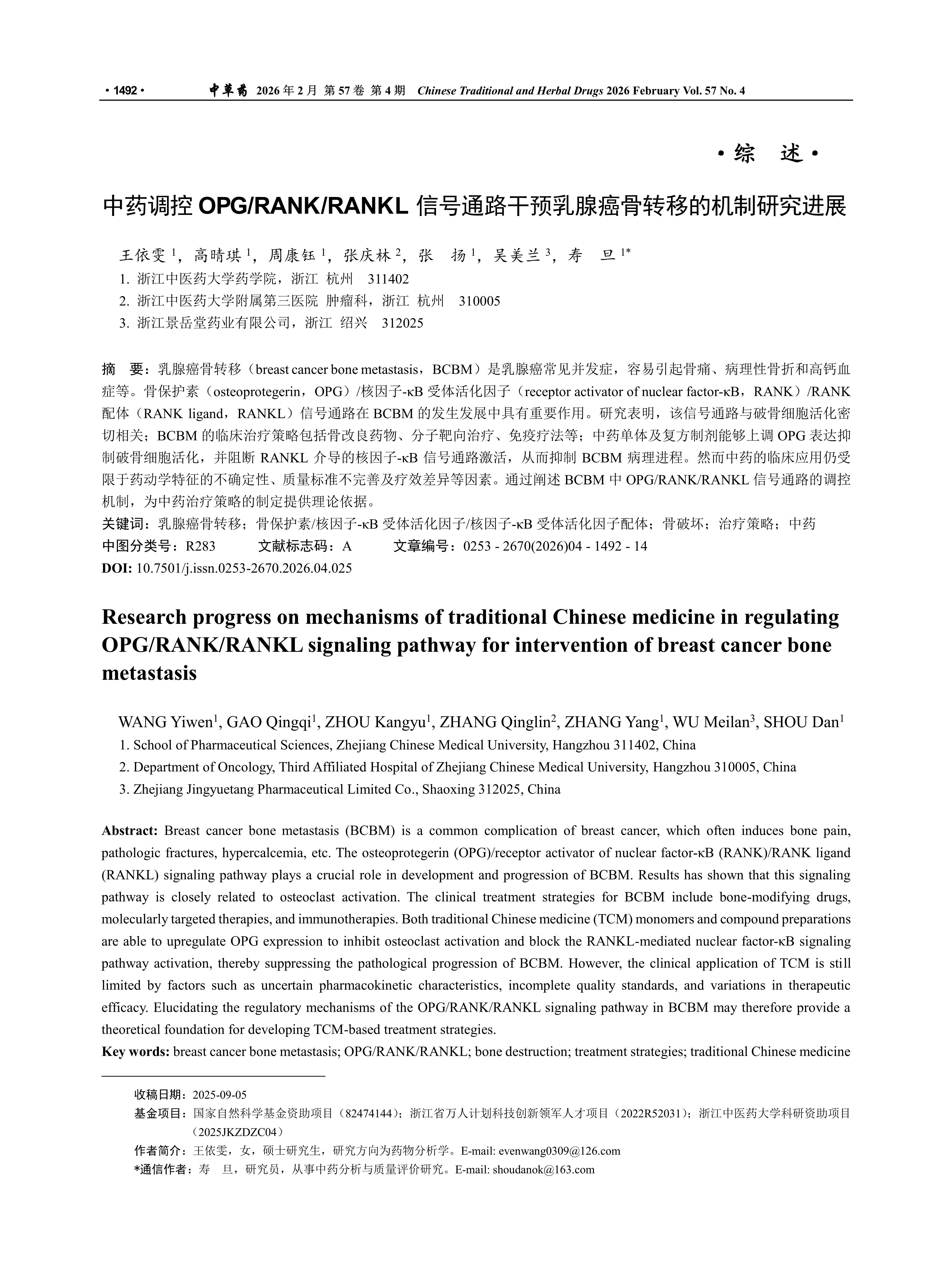 中药调控OPG/RANK/RANKL信号通路干预乳腺癌骨转移的机制研究进展