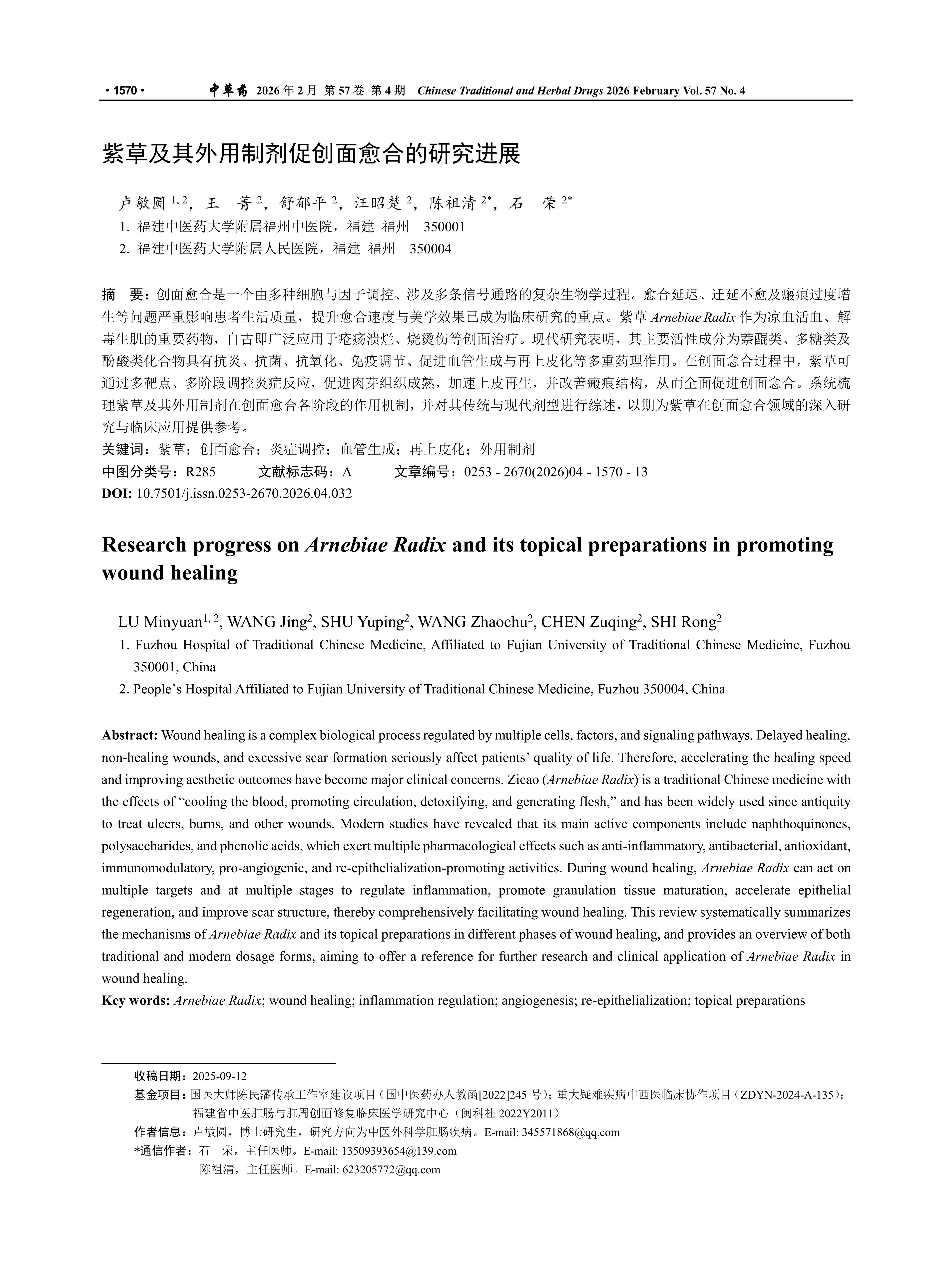 创面愈合是一个由多种细胞与因子调控、涉及多条信号通路的复杂生物学过程。愈合延迟、迁延不愈及瘢痕过度增生等问题严重影响患者生活质量,提升愈合速度与美学效果已成为临床研究的重点。紫草Arnebiae Radix作为凉血活血、解毒生肌的重要药物,自古即广泛应用于疮疡溃烂、烧烫伤等创面治疗。现代研究表明,其主要活性成分为萘醌类、多糖类及酚酸类化合物具有抗炎、抗菌、抗氧化、免疫调节、促进血管生成与再上皮化等多重药理作用。在创面愈合过程中,紫草可通过多靶点、多阶段调控炎症反应,促进肉芽组织成熟,加速上皮再生,并改善瘢痕结构,从而全面促进创面愈合。系统梳理紫草及其外用制剂在创面愈合各阶段的作用机制,并对其传统与现代剂型进行综述,以期为紫草在创面愈合领域的深入研究与临床应用提供参考。