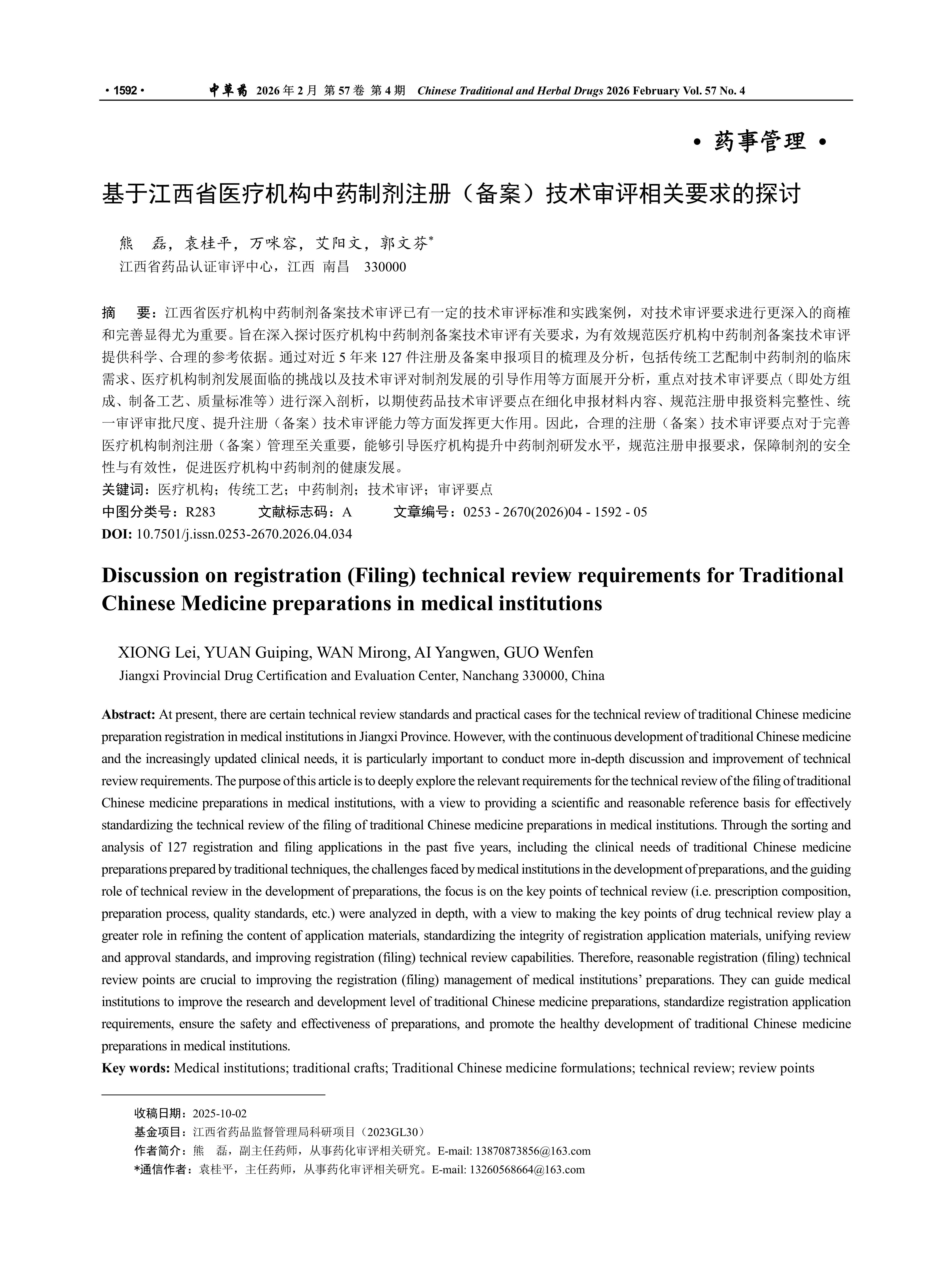 At present, there are certain technical review standards and practical cases for the technical review of traditional Chinese medicine preparation registration in medical institutions in Jiangxi Province. However, with the continuous development of traditional Chinese medicine and the increasingly updated clinical needs, it is particularly important to conduct more in-depth discussion and improvement of technical review requirements. The purpose of this article is to deeply explore the relevant requirements for the technical review of the filing of traditional Chinese medicine preparations in medical institutions, with a view to providing a scientific and reasonable reference basis for effectively standardizing the technical review of the filing of traditional Chinese medicine preparations in medical institutions. Through the sorting and analysis of 127 registration and filing applications in the past five years, including the clinical needs of traditional Chinese medicine preparations prepared by traditional techniques, the challenges faced by medical institutions in the development of preparations, and the guiding role of technical review in the development of preparations, the focus is on the key points of technical review (i.e. prescription composition, preparation process, quality standards, etc.) were analyzed in depth, with a view to making the key points of drug technical review play a greater role in refining the content of application materials, standardizing the integrity of registration application materials, unifying review and approval standards, and improving registration (filing) technical review capabilities. Therefore, reasonable registration (filing) technical review points are crucial to improving the registration (filing) management of medical institutions’ preparations. They can guide medical institutions to improve the research and development level of traditional Chinese medicine preparations, standardize registration application requirements, ensure the safety and effectiveness of preparations, and promote the healthy development of traditional Chinese medicine preparations in medical institutions.