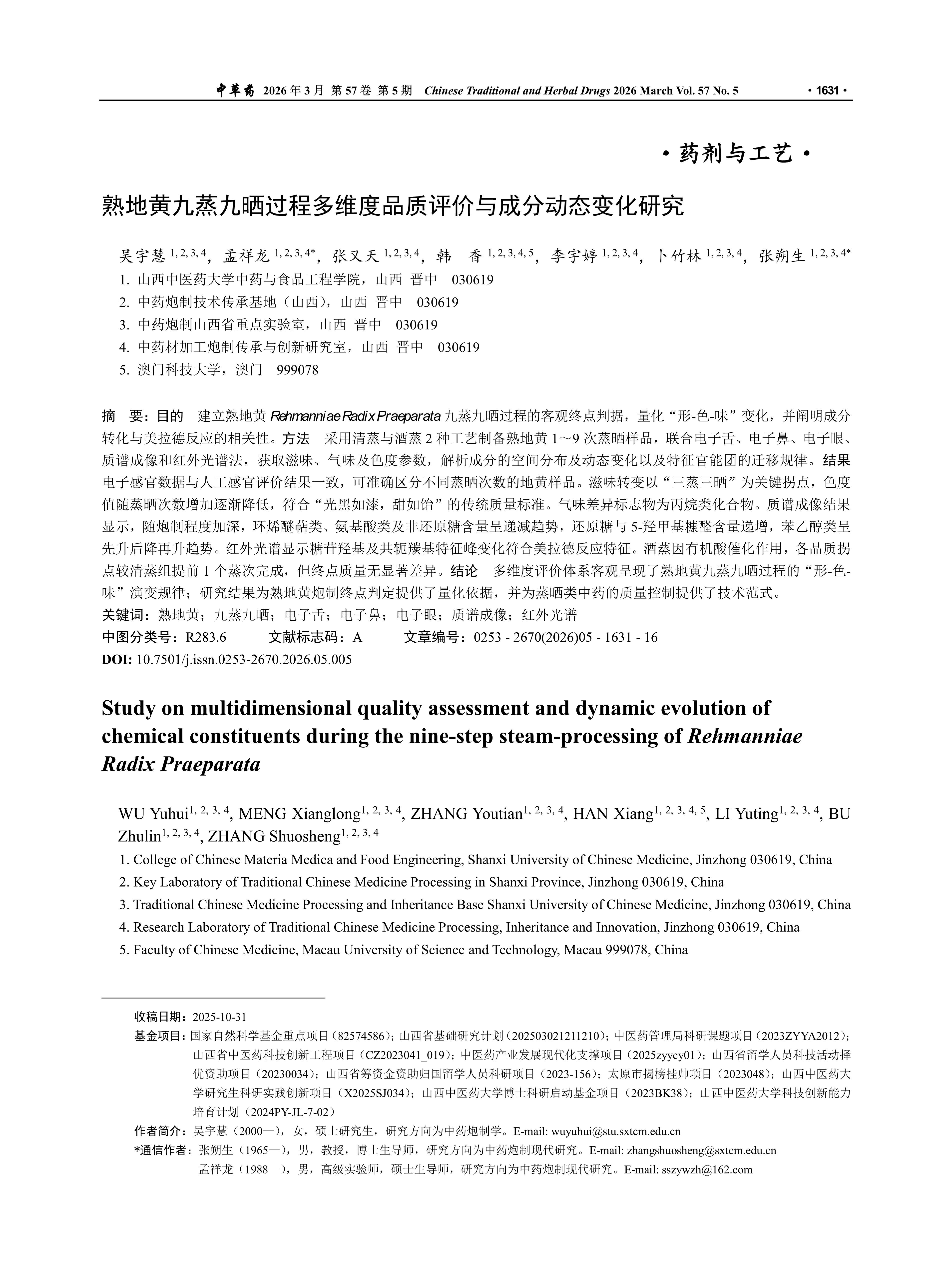 目的 建立熟地黄Rehmanniae Radix Praeparata九蒸九晒过程的客观终点判据,量化“形-色-味”变化,并阐明成分转化与美拉德反应的相关性。方法 采用清蒸与酒蒸2种工艺制备熟地黄1~9次蒸晒样品,联合电子舌、电子鼻、电子眼、质谱成像和红外光谱法,获取滋味、气味及色度参数,解析成分的空间分布及动态变化以及特征官能团的迁移规律。结果 电子感官数据与人工感官评价结果一致,可准确区分不同蒸晒次数的地黄样品。滋味转变以“三蒸三晒”为关键拐点,色度值随蒸晒次数增加逐渐降低,符合“光黑如漆,甜如饴”的传统质量标准。气味差异标志物为丙烷类化合物。质谱成像结果显示,随炮制程度加深,环烯醚萜类、氨基酸类及非还原糖含量呈递减趋势,还原糖与5-羟甲基糠醛含量递增,苯乙醇类呈先升后降再升趋势。红外光谱显示糖苷羟基及共轭羰基特征峰变化符合美拉德反应特征。酒蒸因有机酸催化作用,各品质拐点较清蒸组提前1个蒸次完成,但终点质量无显著差异。结论 多维度评价体系客观呈现了熟地黄九蒸九晒过程的“形-色-味”演变规律;研究结果为熟地黄炮制终点判定提供了量化依据,并为蒸晒类中药的质量控制提供了技术范式。