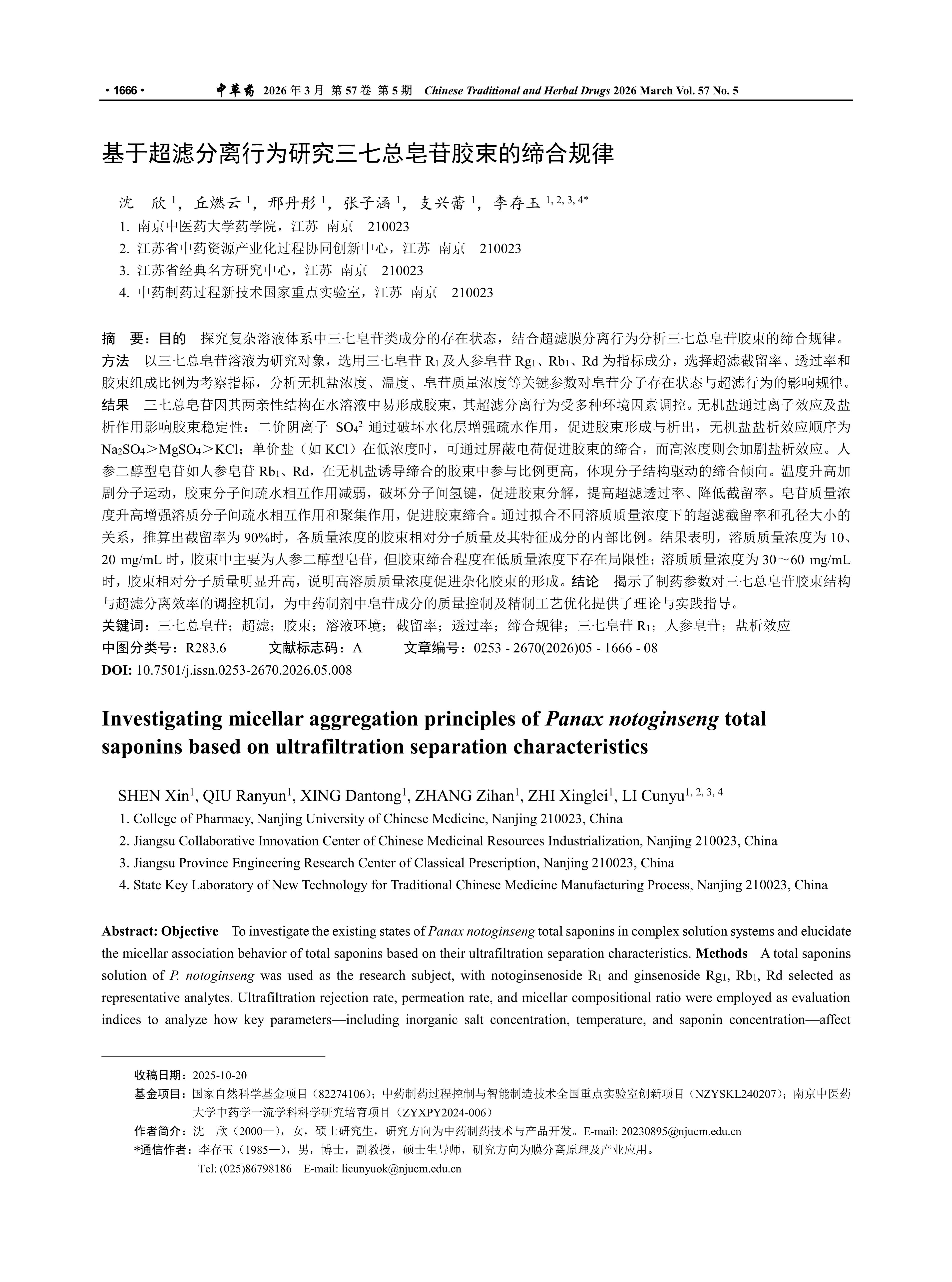 目的 探究复杂溶液体系中三七皂苷类成分的存在状态,结合超滤膜分离行为分析三七总皂苷胶束的缔合规律。方法 以三七总皂苷溶液为研究对象,选用三七皂苷R1及人参皂苷Rg1、Rb1、Rd为指标成分,选择超滤截留率、透过率和胶束组成比例为考察指标,分析无机盐浓度、温度、皂苷质量浓度等关键参数对皂苷分子存在状态与超滤行为的影响规律。结果 三七总皂苷因其两亲性结构在水溶液中易形成胶束,其超滤分离行为受多种环境因素调控。无机盐通过离子效应及盐析作用影响胶束稳定性:二价阴离子SO42-通过破坏水化层增强疏水作用,促进胶束形成与析出,无机盐盐析效应顺序为Na2SO4>MgSO4>KCl;单价盐(如KCl)在低浓度时,可通过屏蔽电荷促进胶束的缔合,而高浓度则会加剧盐析效应。人参二醇型皂苷如人参皂苷Rb1、Rd,在无机盐诱导缔合的胶束中参与比例更高,体现分子结构驱动的缔合倾向。温度升高加剧分子运动,胶束分子间疏水相互作用减弱,破坏分子间氢键,促进胶束分解,提高超滤透过率、降低截留率。皂苷质量浓度升高增强溶质分子间疏水相互作用和聚集作用,促进胶束缔合。通过拟合不同溶质质量浓度下的超滤截留率和孔径大小的关系,推算出截留率为90%时,各质量浓度的胶束相对分子质量及其特征成分的内部比例。结果表明,溶质质量浓度为10、20 mg/mL时,胶束中主要为人参二醇型皂苷,但胶束缔合程度在低质量浓度下存在局限性;溶质质量浓度为30~60 mg/mL时,胶束相对分子质量明显升高,说明高溶质质量浓度促进杂化胶束的形成。结论 揭示了制药参数对三七总皂苷胶束结构与超滤分离效率的调控机制,为中药制剂中皂苷成分的质量控制及精制工艺优化提供了理论与实践指导。