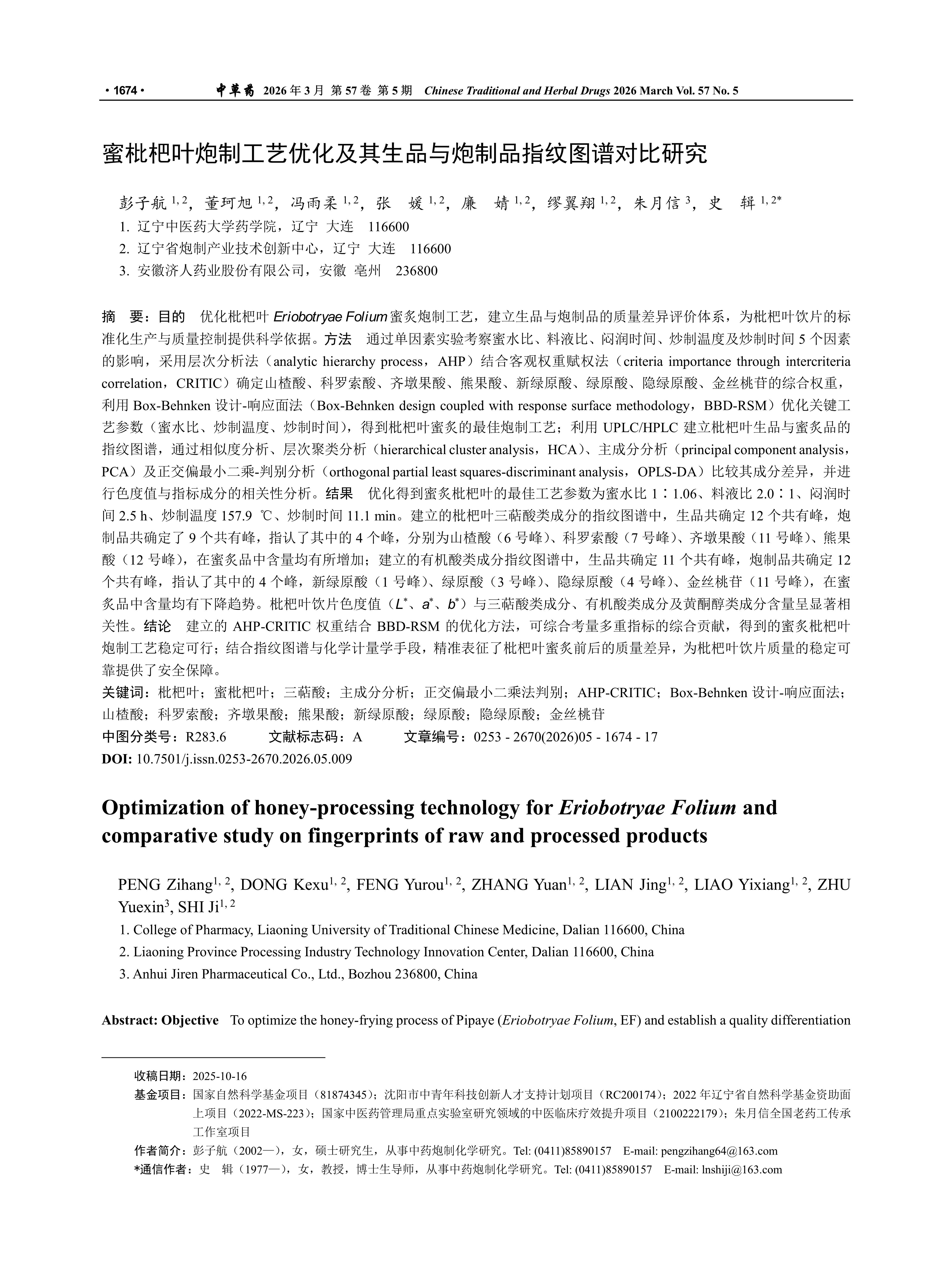 Objective To optimize the honey-frying process of Pipaye (Eriobotryae Folium, EF) and establish a quality differentiation system between raw and processed products, providing scientific evidence for standardized production and quality control of honey-fried EF. Methods The effects of five factors-honey-to-water ratio, solid-to-liquid ratio, moistening time, stir-frying temperature, and stir-frying duration were investigated through single-factor experiments. The comprehensive weights of maslinic acid, corosolic acid, oleanolic acid, ursolic acid, neochlorogenic acid, chlorogenic acid, cryptochlorogenic acid, and hyperoside were determined using the analytic hierarchy process (AHP) combined with the criteria importance through intercriteria correlation (CRITIC) objective weighting method. Key process parameters (honey-to-water ratio, stir-frying temperature, and stir-frying duration) were optimized via Box-Behnken design coupled with response surface methodology (BBD-RSM) to establish the optimal honey-processing conditions for EF. Ultra-performance liquid chromatography/high-performance liquid chromatography (UPLC/HPLC) was employed to develop fingerprint profiles of raw and honey-processed EF. Component differences were compared using similarity analysis, hierarchical cluster analysis (HCA), principal component analysis (PCA), and orthogonal partial least squares-discriminant analysis (OPLS-DA). Additionally, correlation analysis between colorimetric values and indicator components was conducted. Results The optimized honey-processing parameters for EF were determined as follows: honey-to-water ratio of 1:1.06, solid-to-liquid ratio of 2.0:1, moistening time of 2.5 h, stir-frying temperature of 157.9 ℃, and stir-frying duration of 11.1 min. In the established fingerprint profile of triterpenic acids in EF, 12 common peaks were identified in the raw products, while nine common peaks were identified in the processed products. Among these, four peaks were assigned as maslinic acid (peak 6), corosolic acid (peak 7), oleanolic acid (peak 11), and ursolic acid (peak 12), all of which showed increased content after honey-processing. In the fingerprint profile of organic acids, 11 common peaks were identified in the raw products, and 12 common peaks were found in the processed products. Four of these peaks were identified as neochlorogenic acid (peak 1), chlorogenic acid (peak 3), cryptochlorogenic acid (peak 4), and hyperoside (peak 11)-all of which decreased in content after honey-processing. The colorimetric values (L*, a*, b*) of the honey-processed loquat slices showed a significant positive correlation with the content of triterpenic acids, and a significant negative correlation with the content of organic acids and flavonol glycosides. Conclusion The AHP-CRITIC weighting method combined with BBD-RSM can effectively balance multiple indicators. The honey-frying process for EF is stable and feasible. Integrating fingerprints with chemometric methods precisely characterizes quality changes before and after processing, offering evidence for enhanced quality control standards.