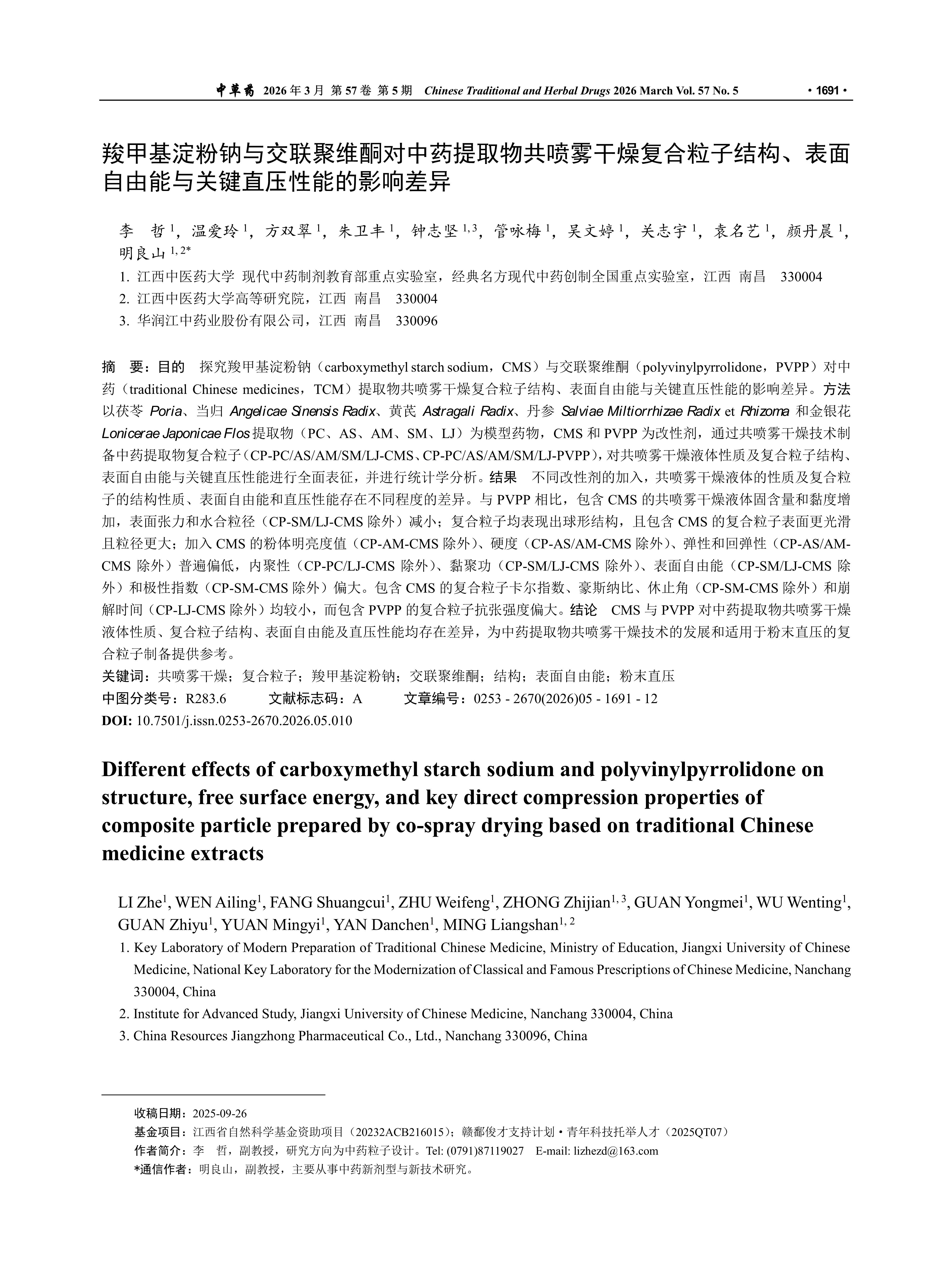羧甲基淀粉钠与交联聚维酮对中药提取物共喷雾干燥复合粒子结构、表面自由能与关键直压性能的影响差异